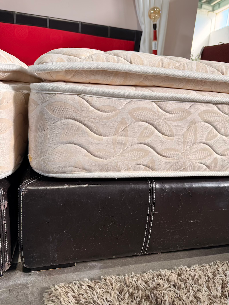 Two single bases with mattresses sold together with matching bedside tables. A practical and complete bedroom solution, ideal for a main or guest bedroom. All pieces are in good condition.