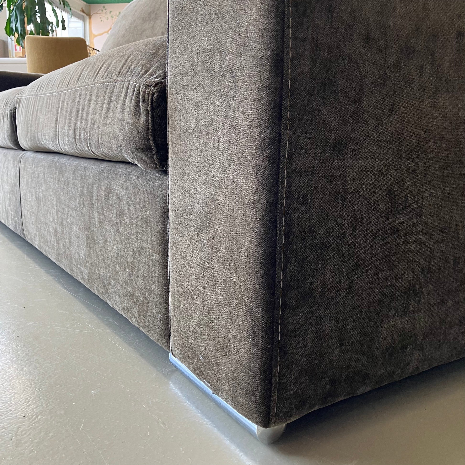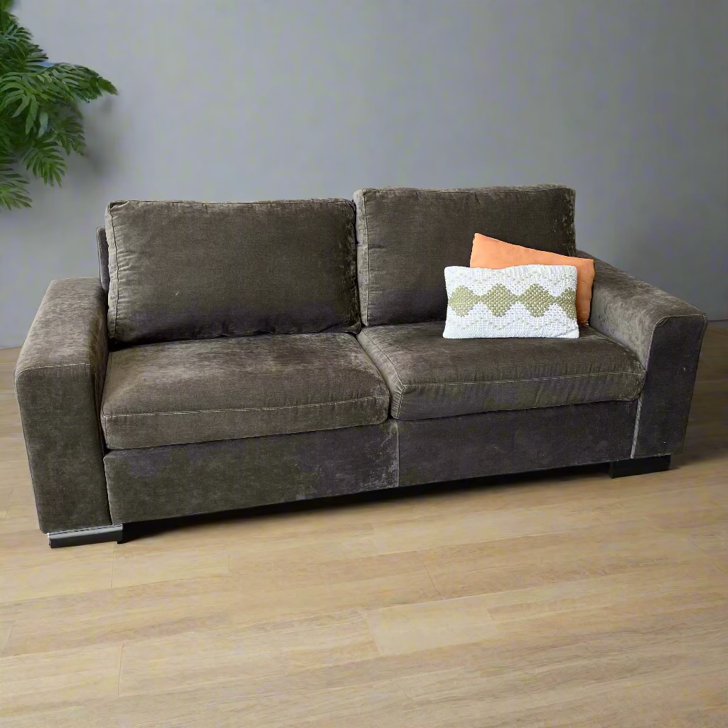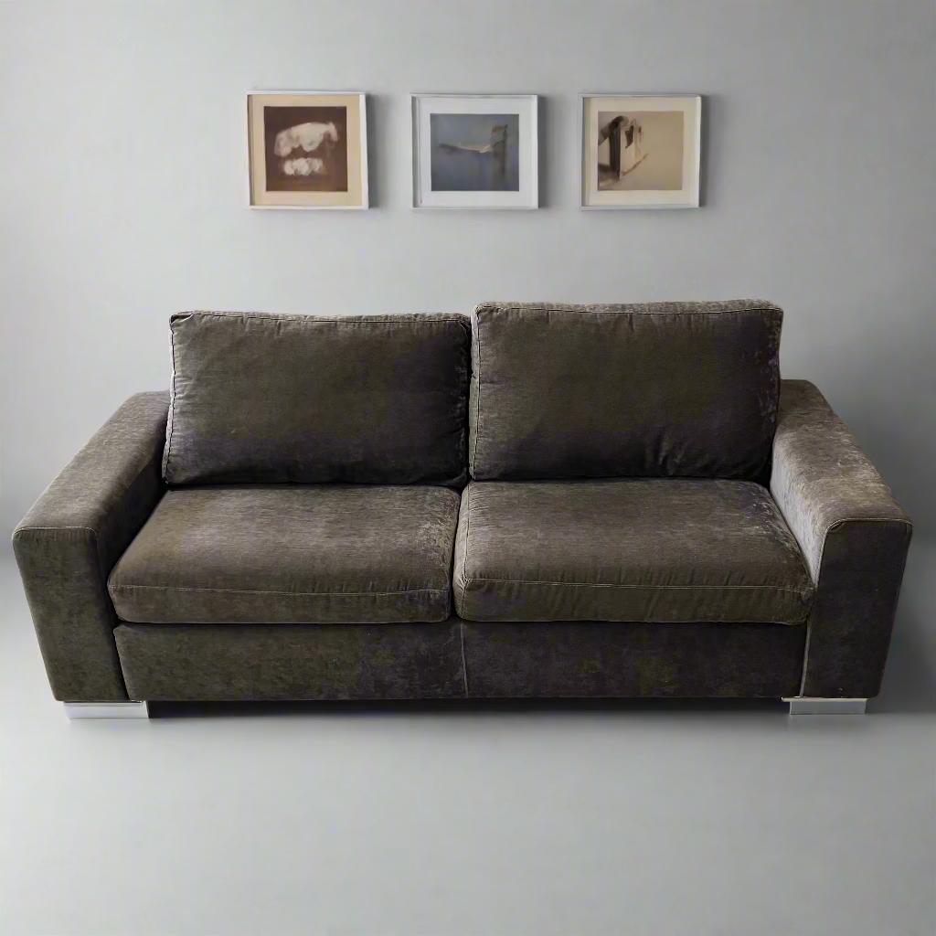 Three-seater sofa in a versatile mid-grey / brown fabric. Featuring clean lines, plush back cushions, and slightly flared arms