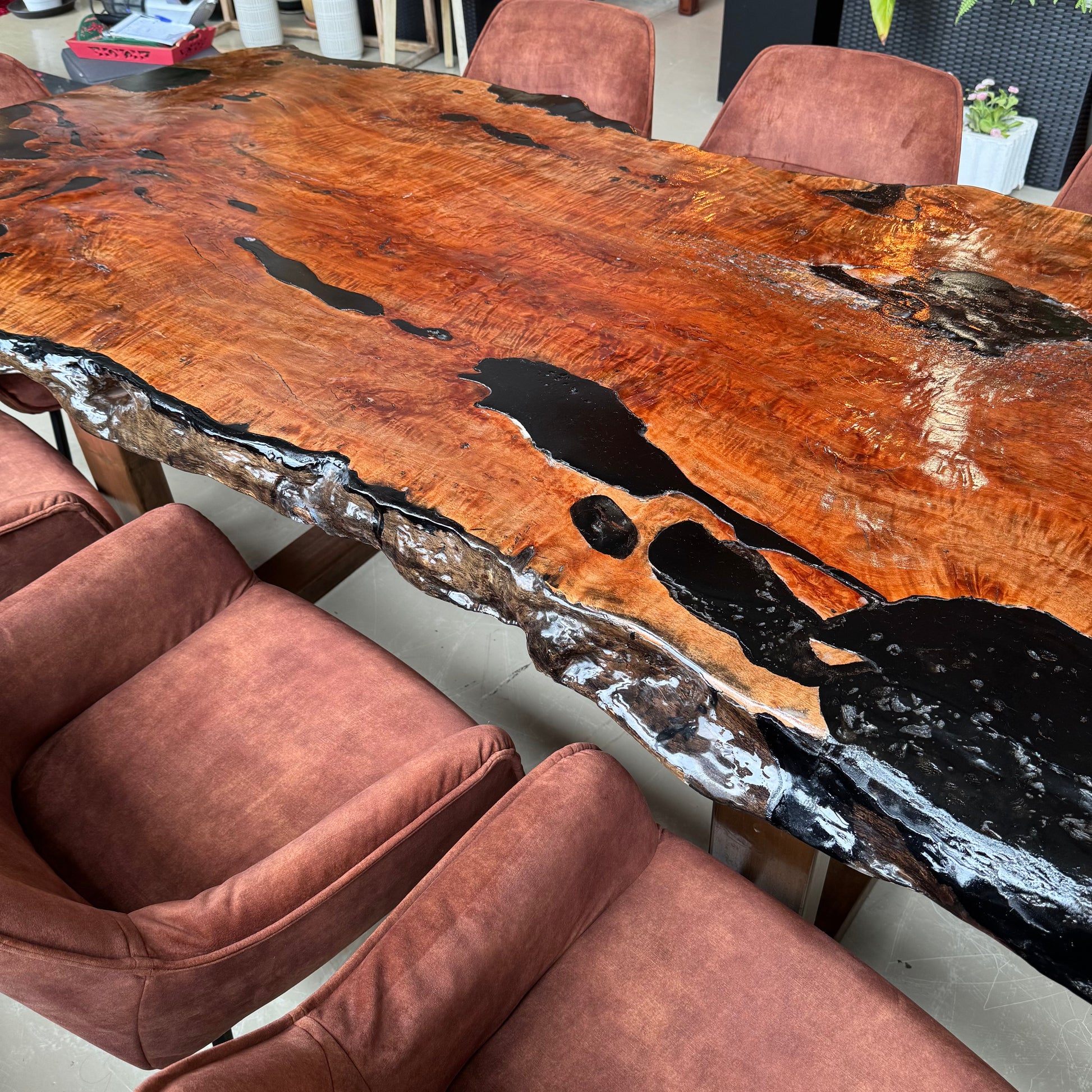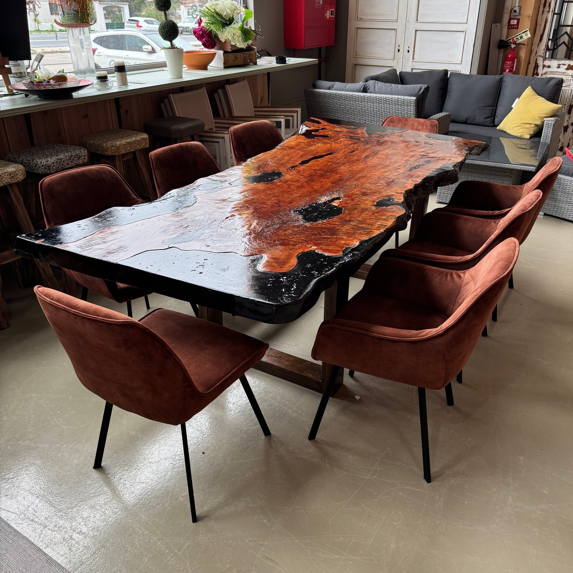 Stunning live-edge solid wood dining table with a high-gloss finish, plus six brown velvet matching chairs and two armchairs. A true statement set that brings warmth and character to any space.