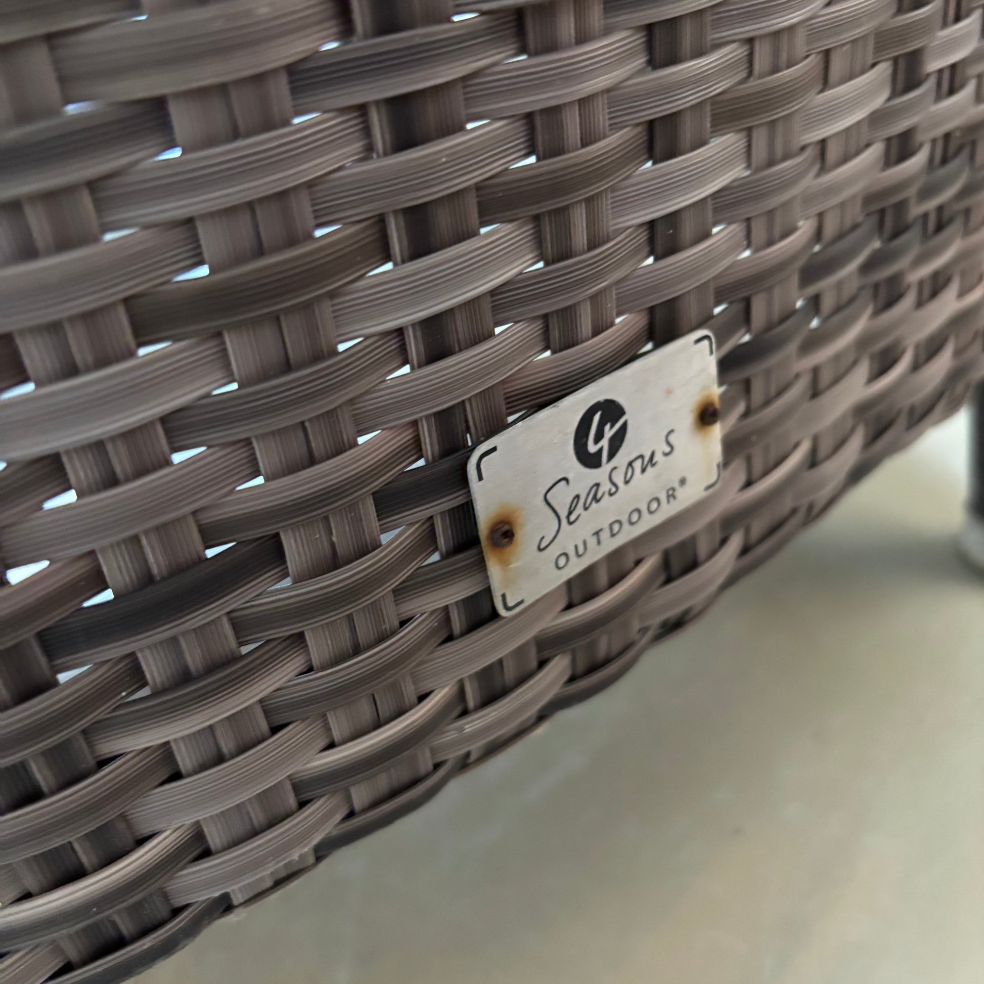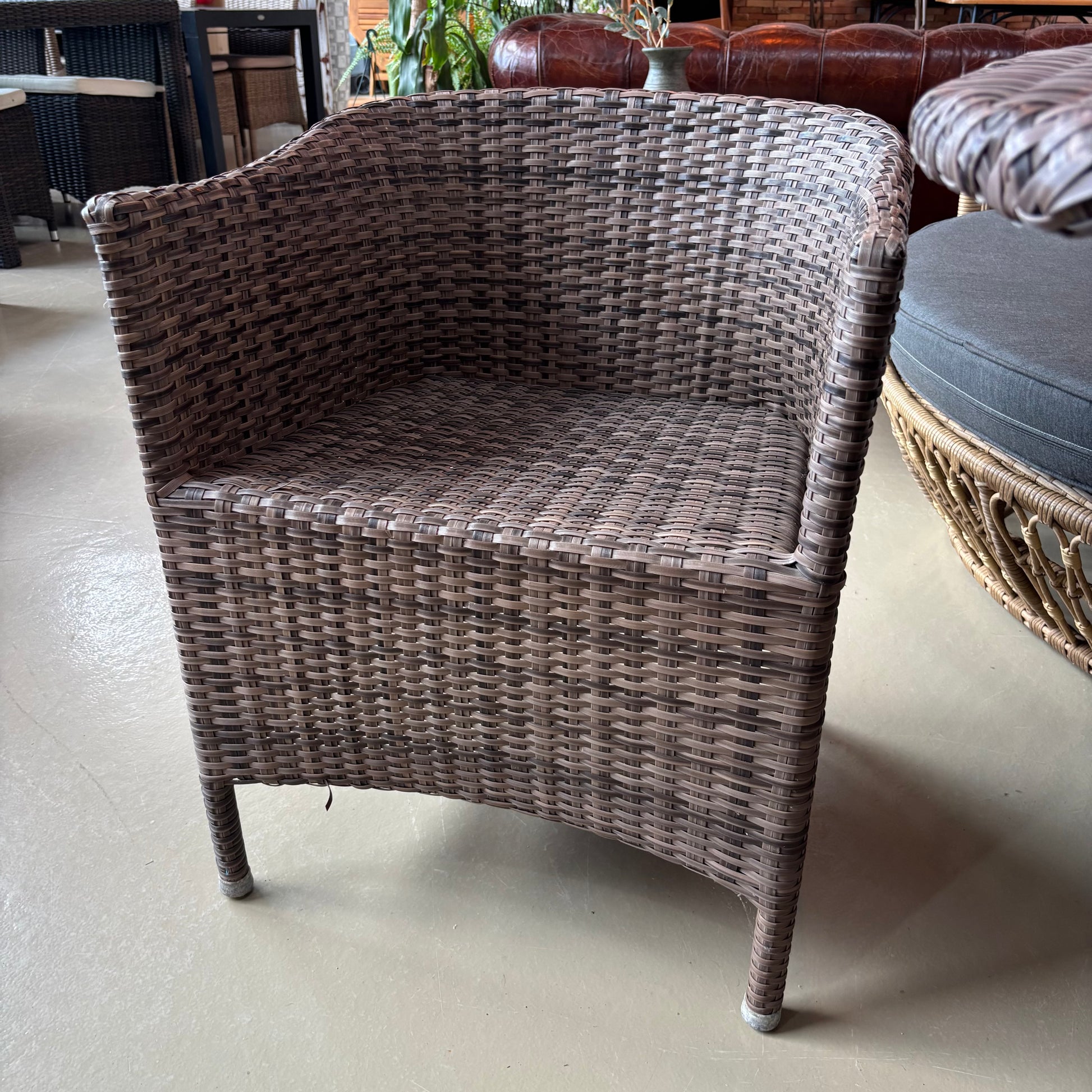 Stylish rattan outdoor table with matching chairs - perfect for garden dining.
