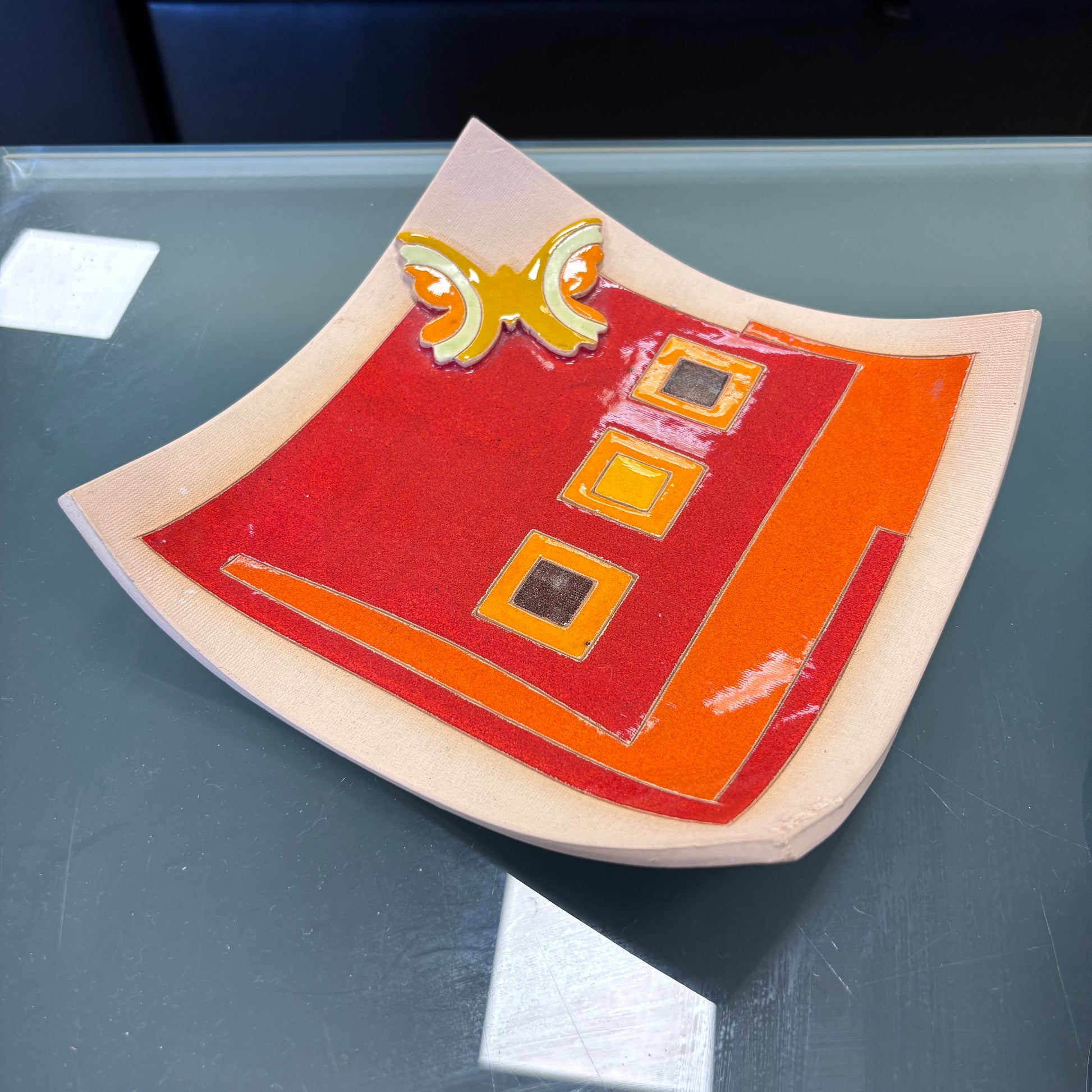 Colourful decorative tray with geometric pattern. Great as a catch-all, tabletop accent, or wall décor.