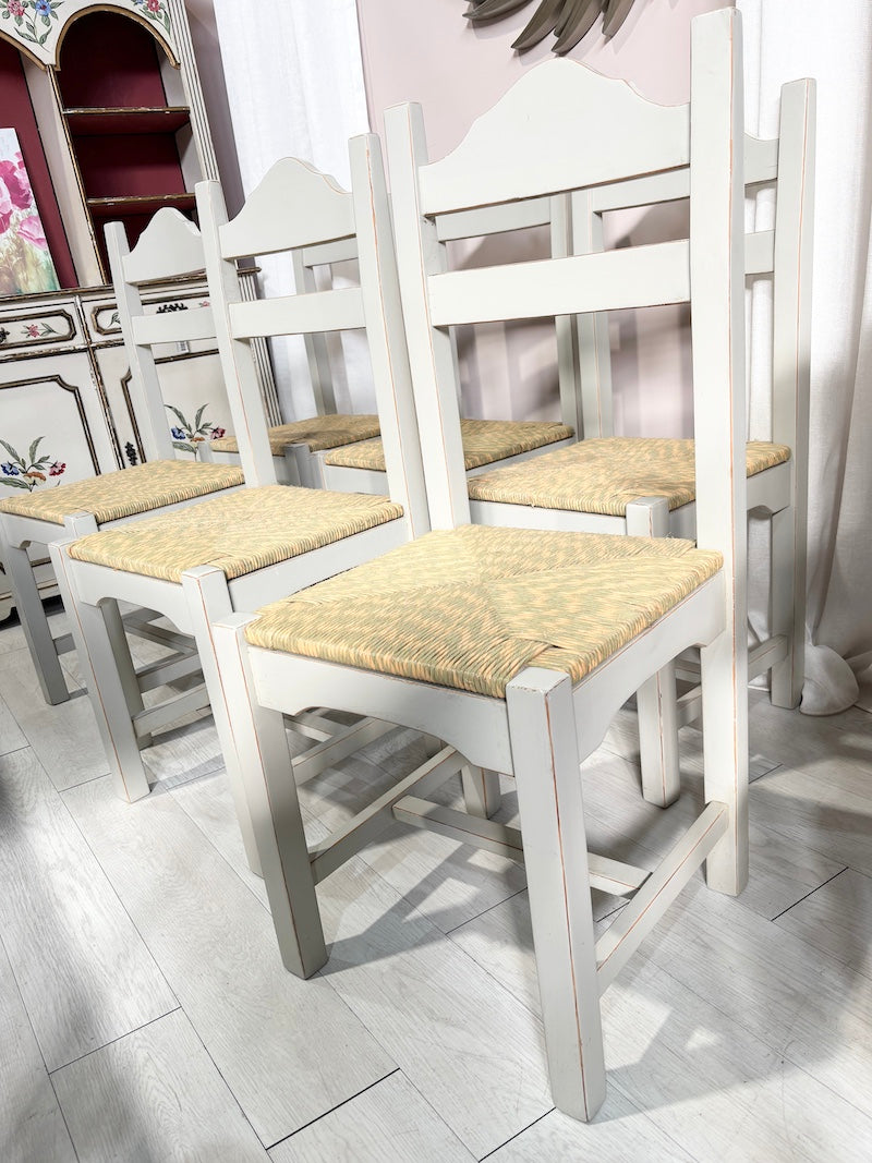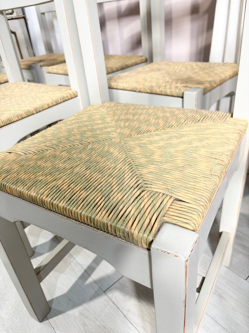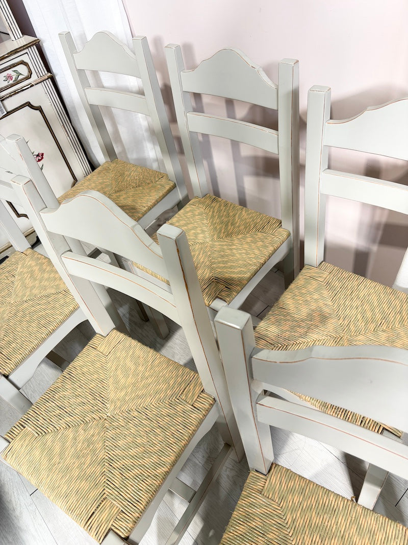 Conjunto de seis cadeiras em madeira maciça pintadas de cinzento, com assentos entrançados em tons de verde e areia. Uma coleção perfeita para trazer um toque de praia à sua casa.