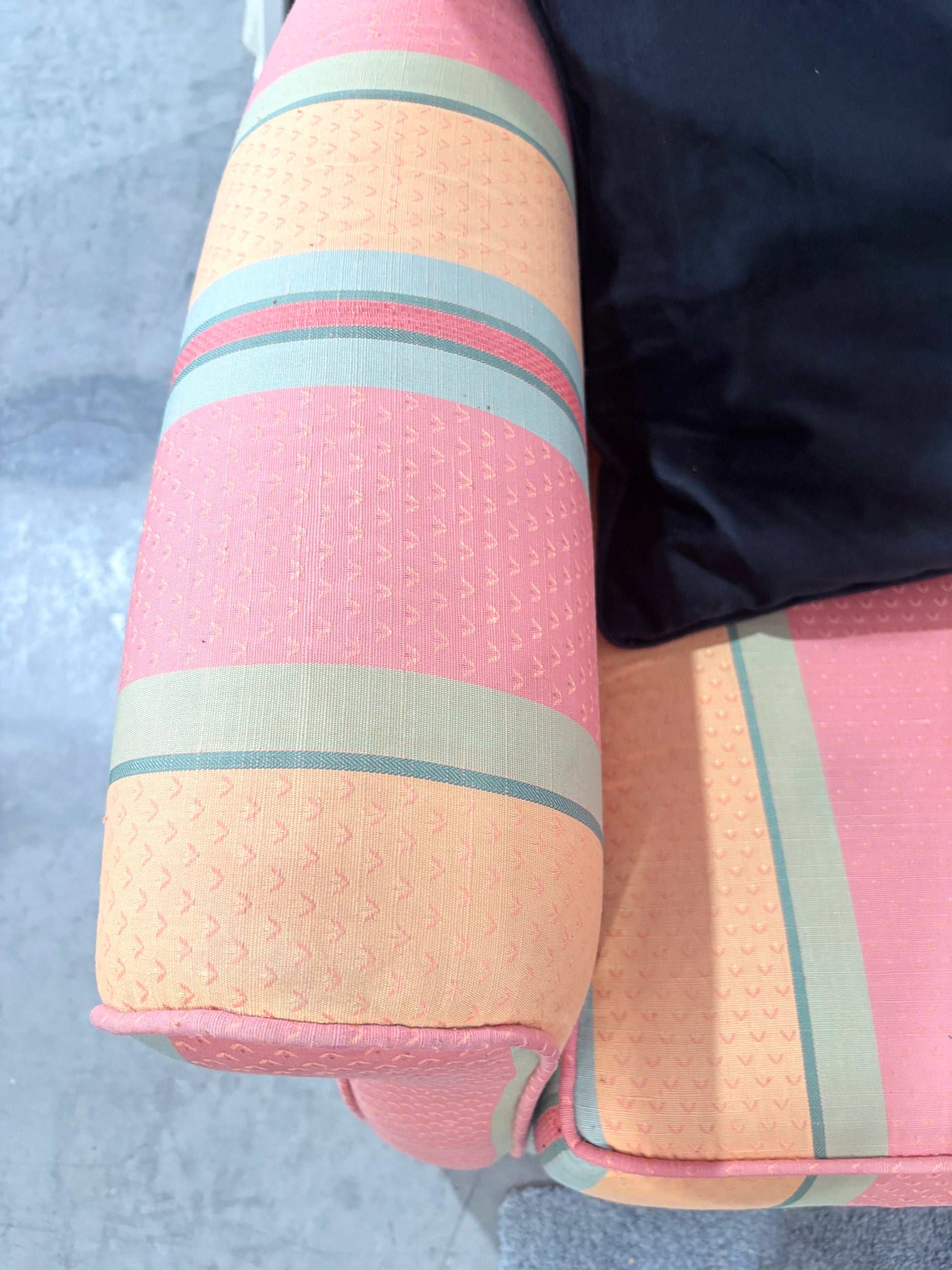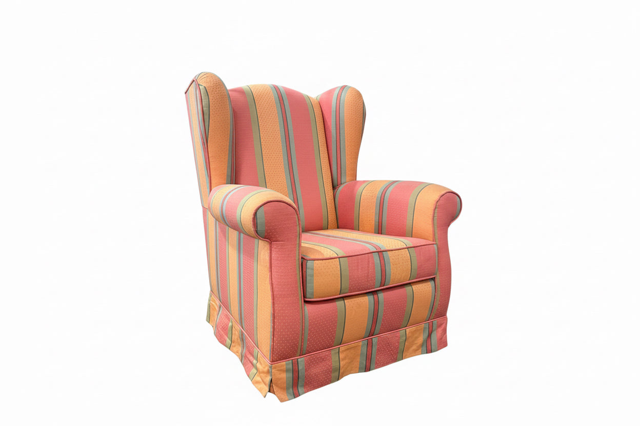Uma confortável poltrona de encosto alto forrada a riscas coloridas nas cores laranja, rosa e verde. Note que apresenta alguns sinais de uso.