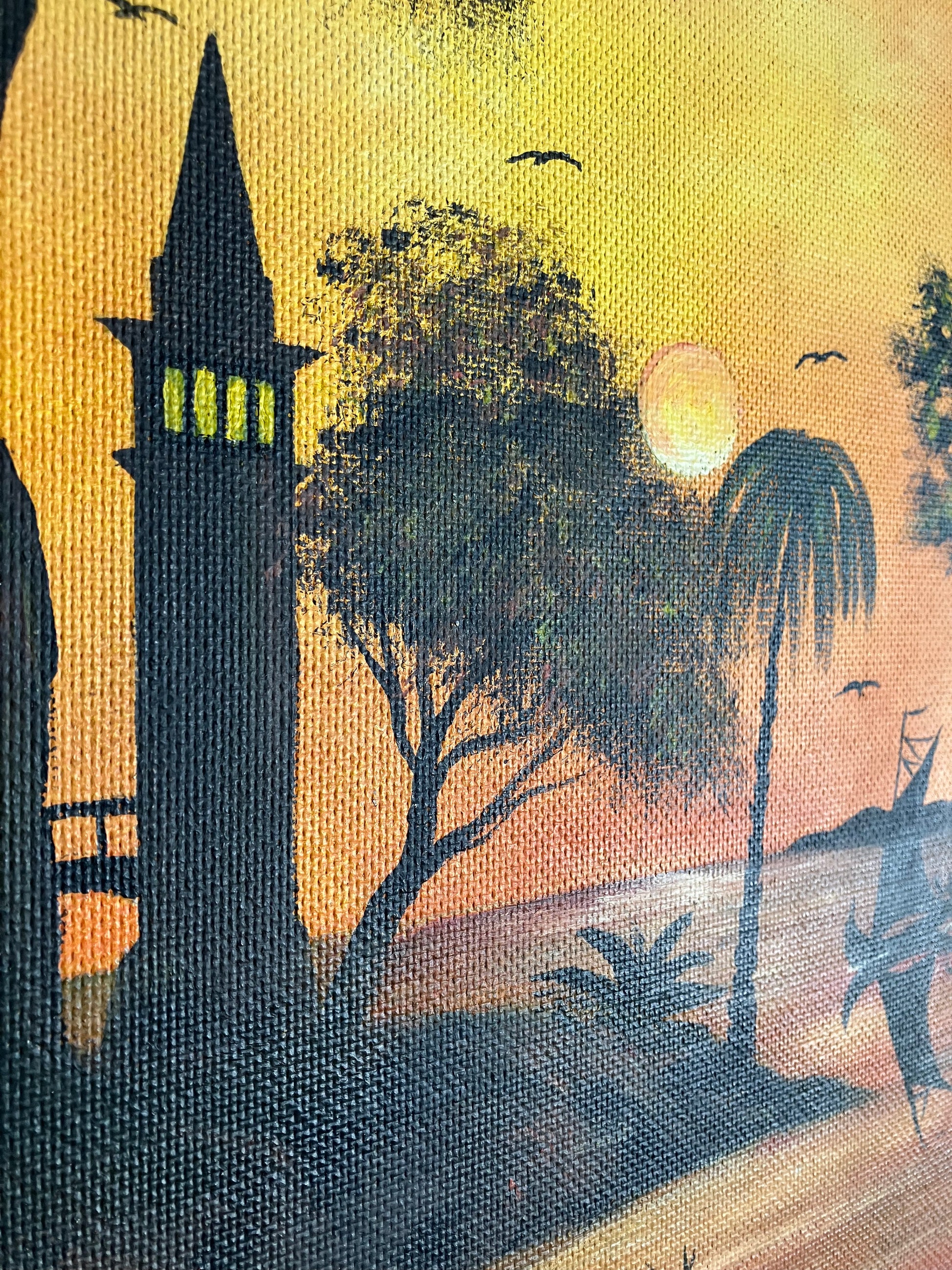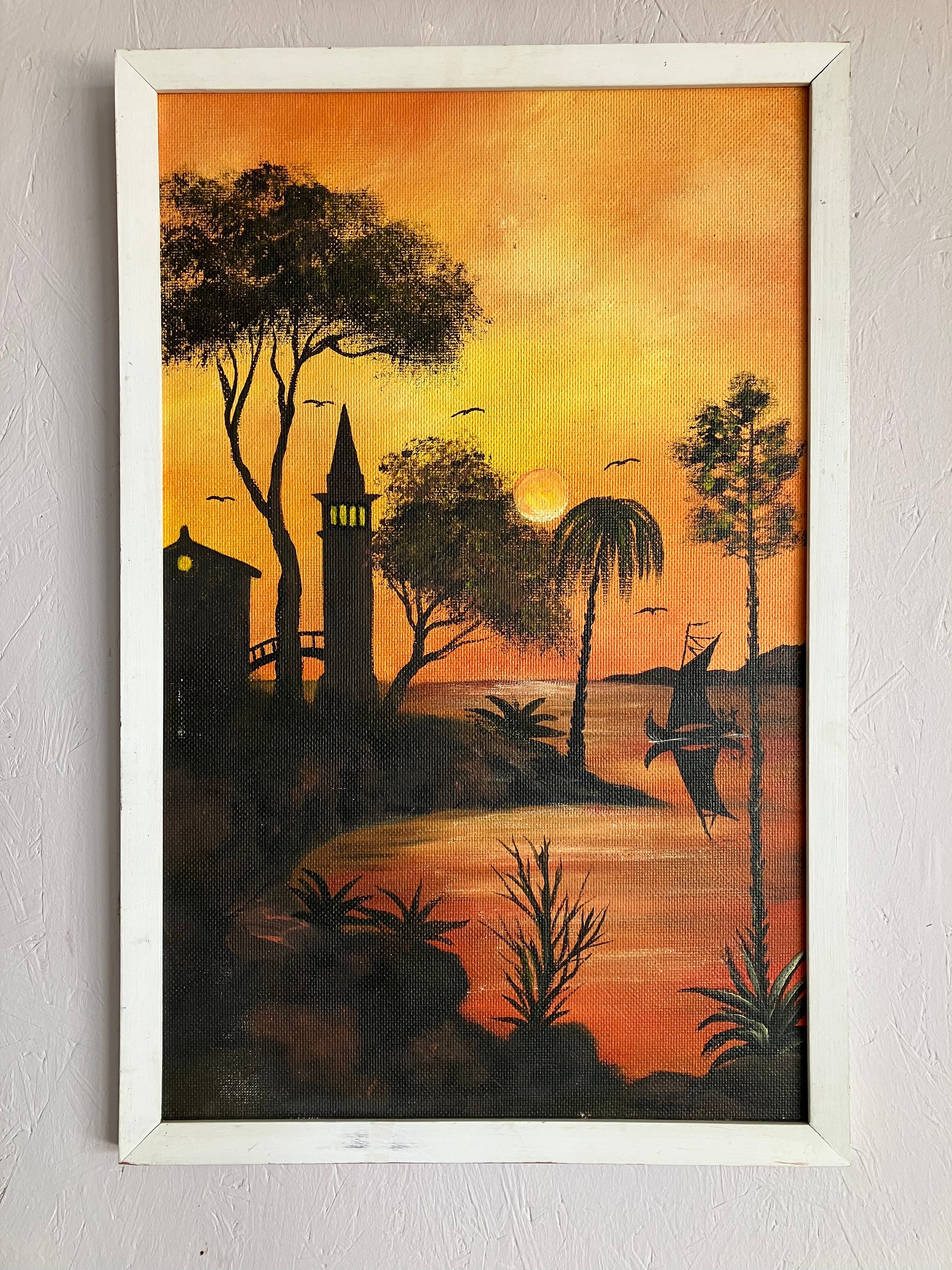 Uma paisagem em tons quentes com silhuetas de árvores ao pôr do sol. Esta peça traz uma energia calma e pacífica a qualquer espaço e combina perfeitamente com interiores naturais ou terrosos.