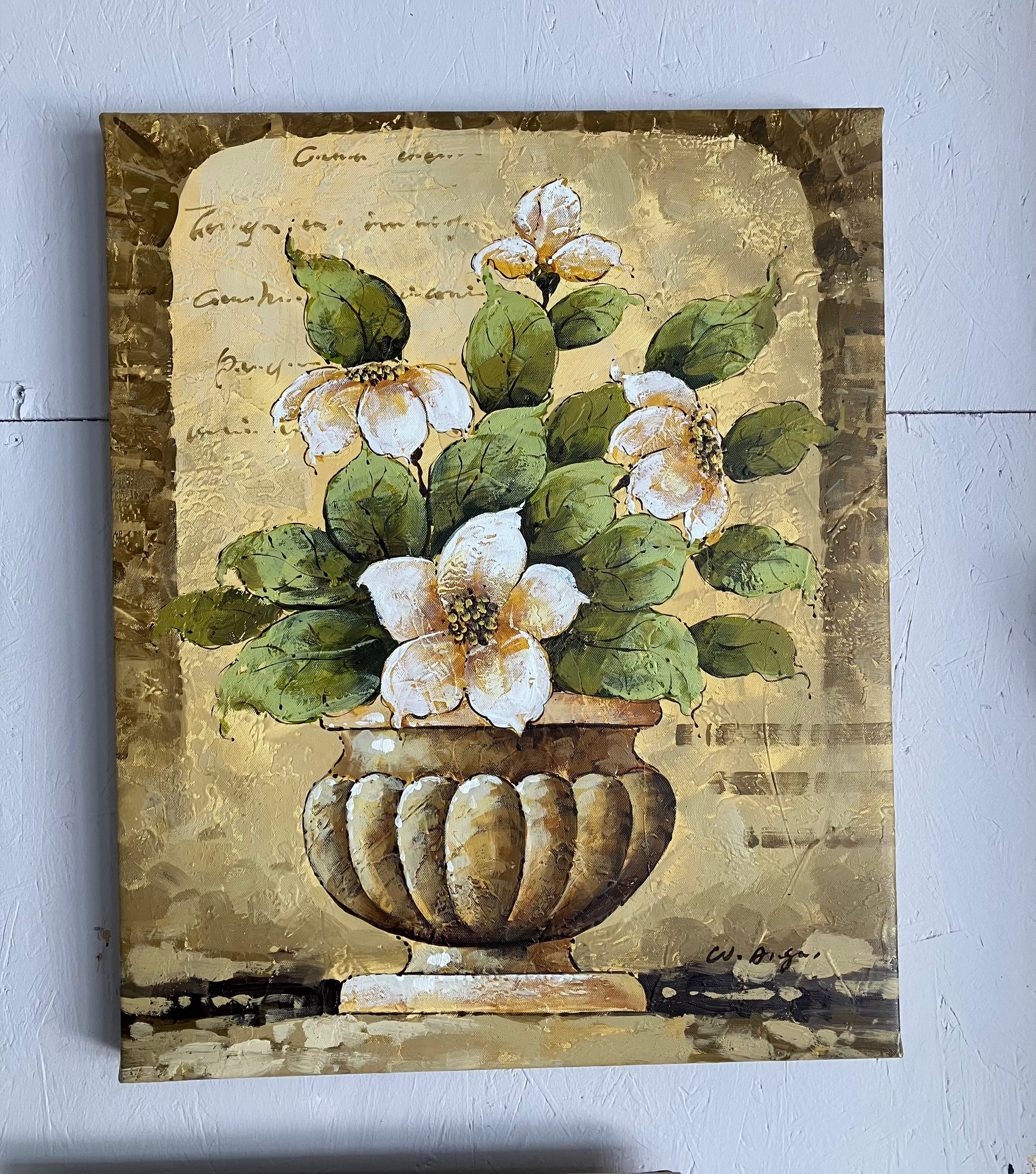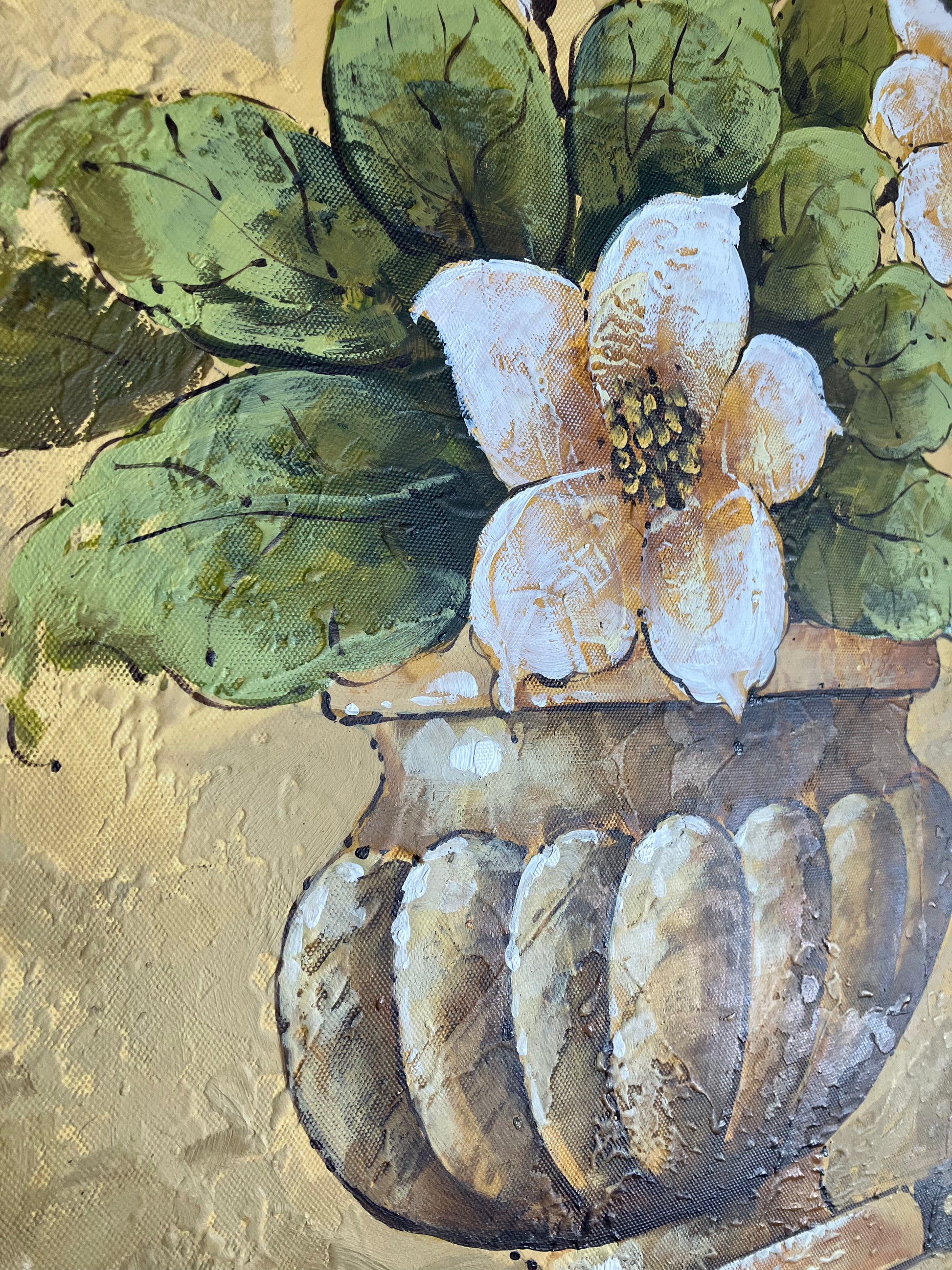 Uma pintura floral suave e clássica com flores de magnólia num vaso decorativo. Uma peça intemporal que combina com uma decoração tradicional, romântica ou vintage.