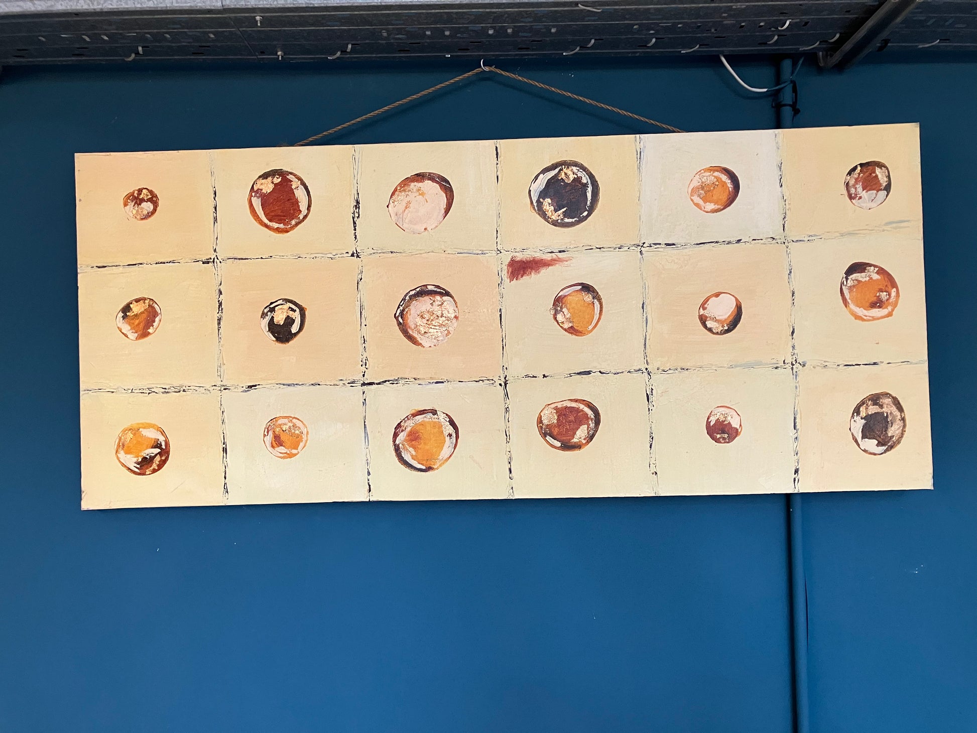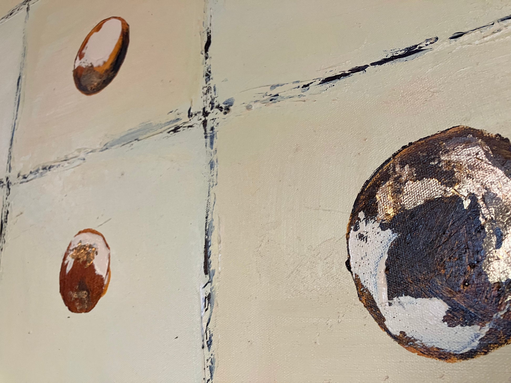 Círculos simples e texturados em tons quentes e naturais com toques de técnicas mistas. O layout limpo e a paleta discreta tornam esta peça calma e equilibrada.