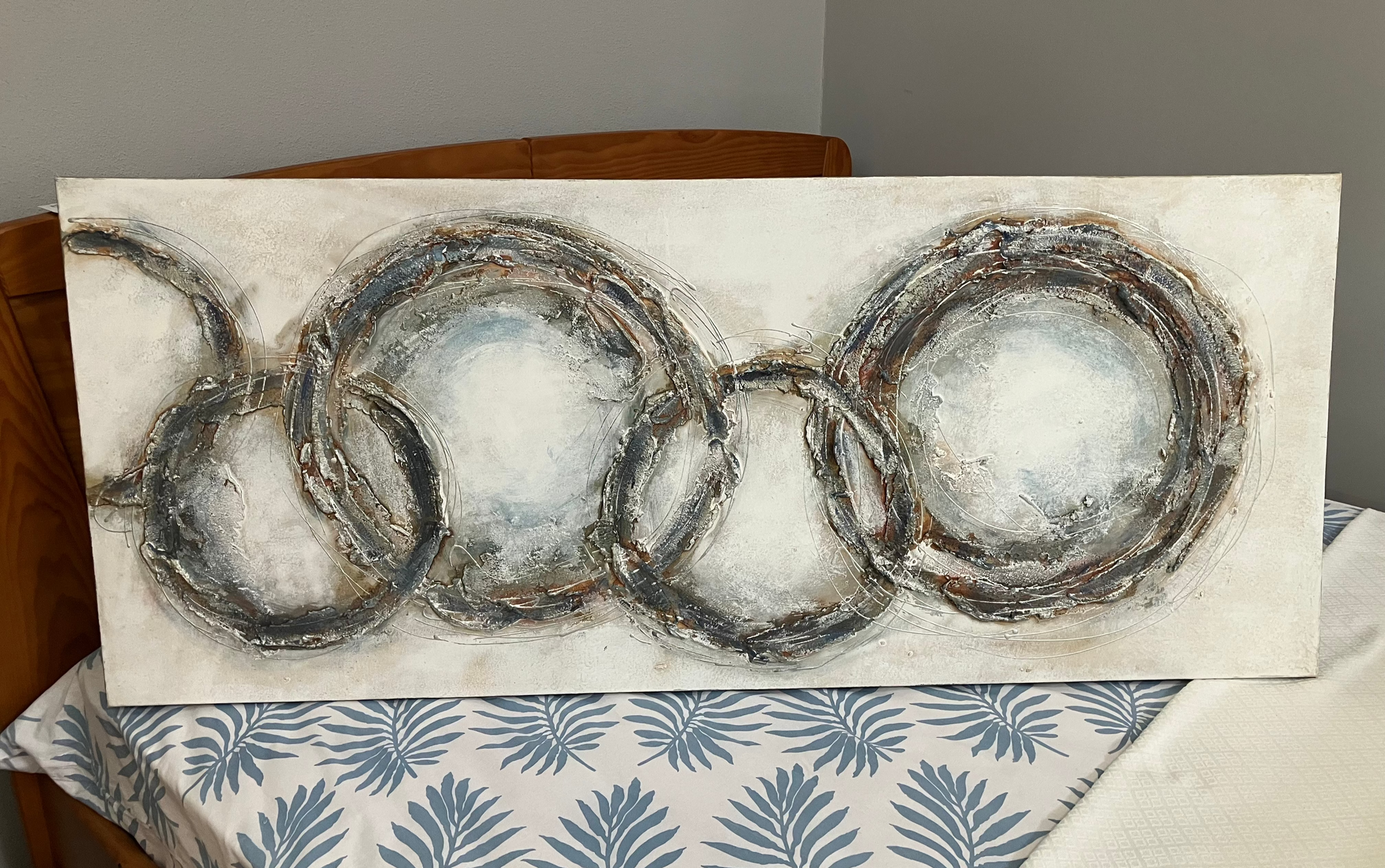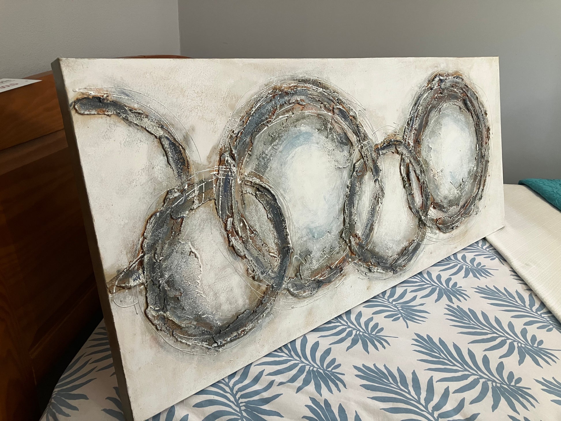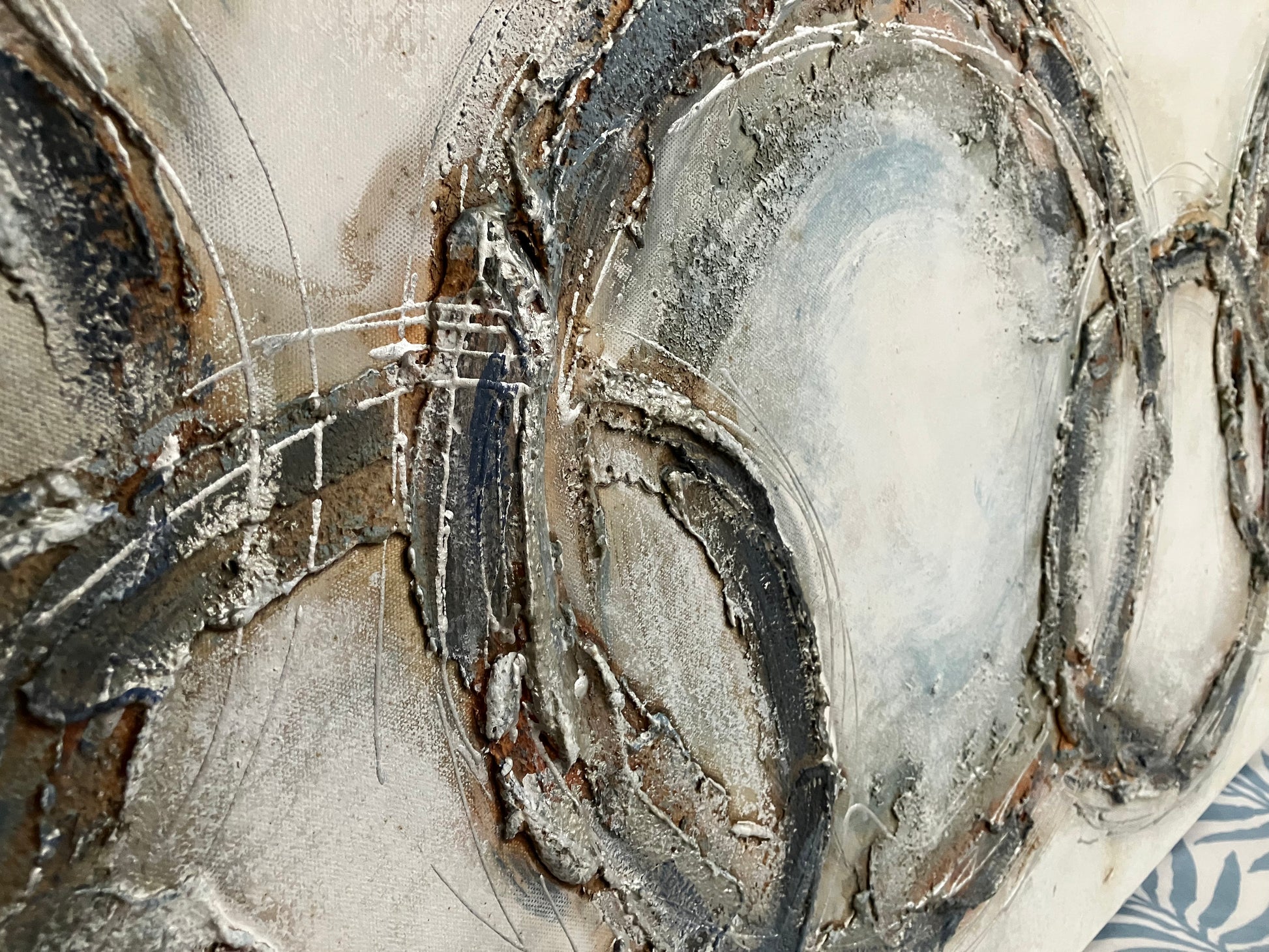 Esta obra de arte abstrata texturizada apresenta círculos entrelaçados em tons neutros. Uma peça marcante, porém sutil, que adiciona profundidade e interesse a espaços modernos ou minimalistas.