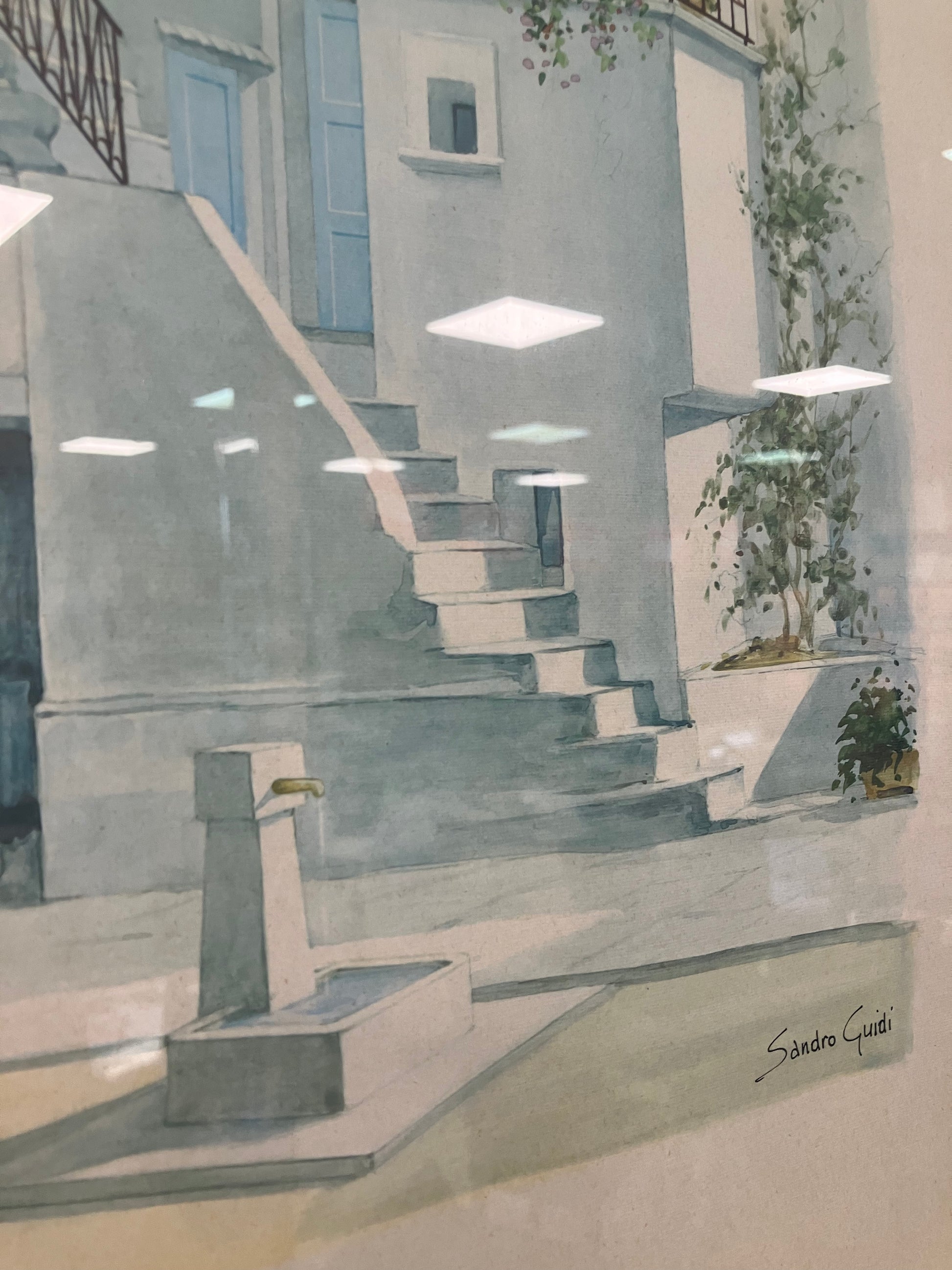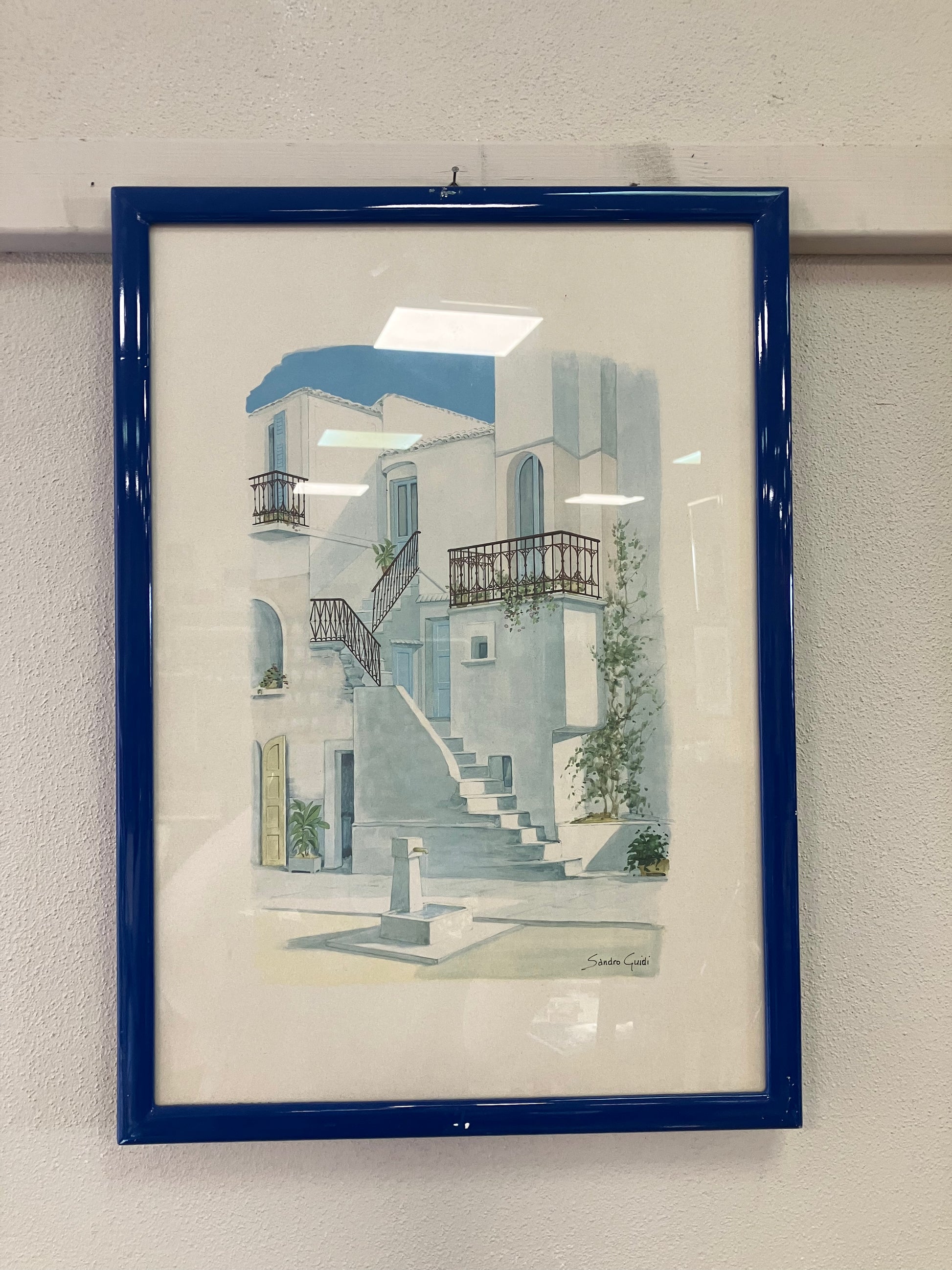 Uma pintura em azul e branco da arquitetura tradicional mediterrânica. Leve e fresco — ideal para interiores mediterrânicos ou minimalistas.