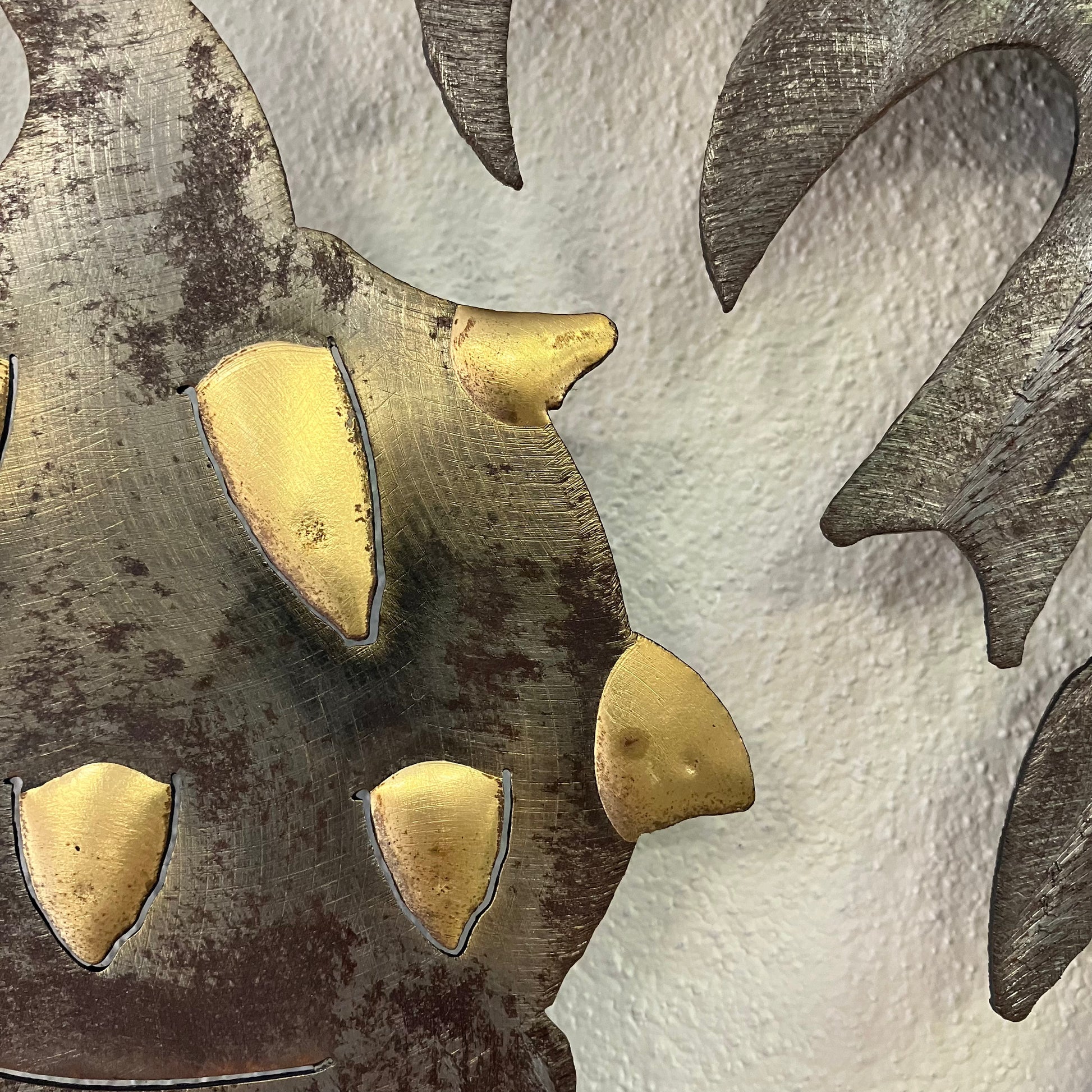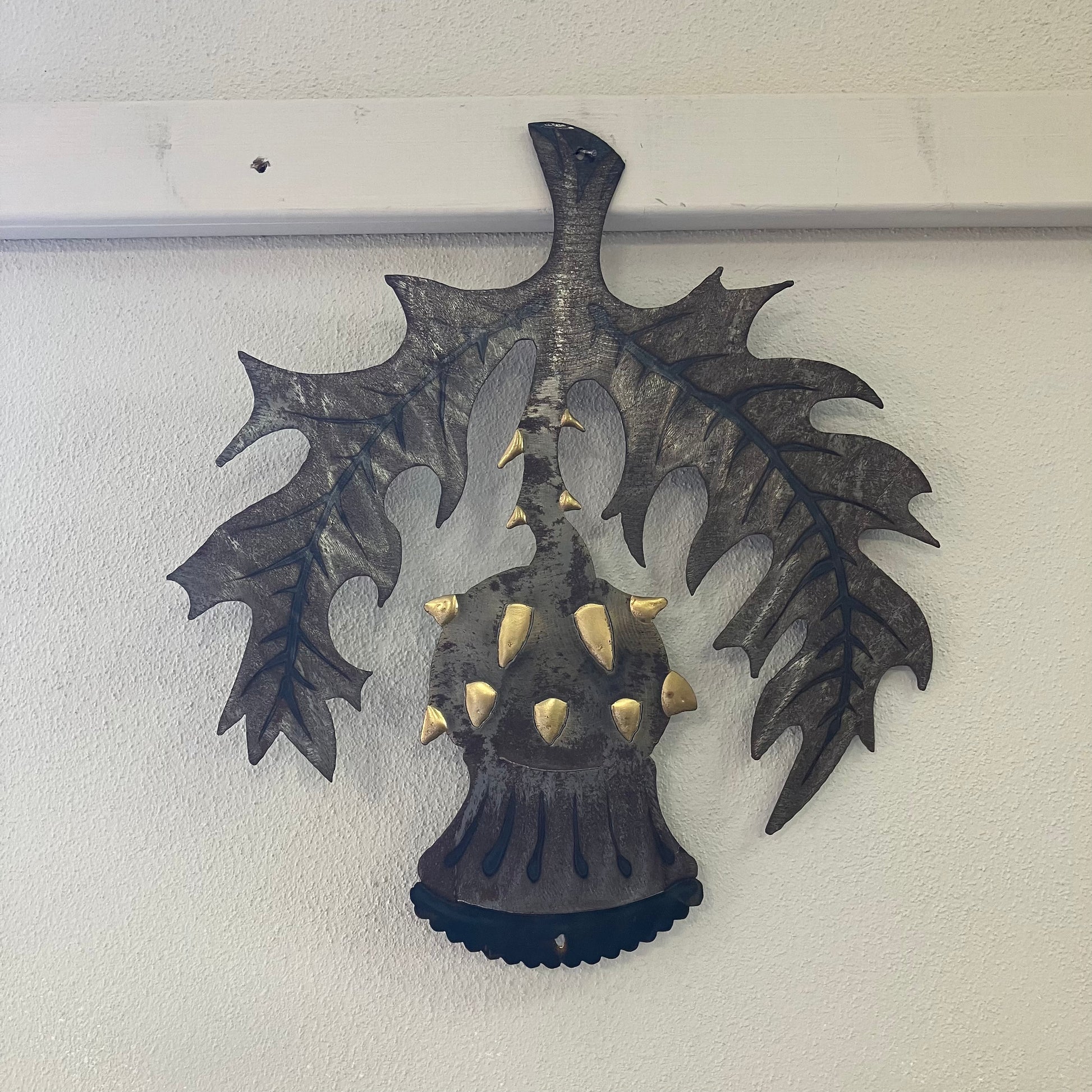 Uma peça decorativa de metal para parede em forma de folhas com uma flor. Decorativa e com um estilo ligeiramente antigo, acrescenta textura e interesse.