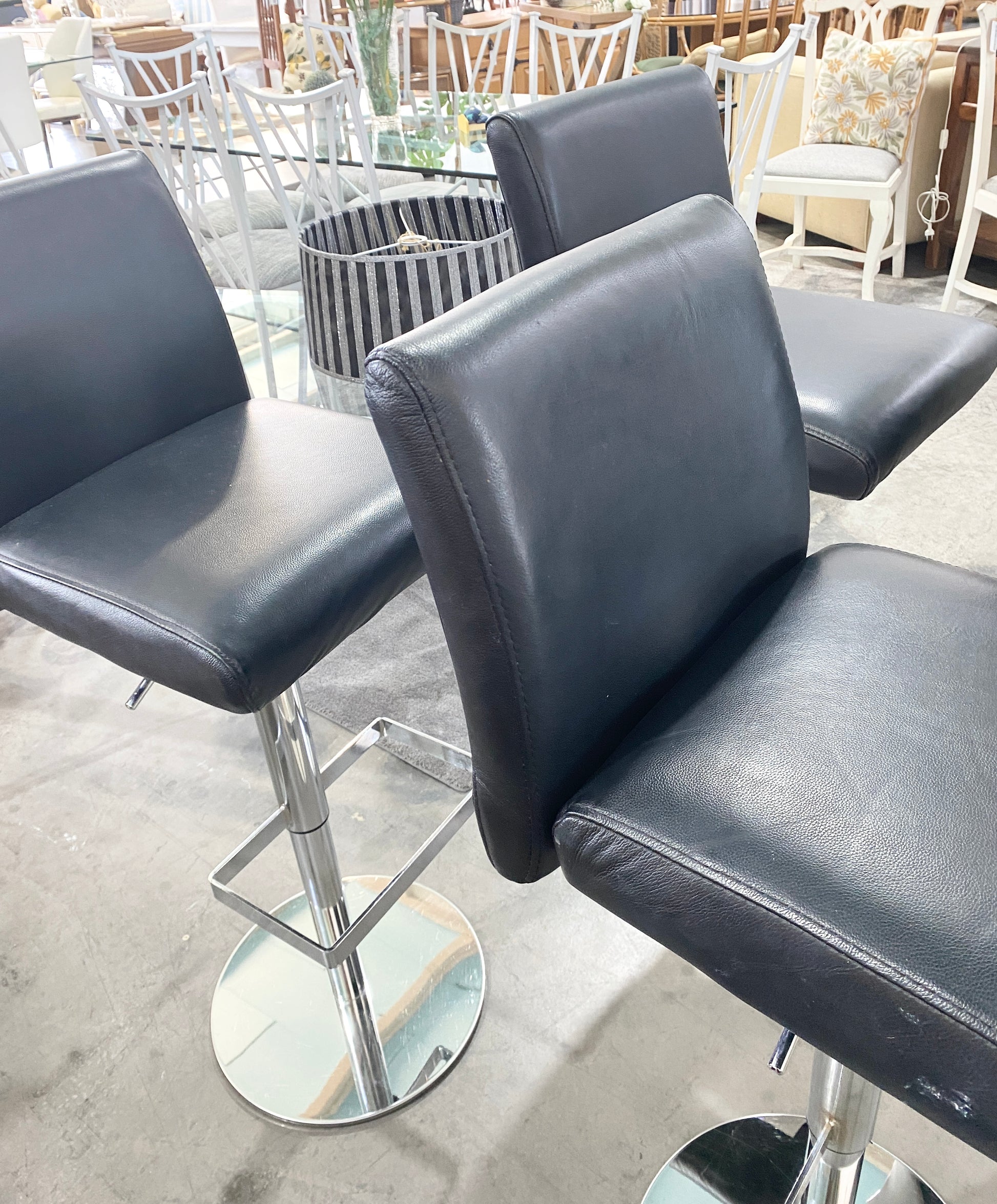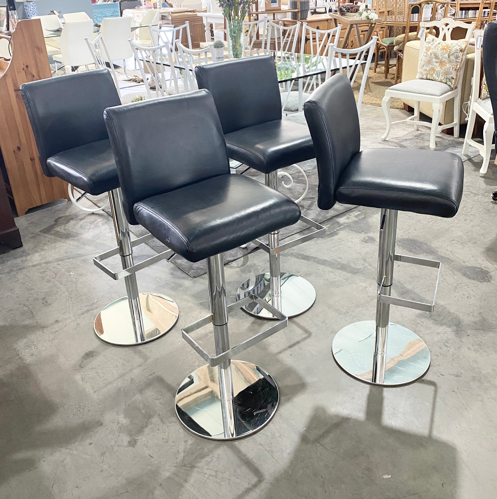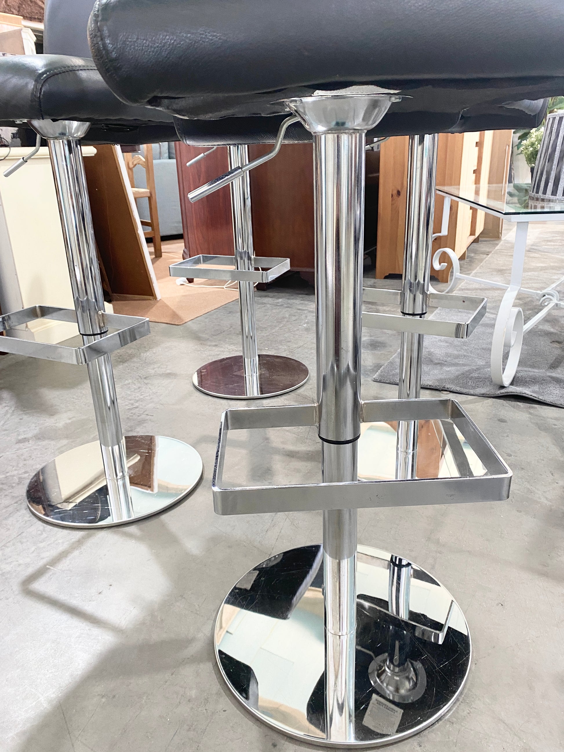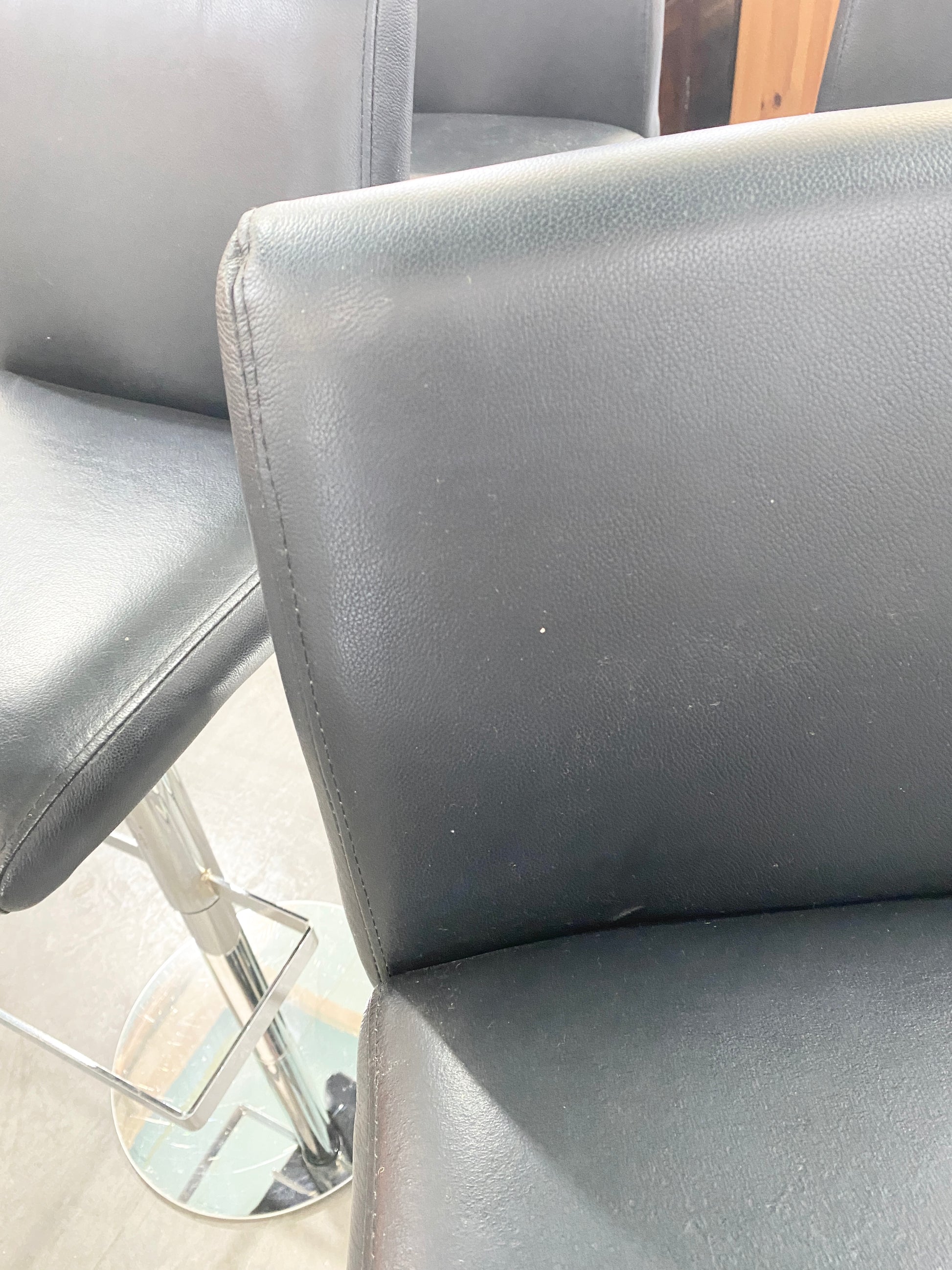 Elegantes e confortáveis, estes bancos de bar apresentam assentos acolchoados em pele sintética preta, encostos com suporte e bases em metal resistentes. Uma escolha moderna e prática para ilhas de cozinha, bares ou balcões altos.