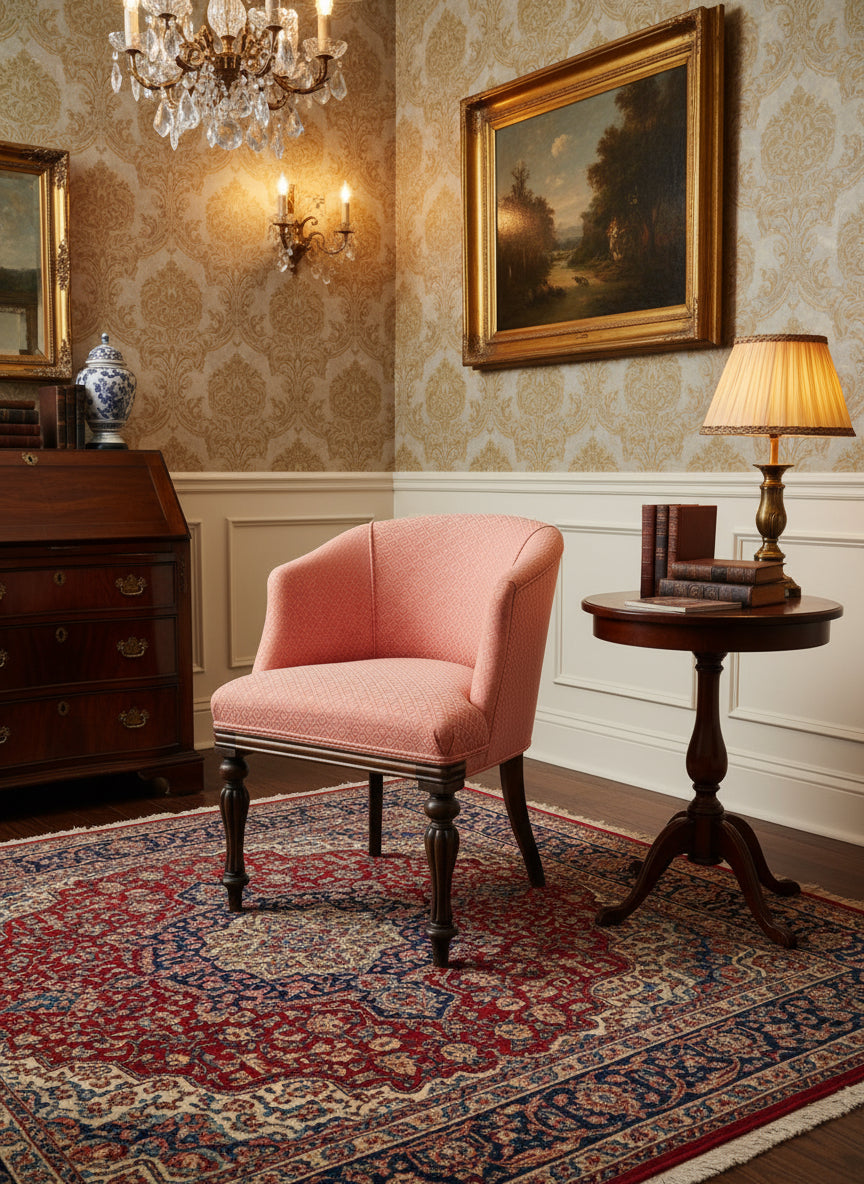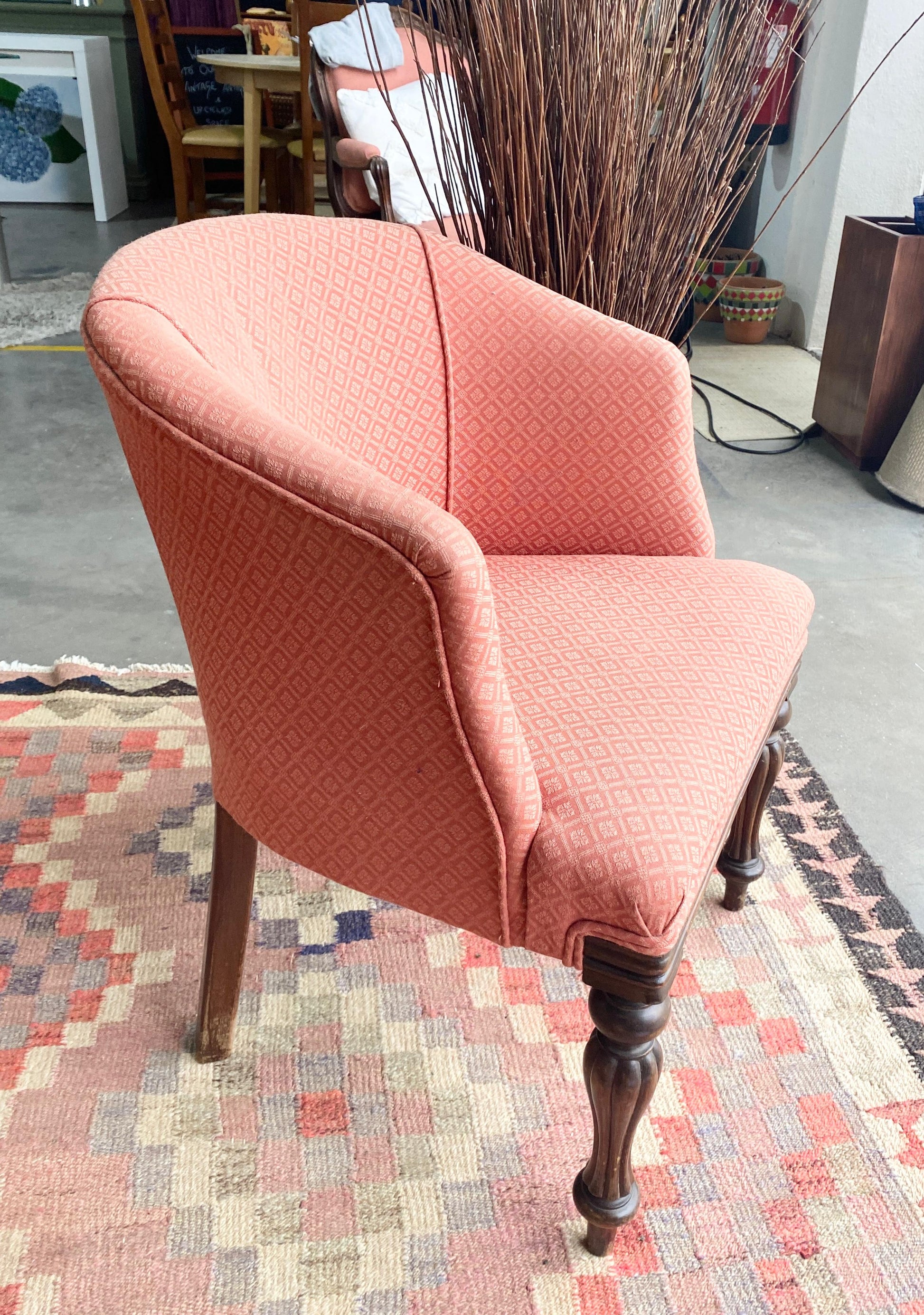 Adicione um toque de charme intemporal ao seu espaço com esta cadeira vintage primorosamente trabalhada. Com estofos em padrão coral com losangos, esta cadeira combina conforto e sofisticação num design convidativo. O encosto curvo torna-a confortável, enquanto as robustas pernas de madeira trabalhada conferem um carácter clássico e um suporte fiável.