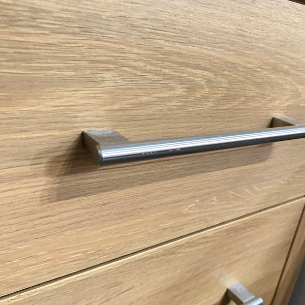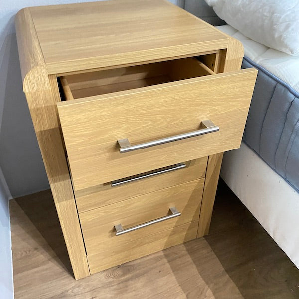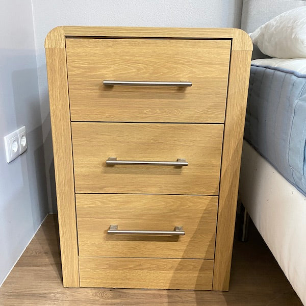 Uma mesa de cabeceira de solteiro com bonitos cantos arredondados e três gavetas espaçosas. As longas pegas de metal facilitam a abertura.