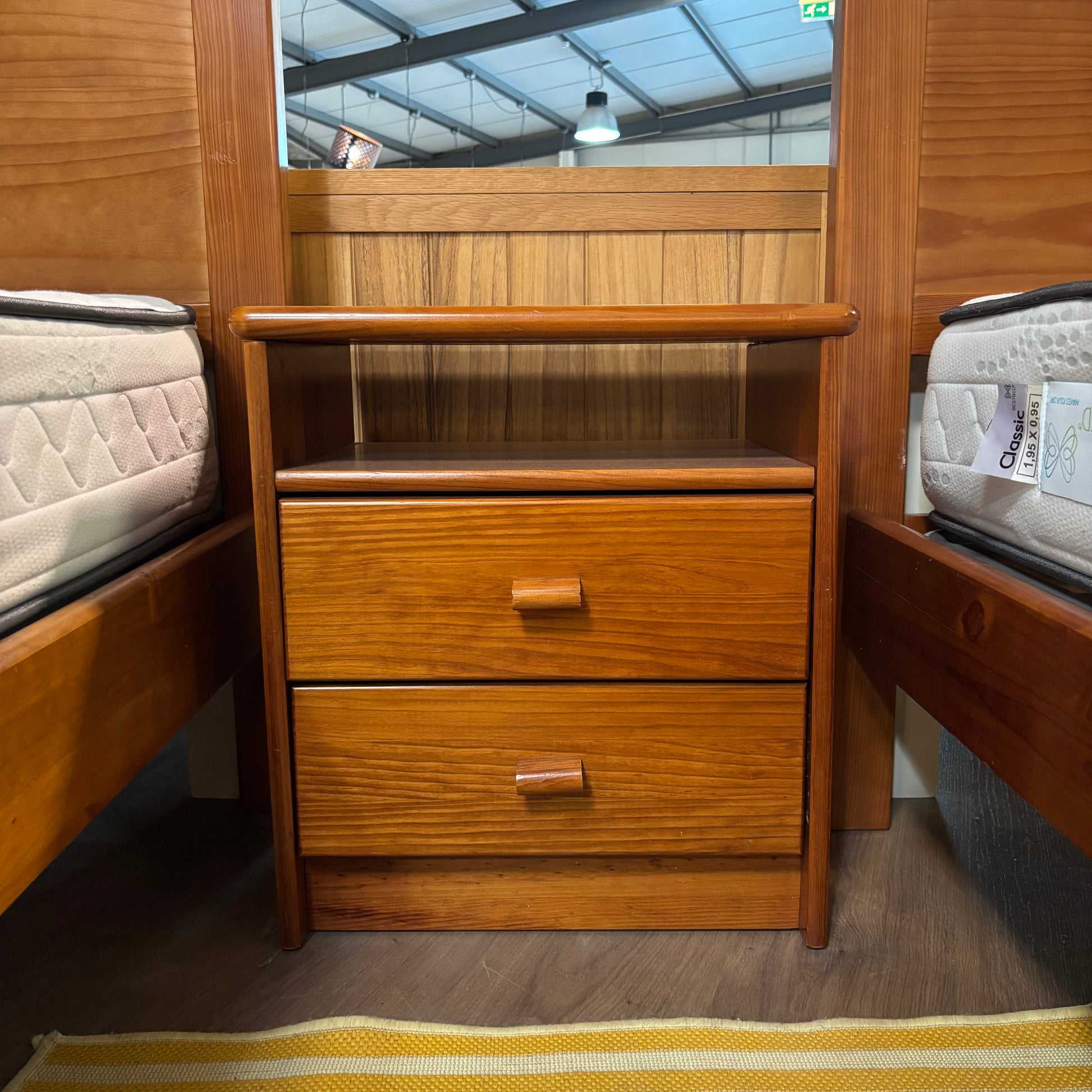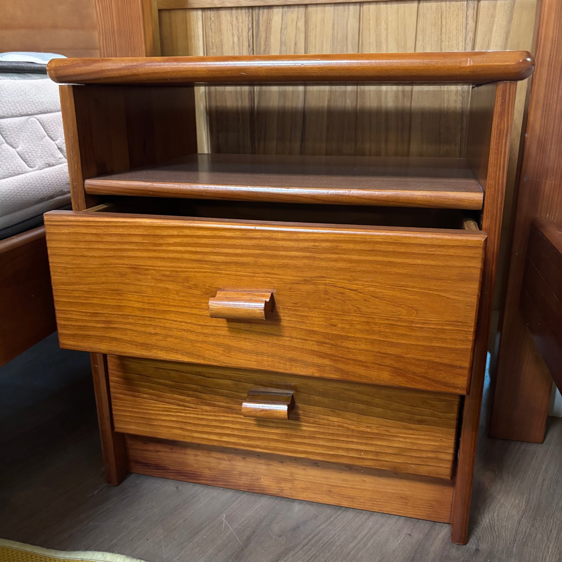 Mesa de cabeceira em madeira cor de mel claro com duas gavetas profundas. Acabamento neutro que combina com a maioria dos estilos.