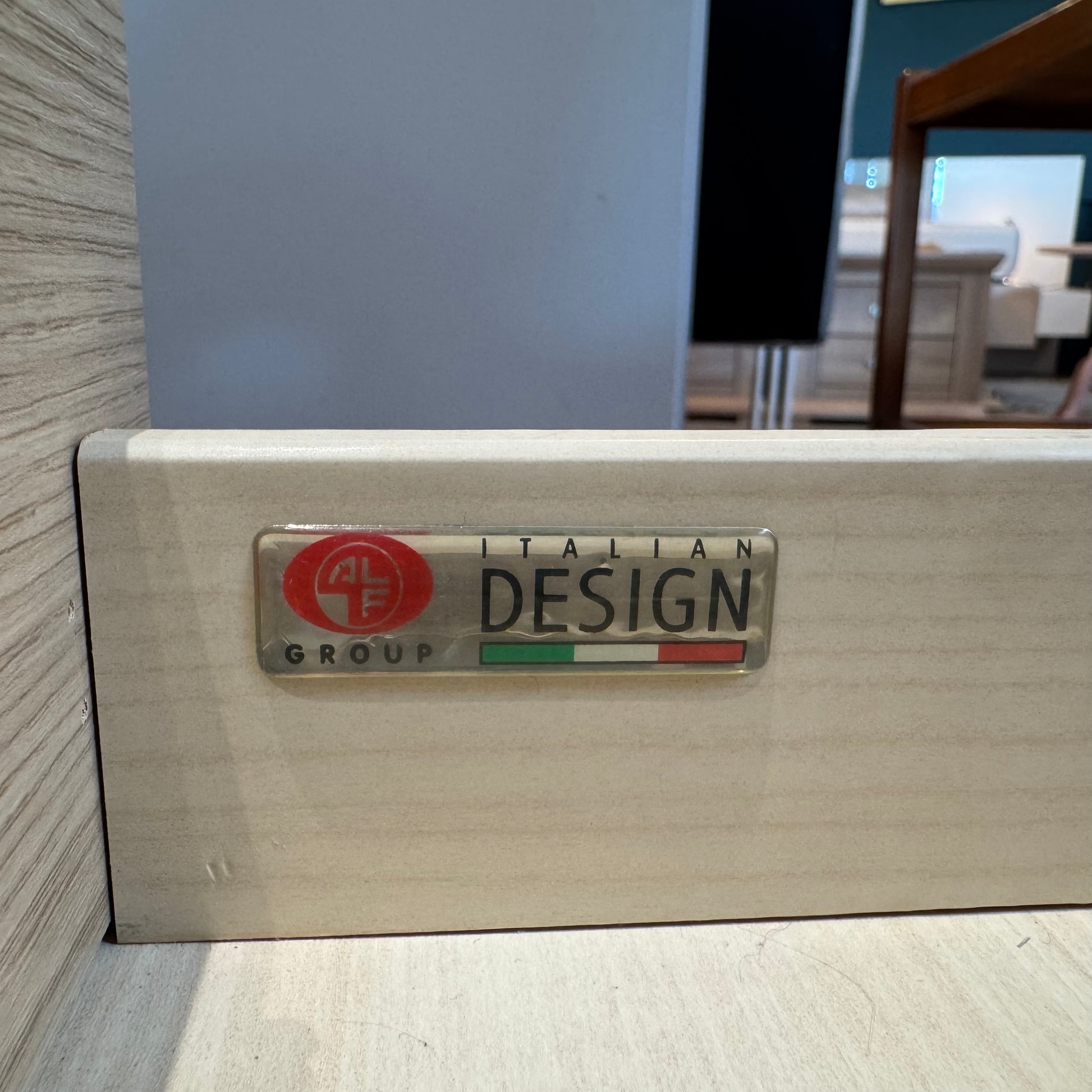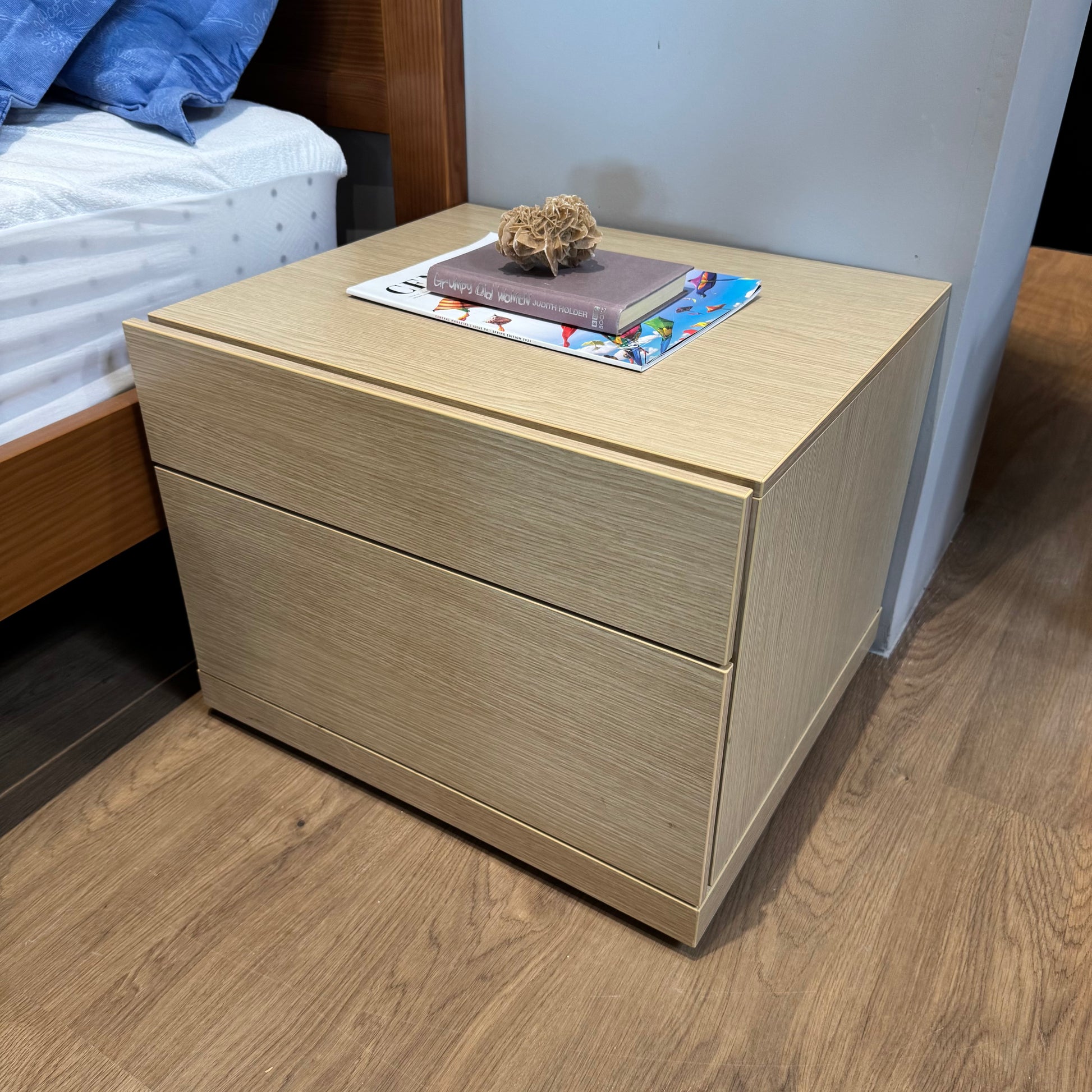 Uma mesa de cabeceira contemporânea e robusta com duas gavetas num acabamento de madeira clara e elegante, oferecendo uma arrumação prática e um aspeto minimalista para quartos modernos.