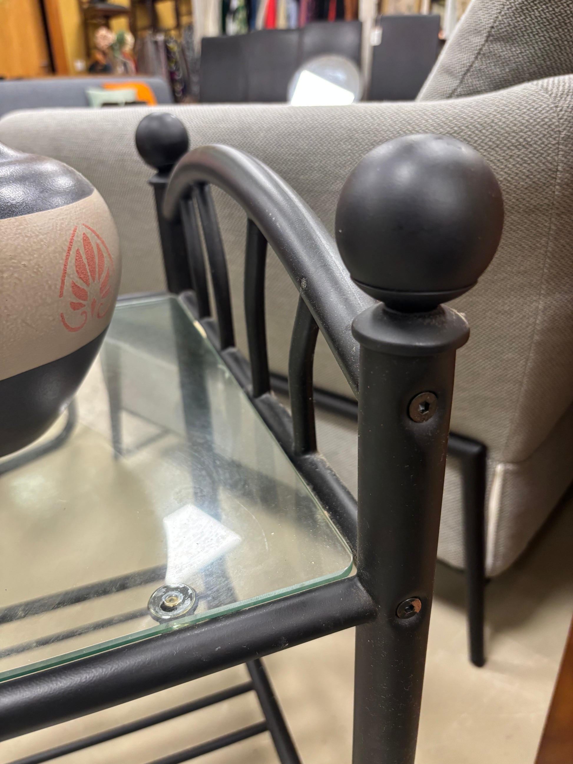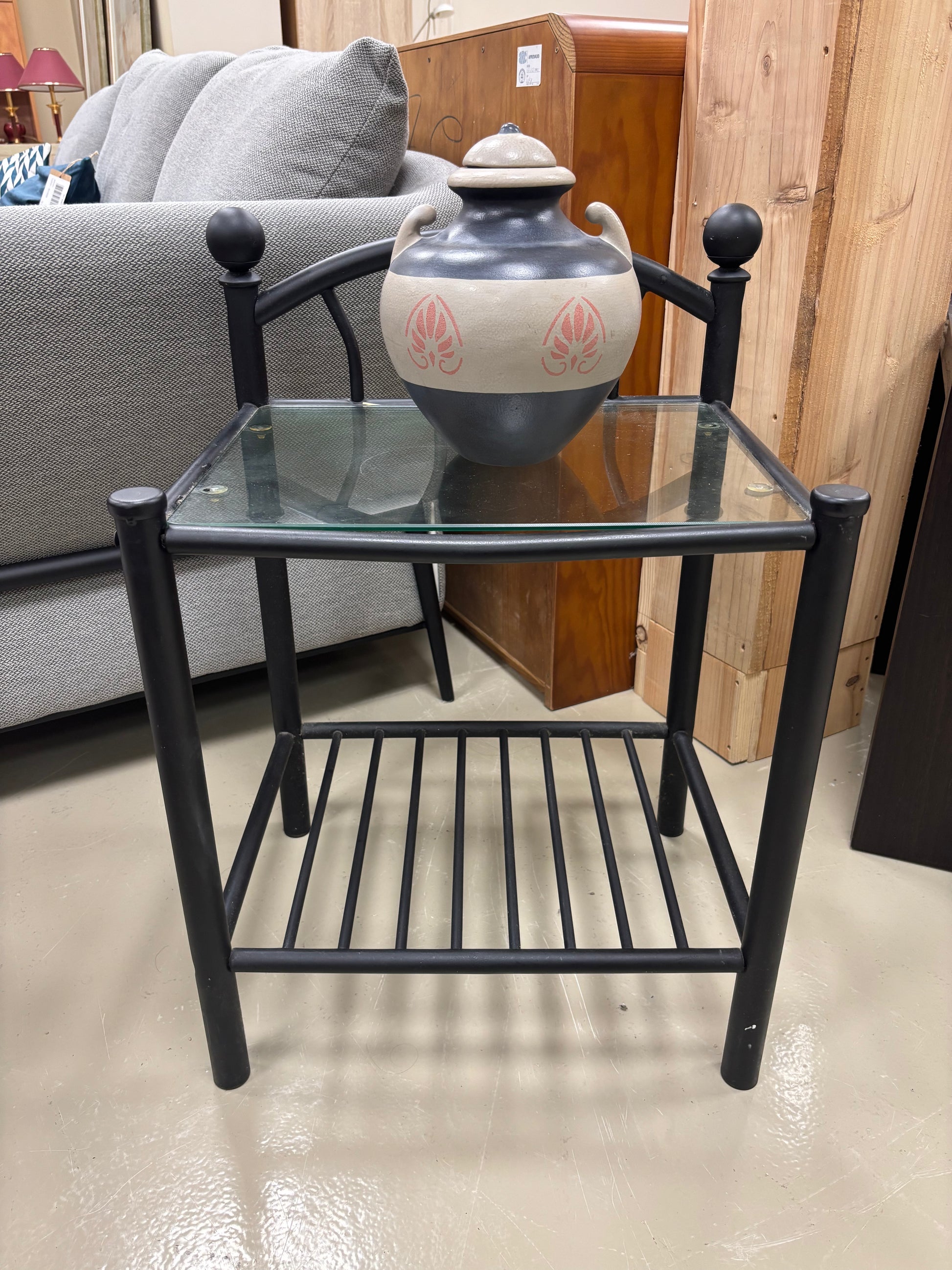 Mesa de cabeceira individual com tampo em vidro e prateleira inferior. Ideal para utilização em quarto de hóspedes.