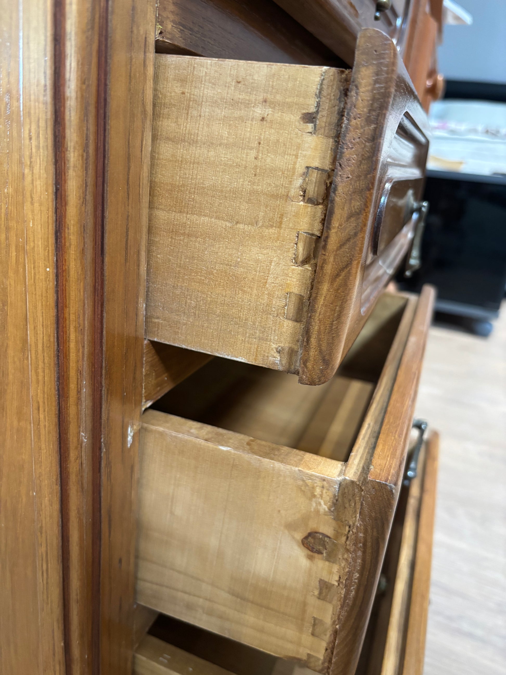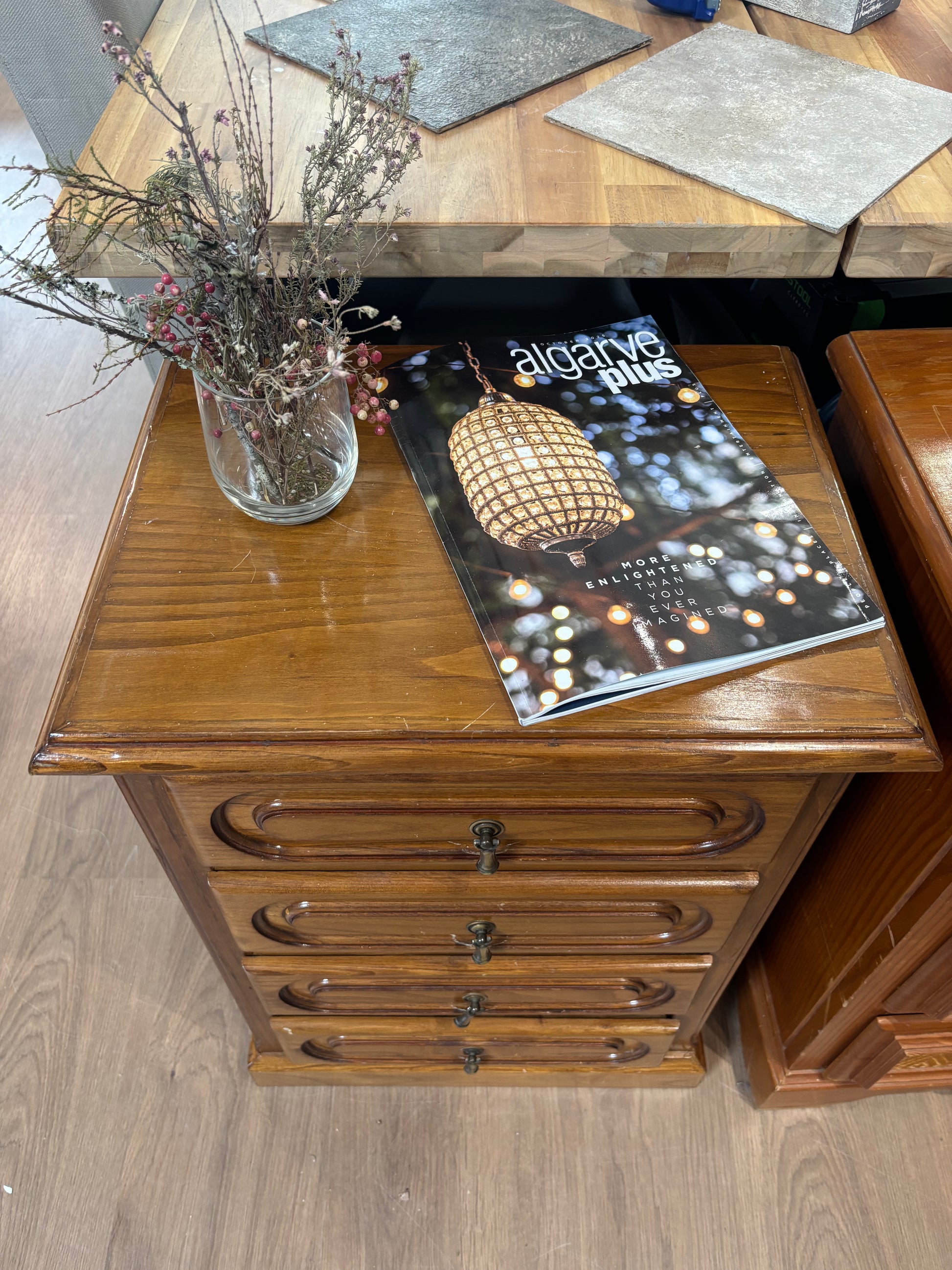 Encantadora mesa de cabeceira em madeira maciça com detalhes clássicos — ótima para arrumação e para adicionar calor ao seu espaço.