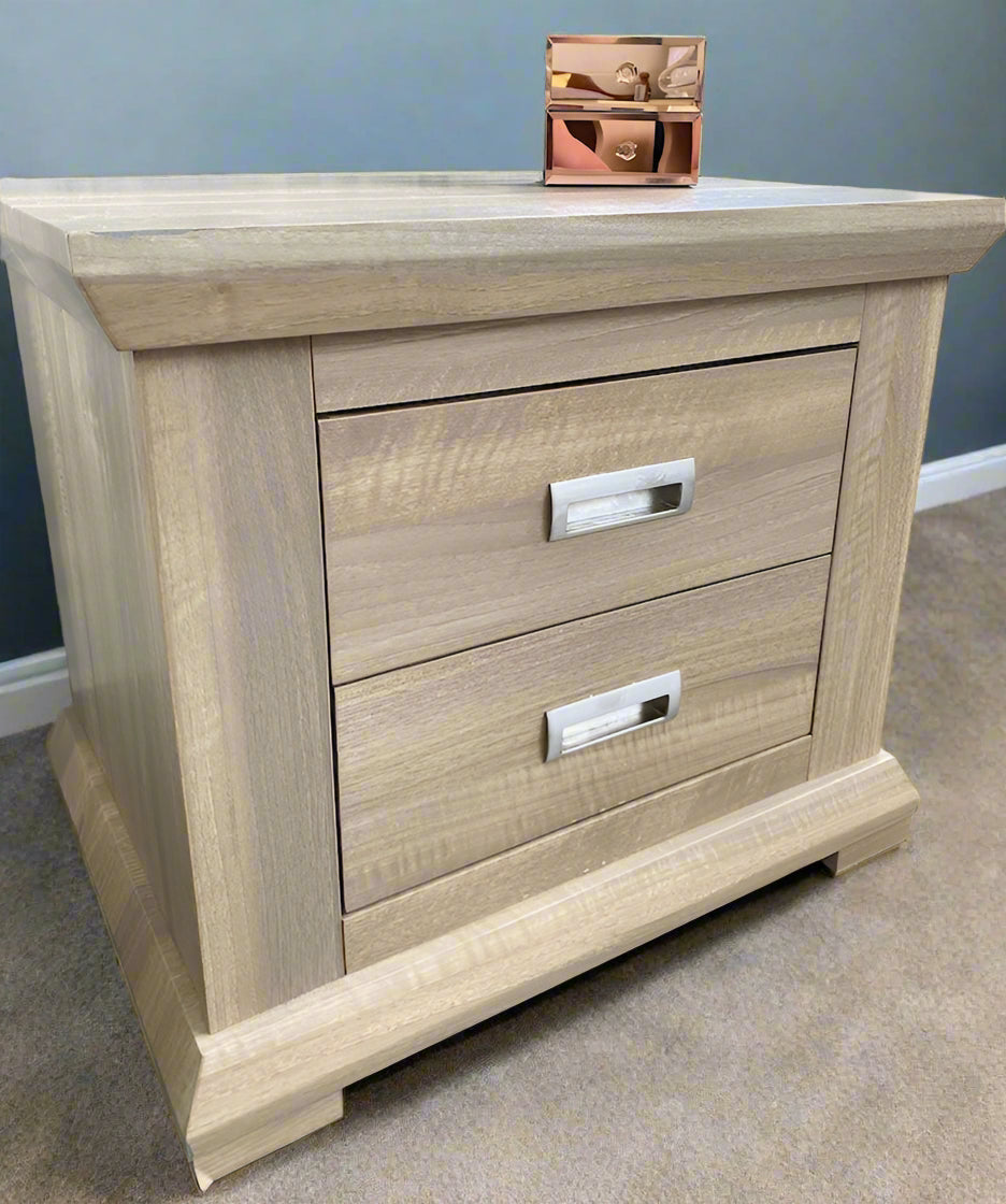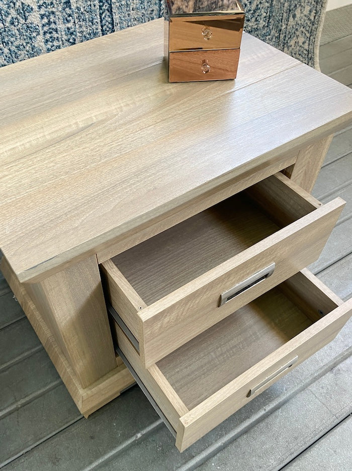 Um único criado-mudo baixo e largo com acabamento em madeira clara, duas gavetas e puxadores cromados embutidos.