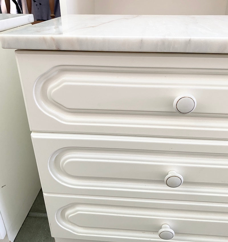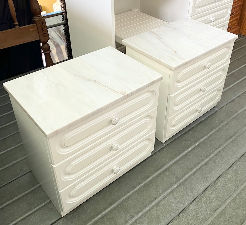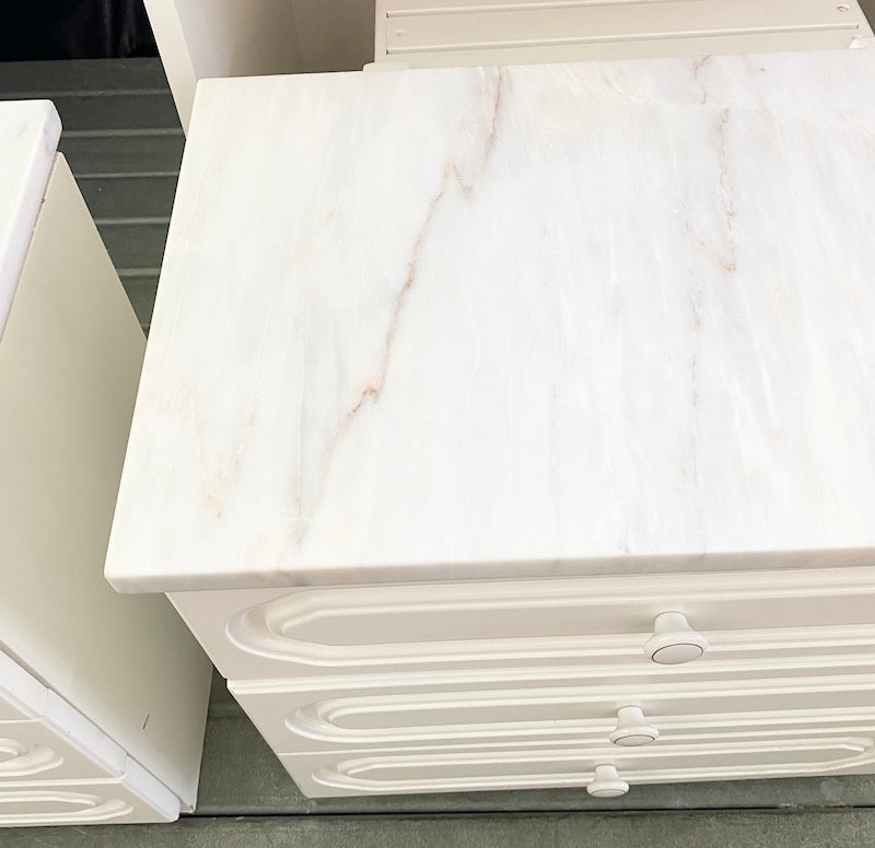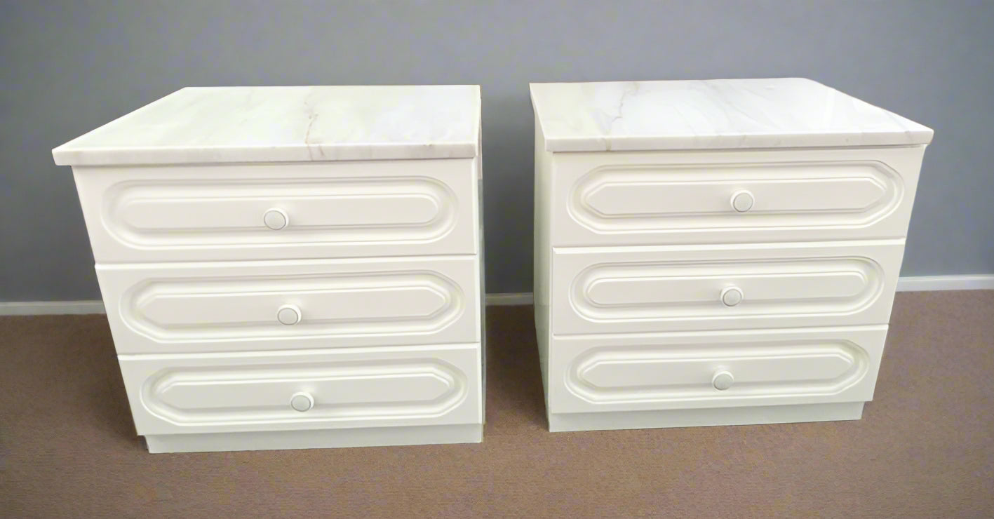 Um encantador par de mesas de cabeceira em madeira branca com tampos em mármore creme. Têm três gavetas, cada uma com puxadores redondos simples.
