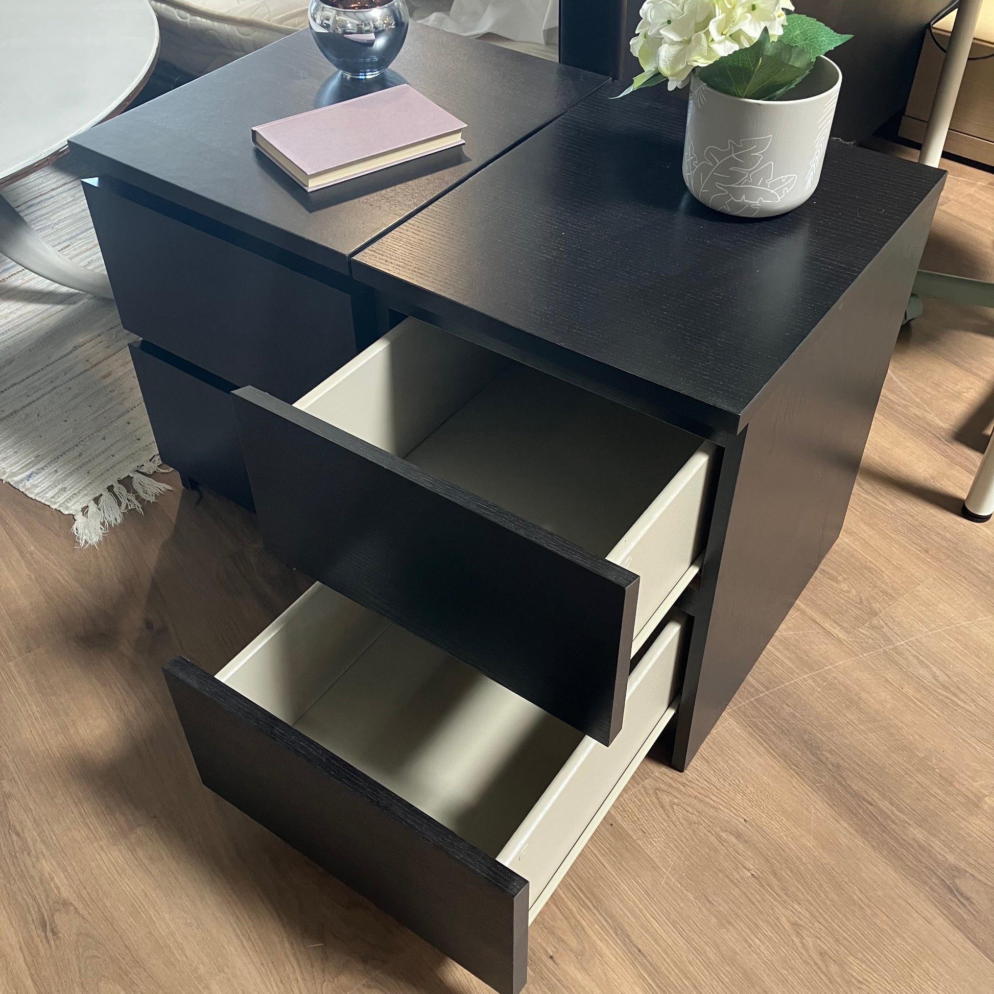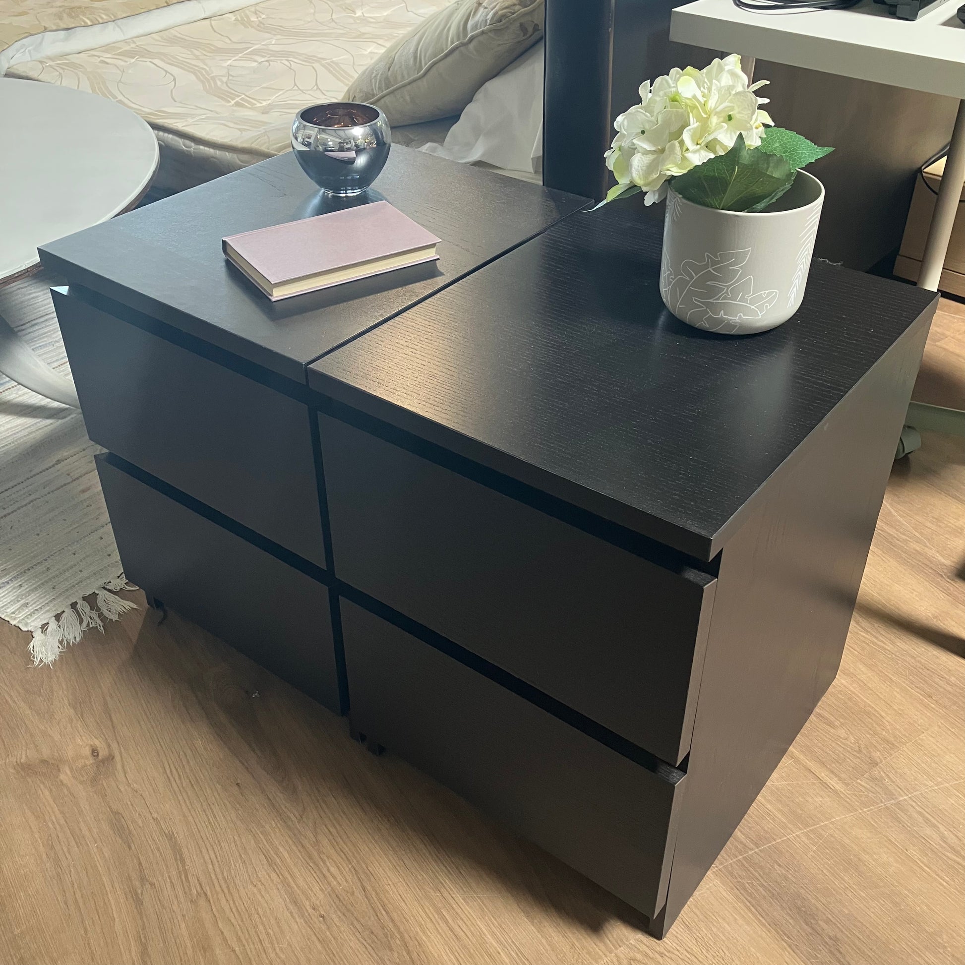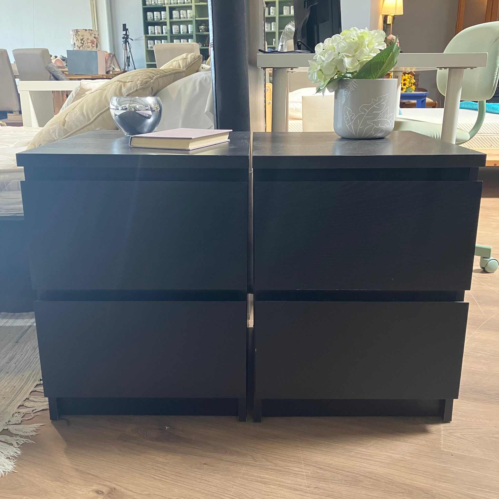 Um par de mesas de cabeceira pretas modernas a condizer, cada uma com duas gavetas espaçosas para uma arrumação prática. As suas linhas limpas e simples tornam-nas versáteis para qualquer estilo de decoração.
