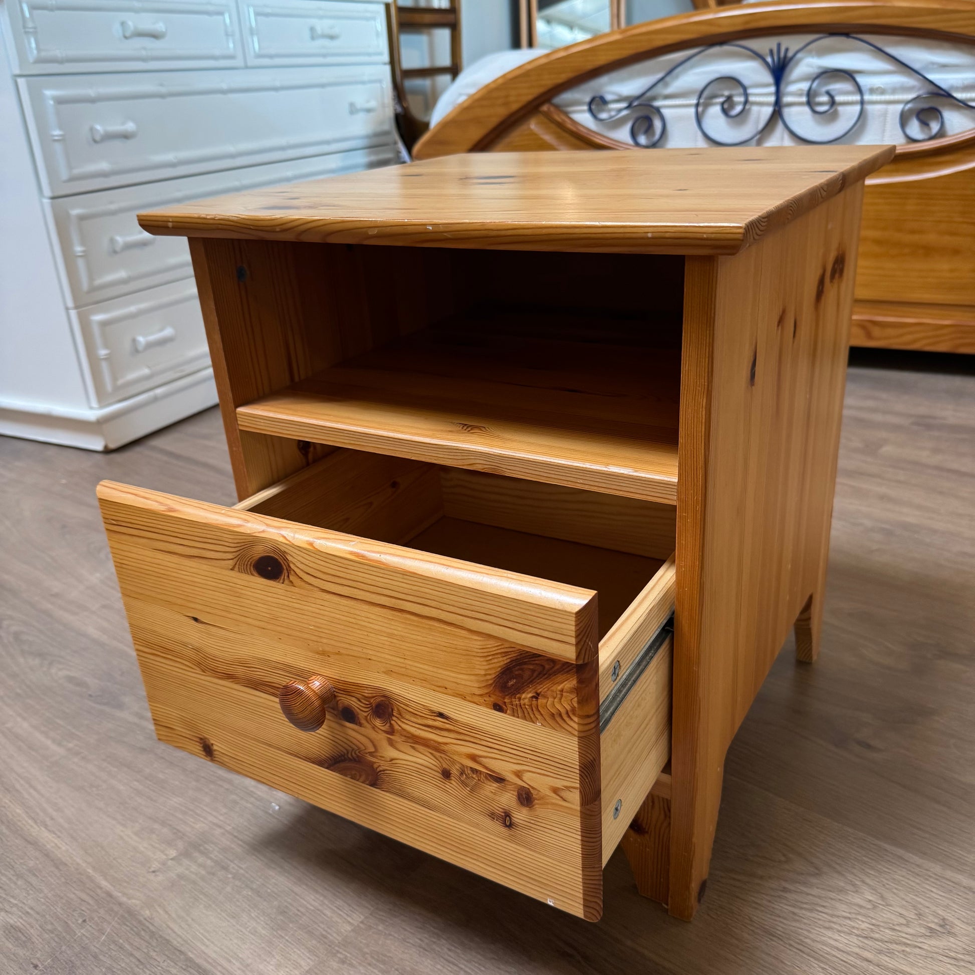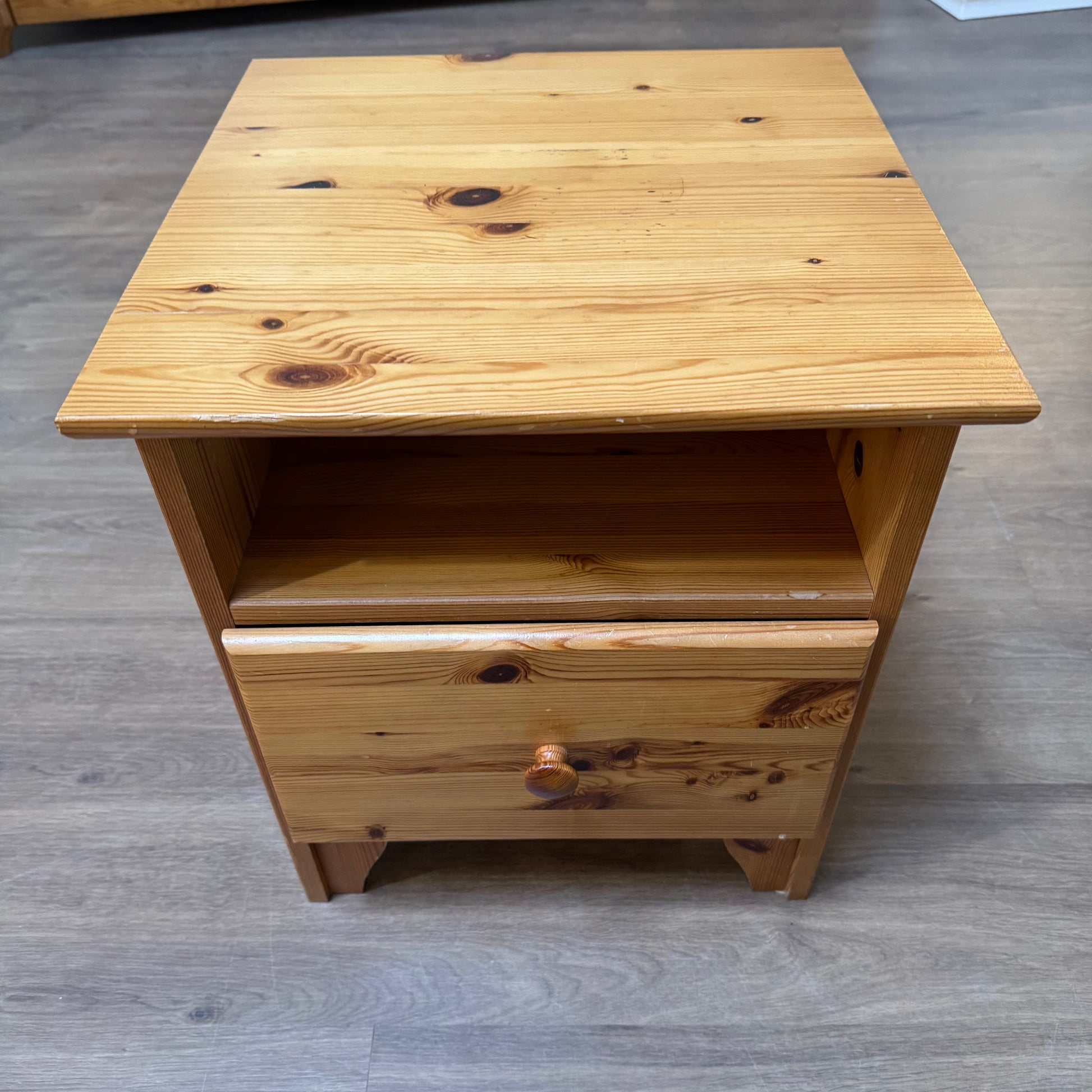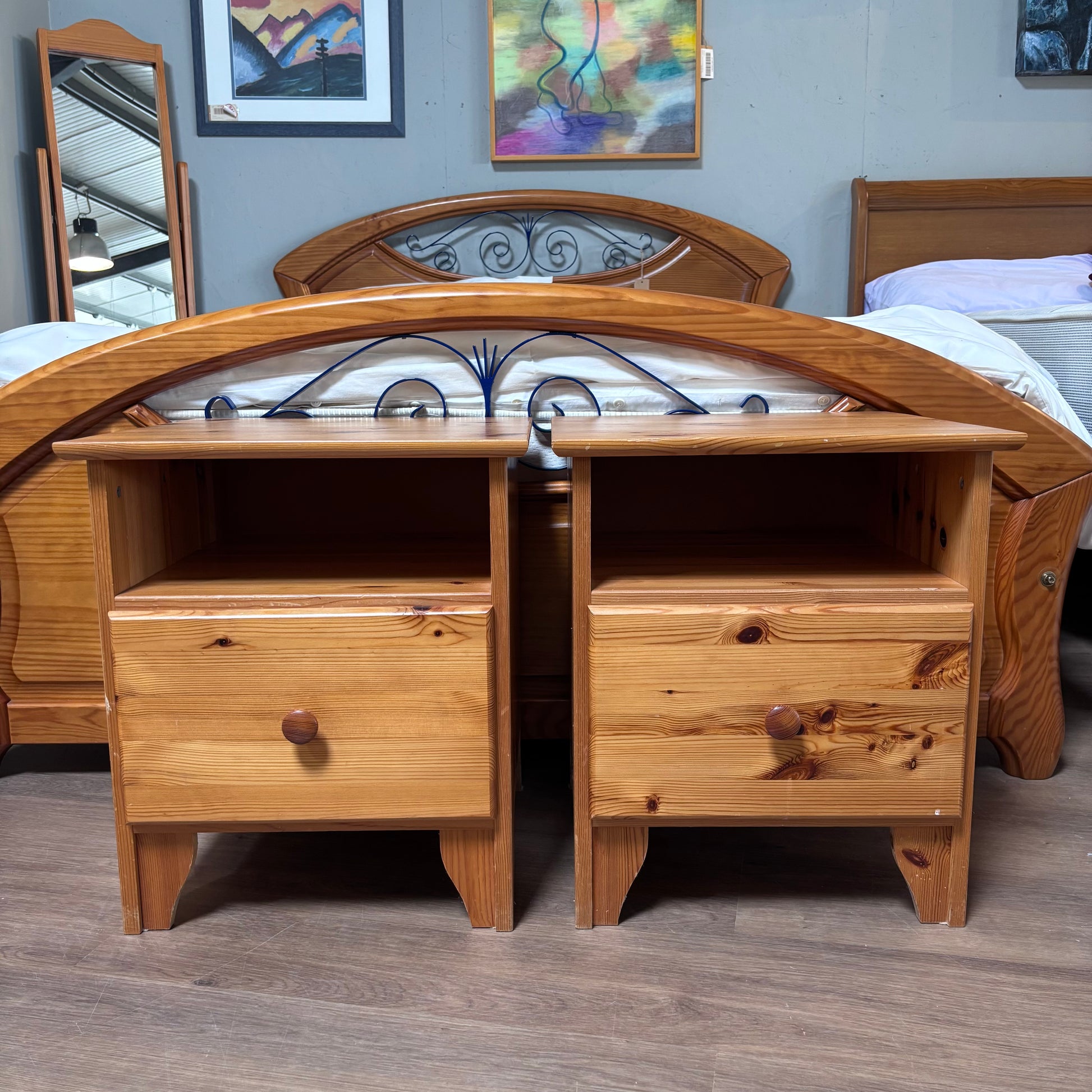 Um par de mesas de cabeceira em pinho com gavetas e tampo aberto, ótimas para adicionar um espaço de arrumação prático e aconchegante ao lado da cama.