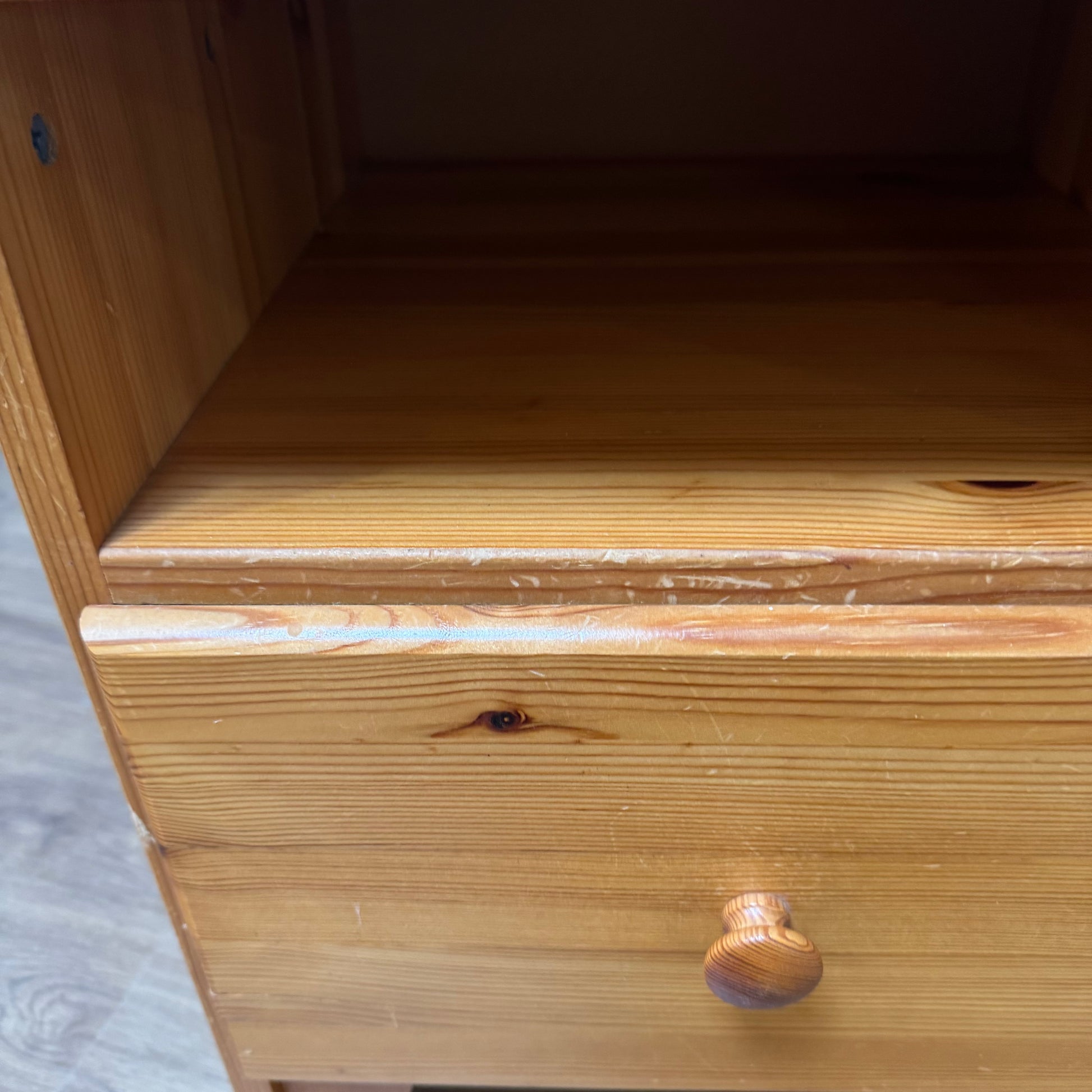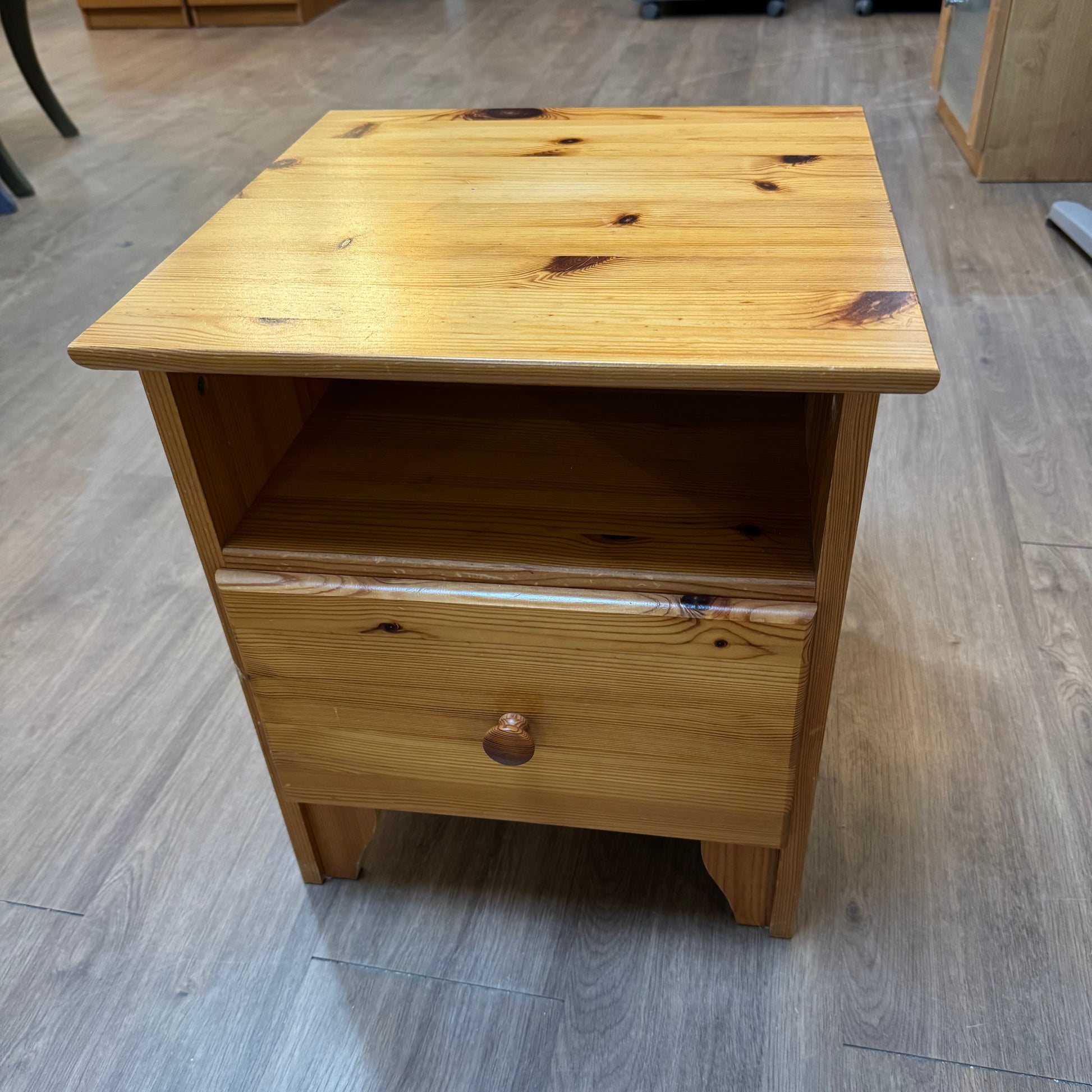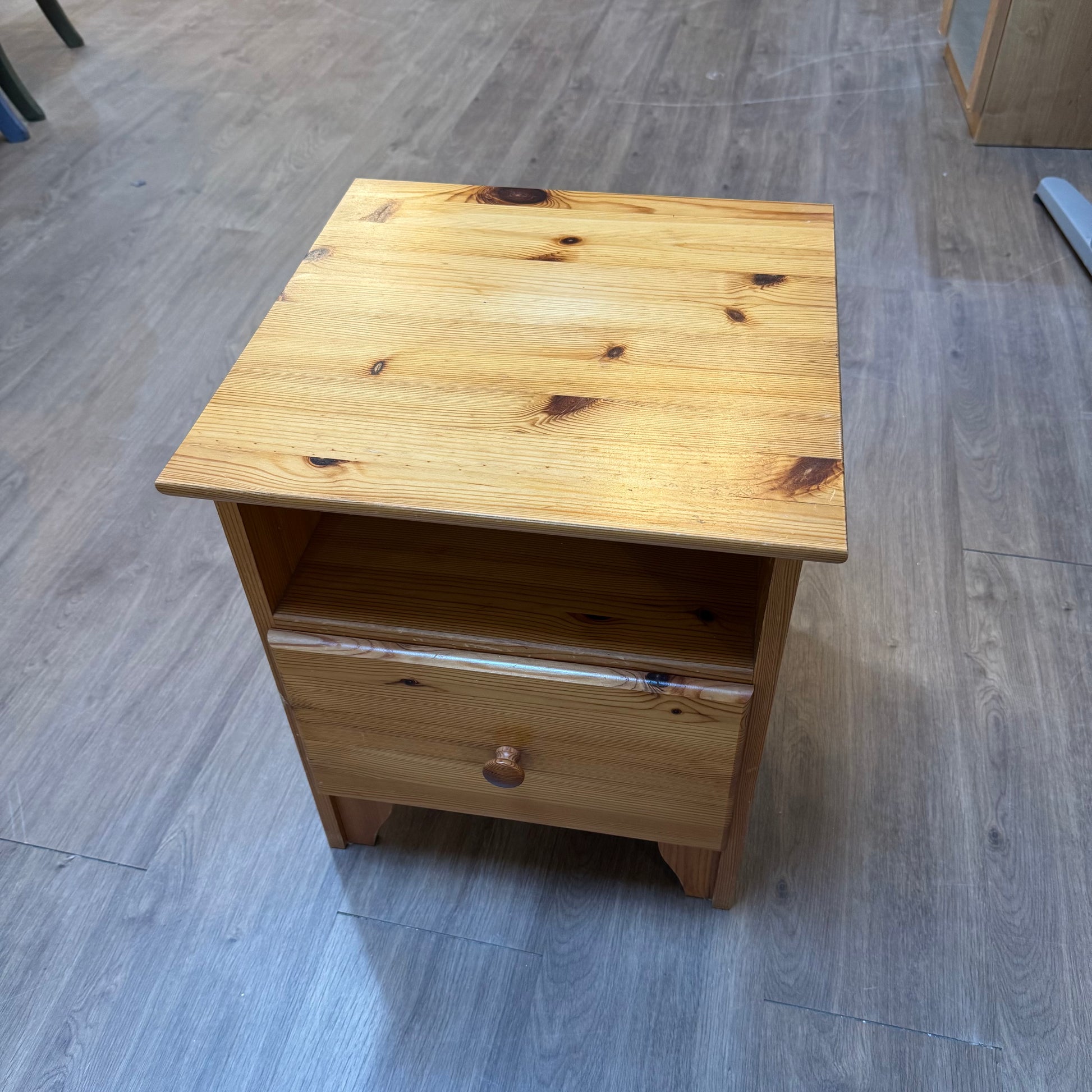 Um par de mesas de cabeceira em pinho com gavetas e tampo aberto, ótimas para adicionar um espaço de arrumação prático e aconchegante ao lado da cama.