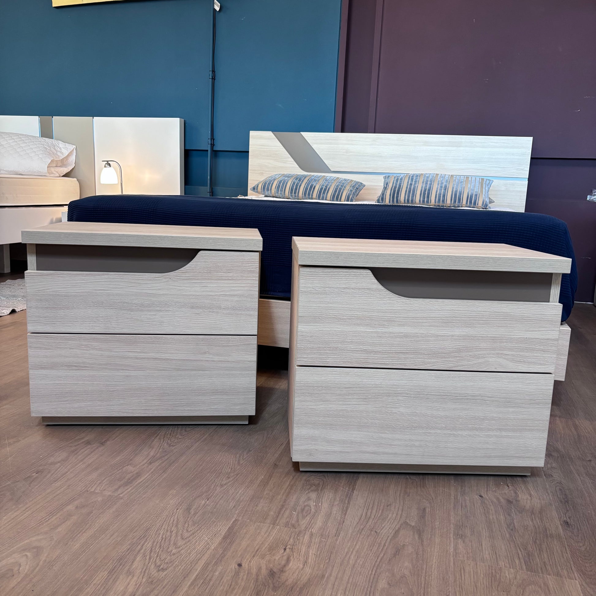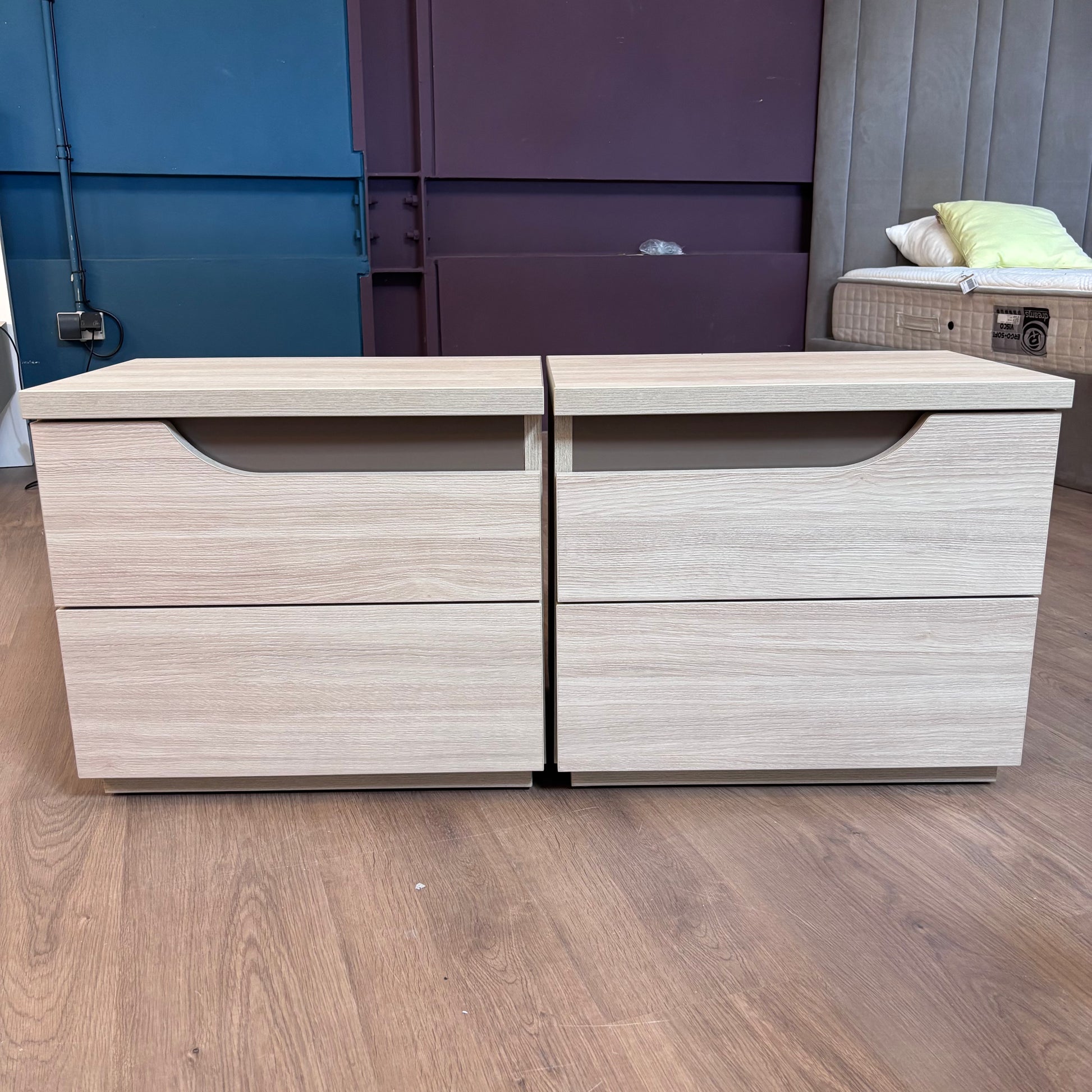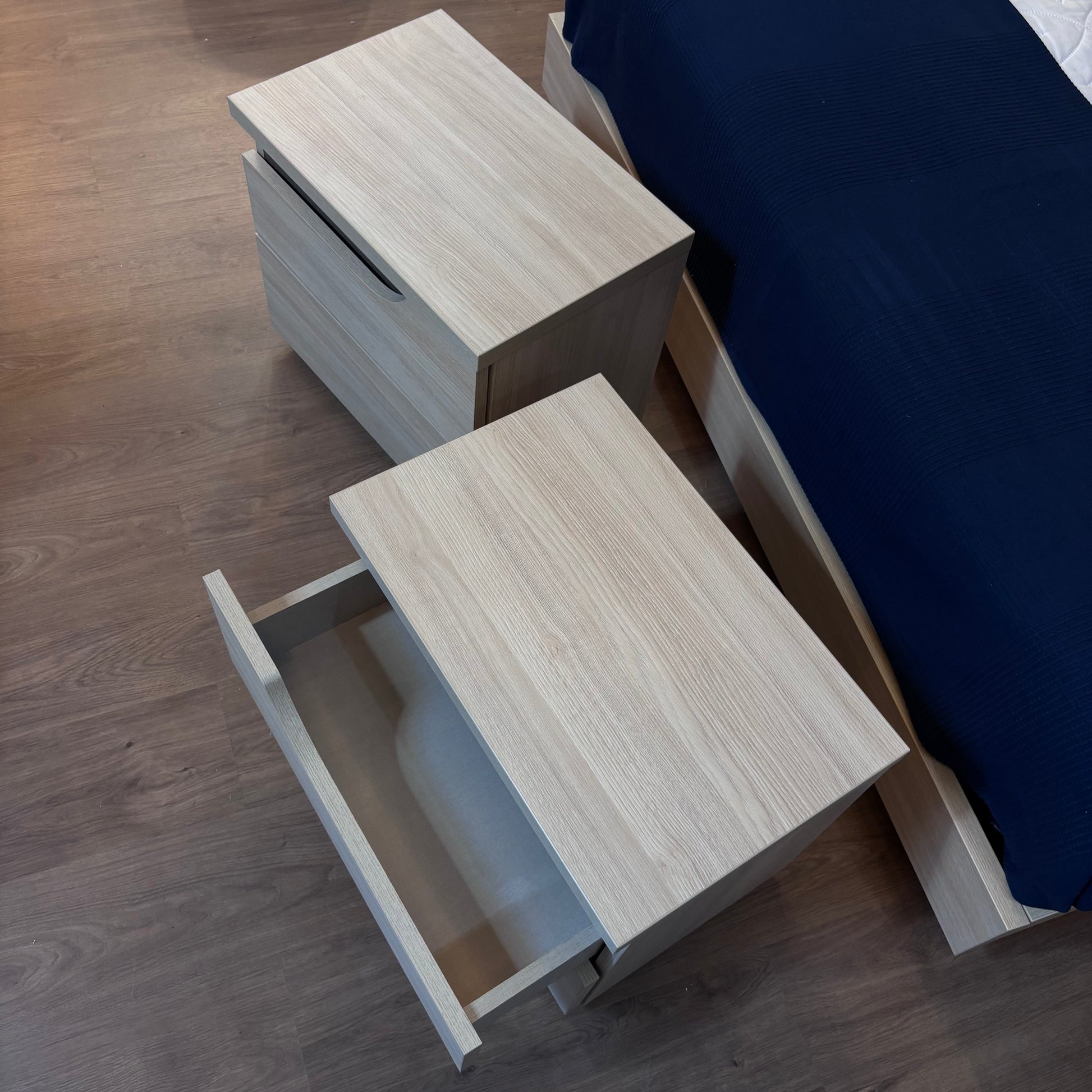 Duas mesas de cabeceira contemporâneas com acabamento em madeira clara, que oferecem uma arrumação prática e um aspeto minimalista para quartos modernos.