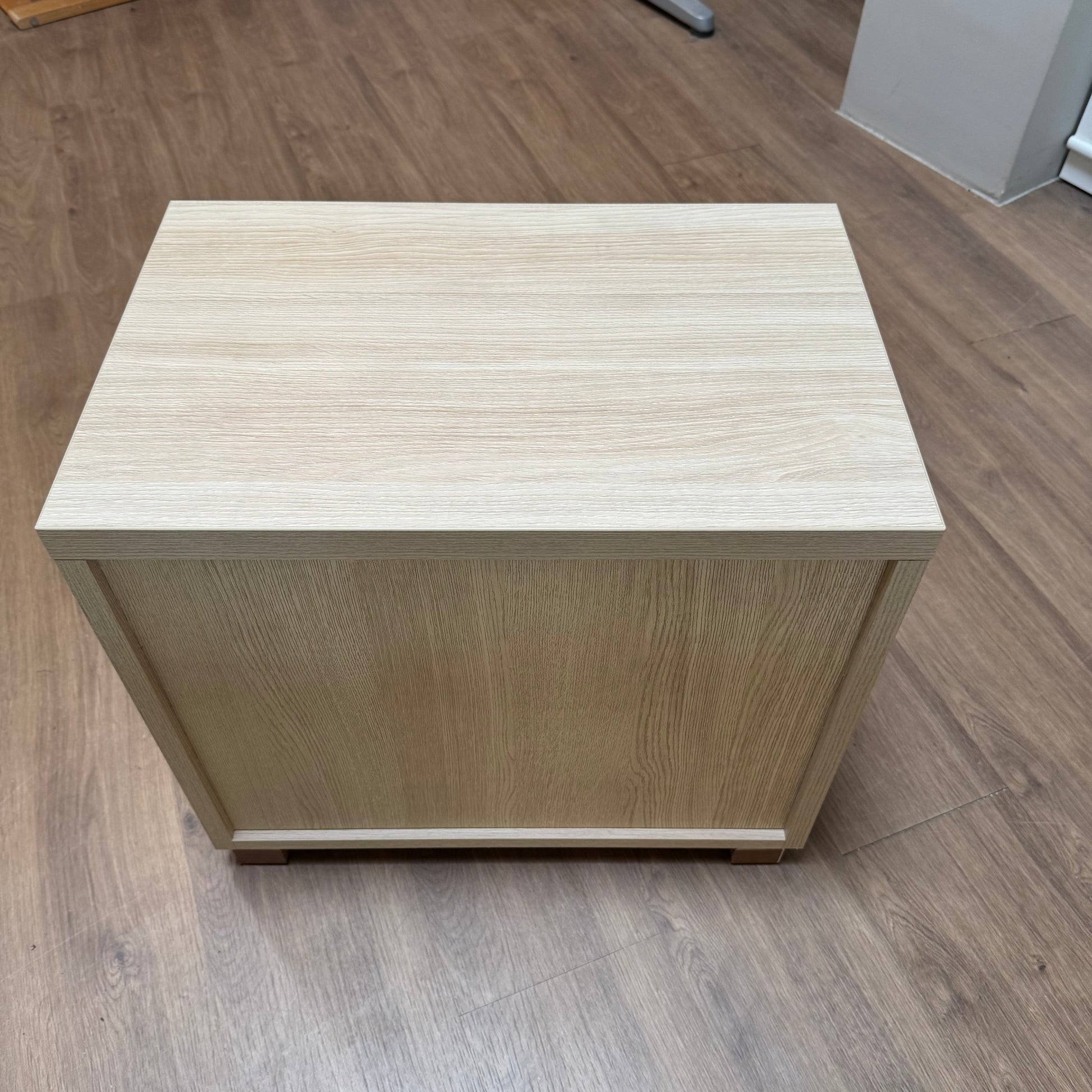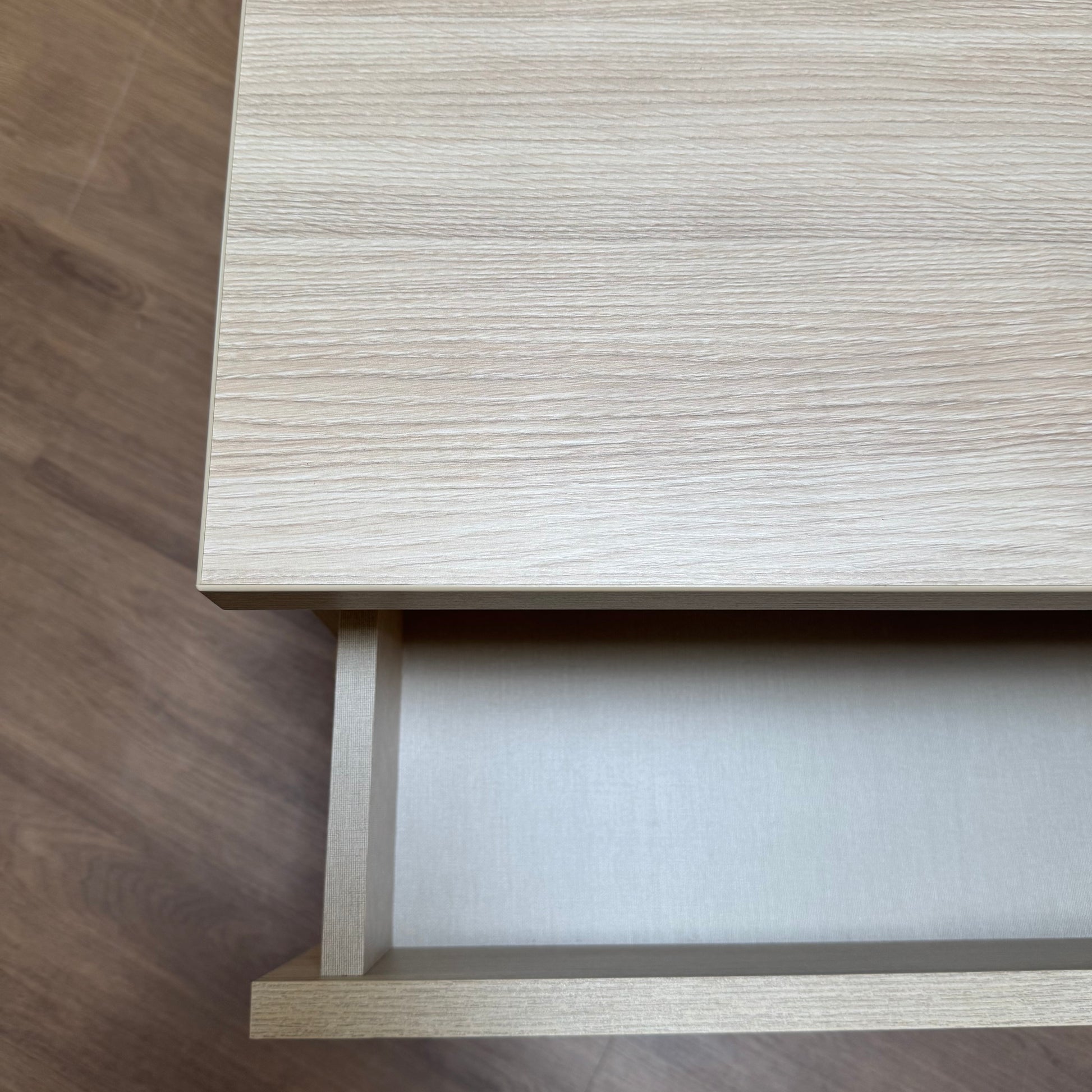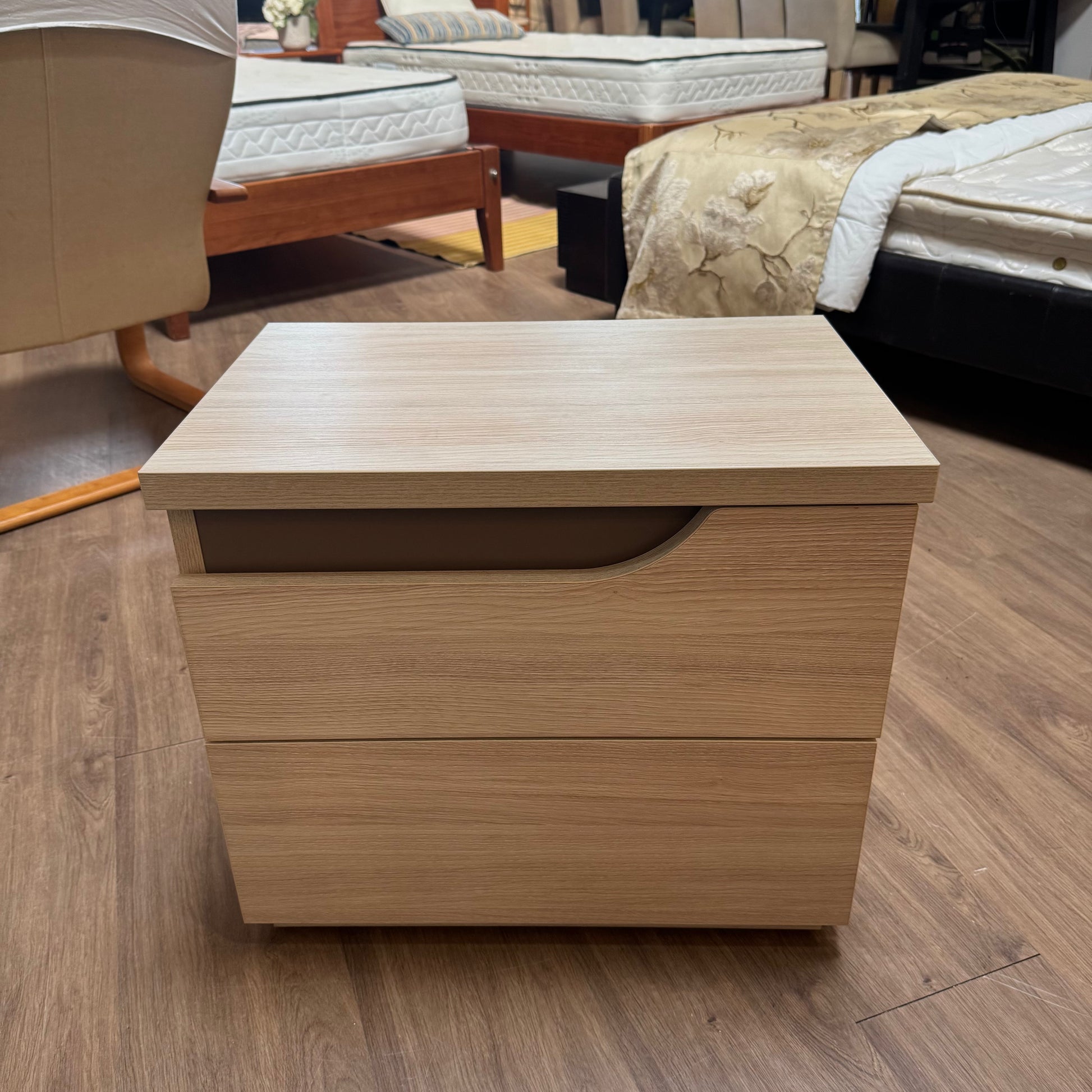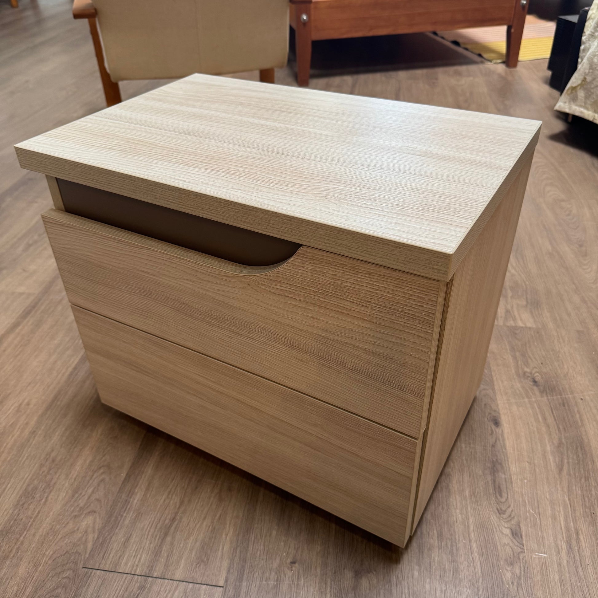 Duas mesas de cabeceira contemporâneas com acabamento em madeira clara, que oferecem uma arrumação prática e um aspeto minimalista para quartos modernos.
