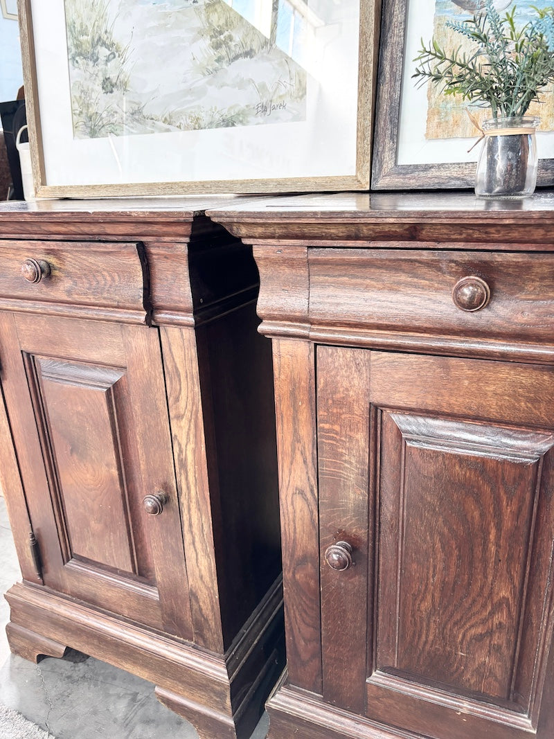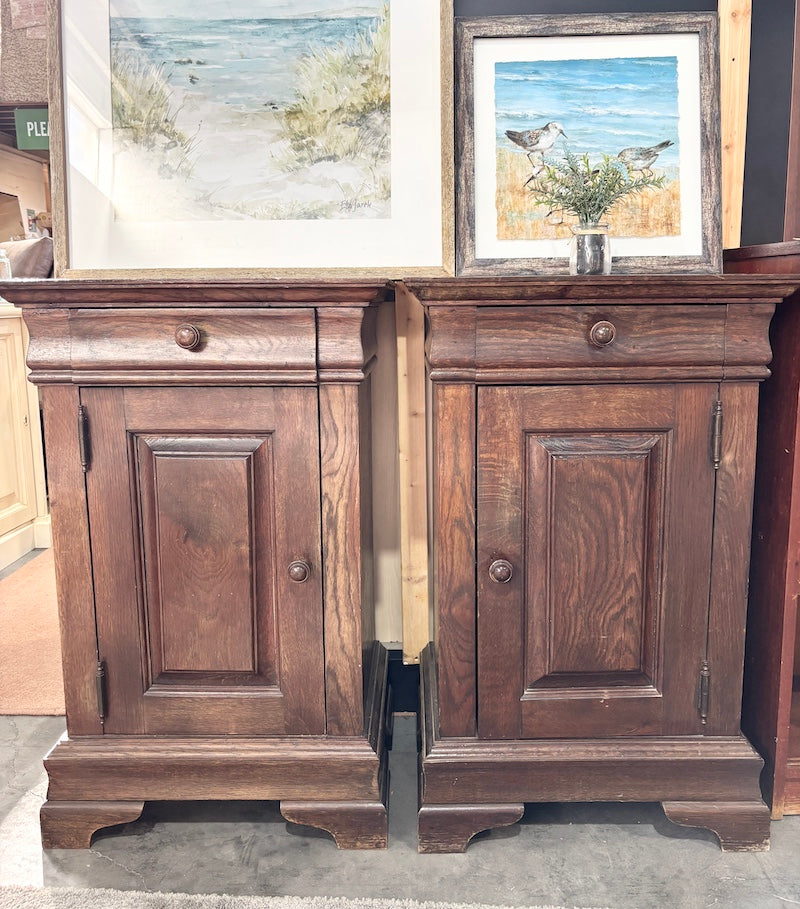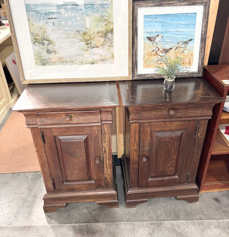 Um par de mesas de cabeceira em madeira maciça escura, com uma gaveta cada, sobre um amplo armário. Os veios da madeira e o trabalho artesanal tradicional são evidentes nestas peças.