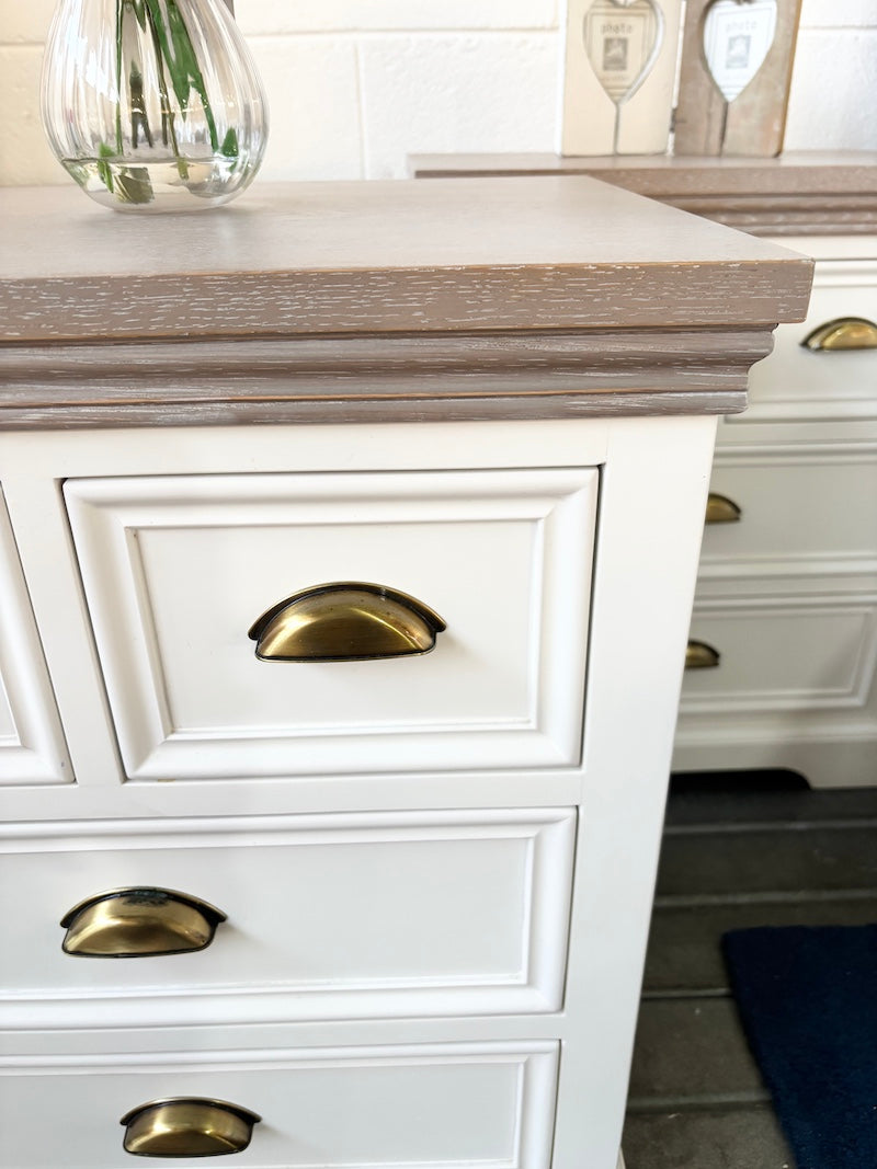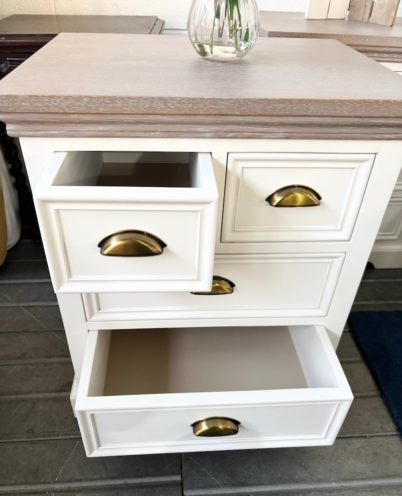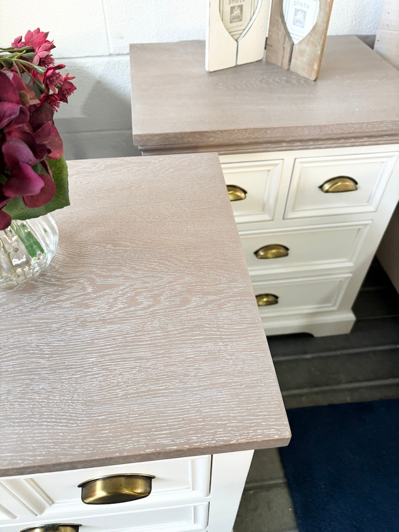 Um par de mesas de cabeceira de grandes dimensões, de estilo campestre contemporâneo, com quatro gavetas cada, todas com puxadores em cor latão. São em madeira pintada de branco com acabamento em cera de cal no tampo.