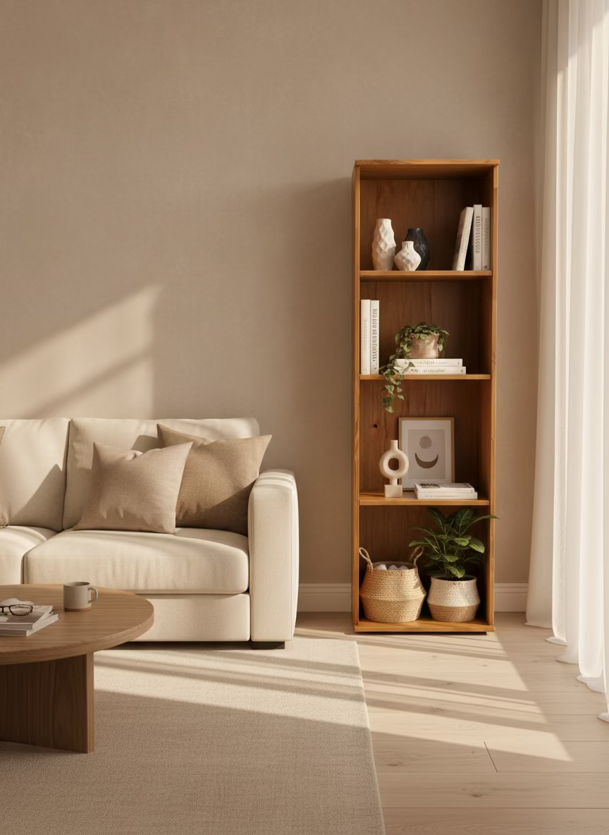 Estante alta em tom de madeira quente, ideal para otimizar o espaço vertical e expor livros, plantas ou objetos decorativos.