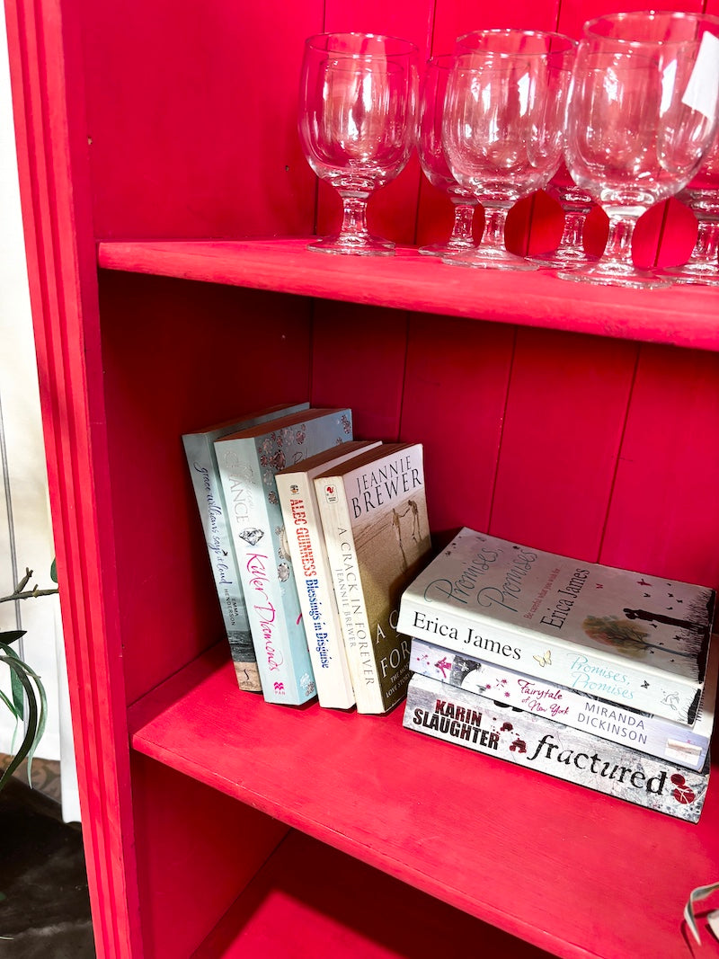 Esta alta estante de madeira em estilo rústico, com painel traseiro, foi pintada de vermelho vivo. Possui quatro prateleiras e pés redondos.