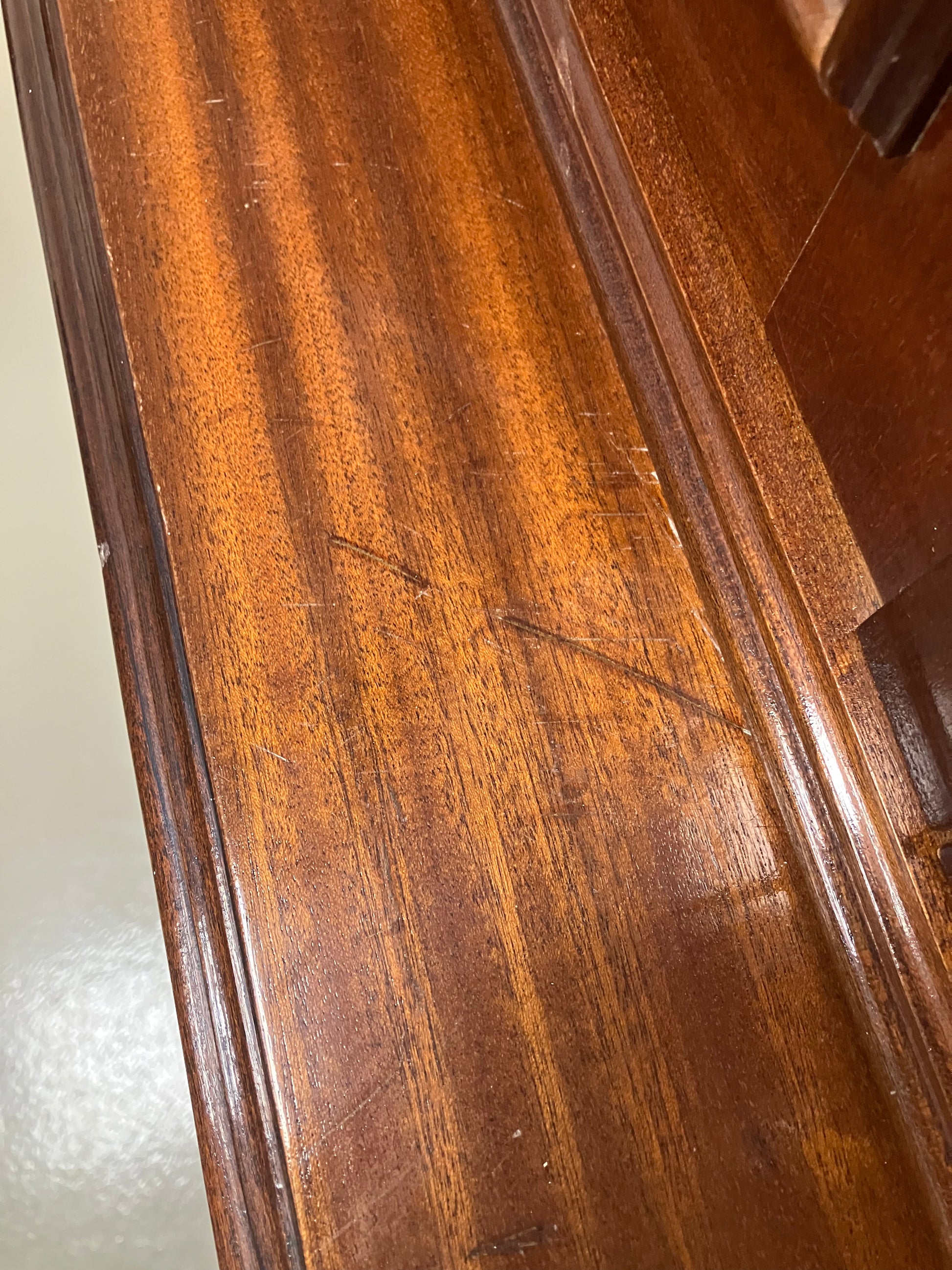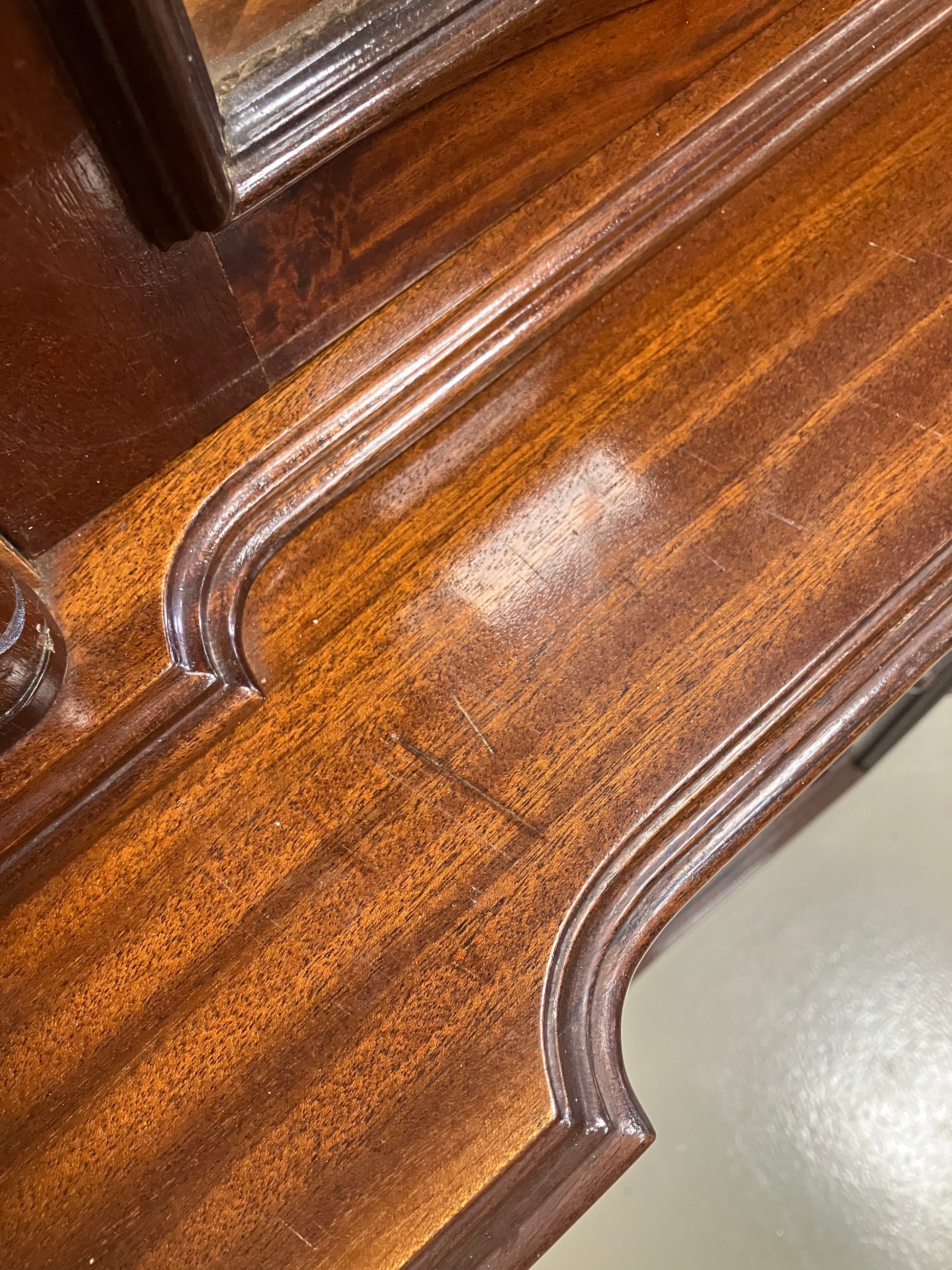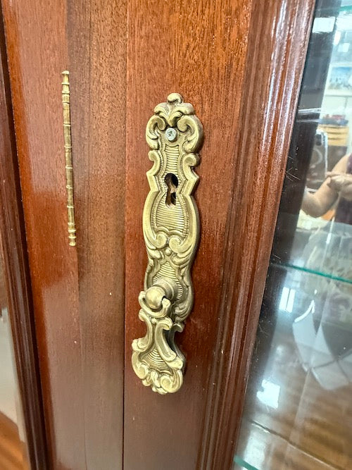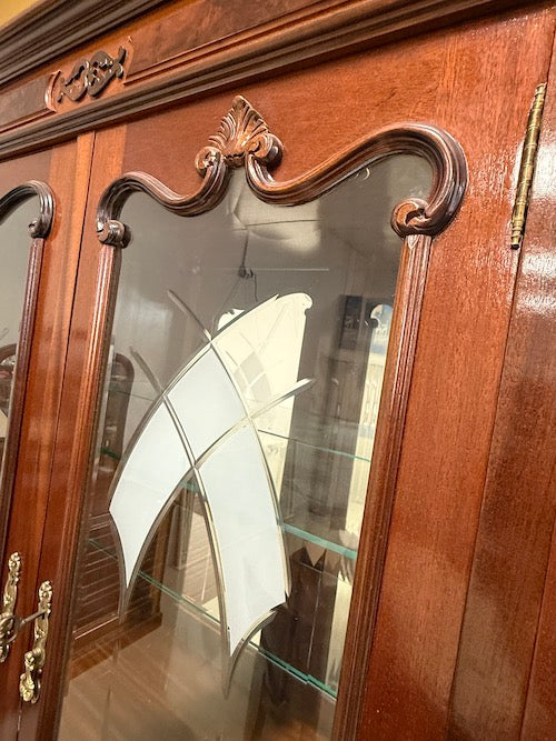 Esta vitrina em folheado de mogno possui painéis laterais de vidro curvo e quatro portas envidraçadas com inserções de vidro biselado, perfeitas para expor artigos de vidro, porcelana ou artigos de coleção. No interior, os fundos espelhados e as prateleiras de vidro realçam a luz e criam uma sensação de profundidade.