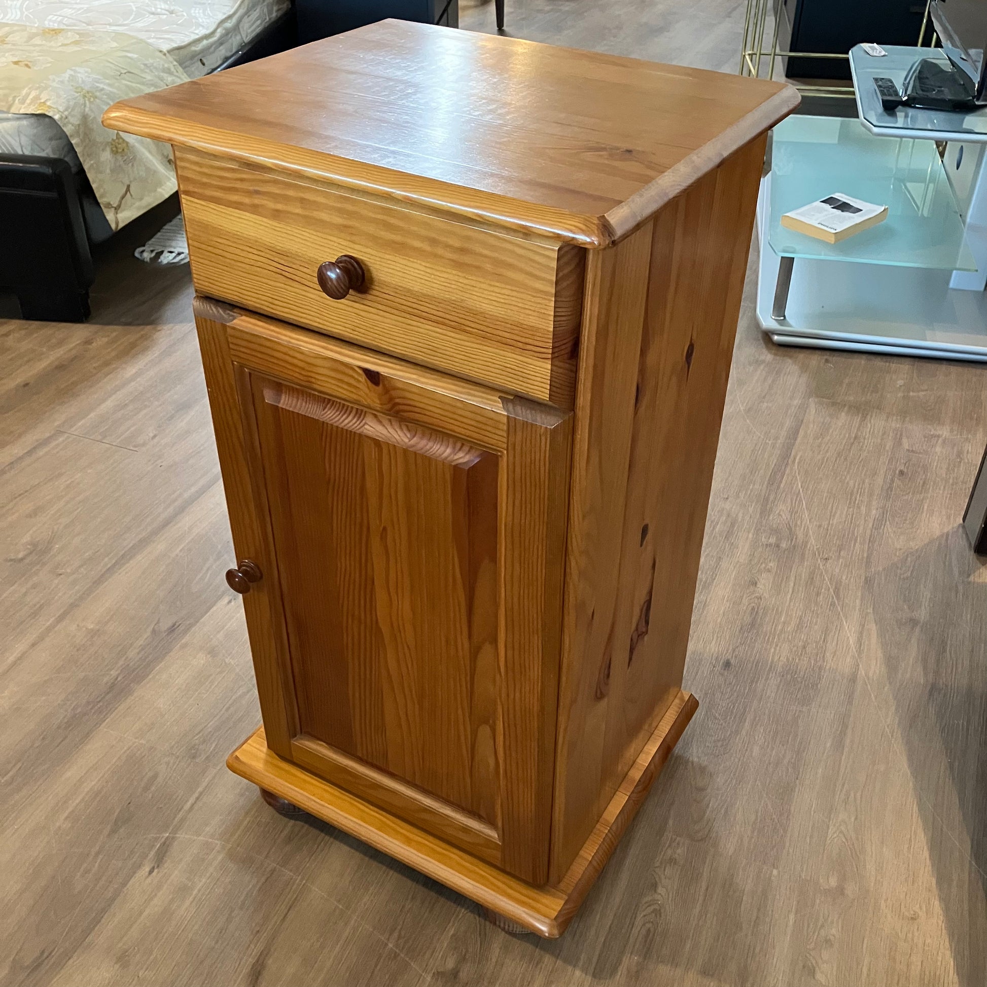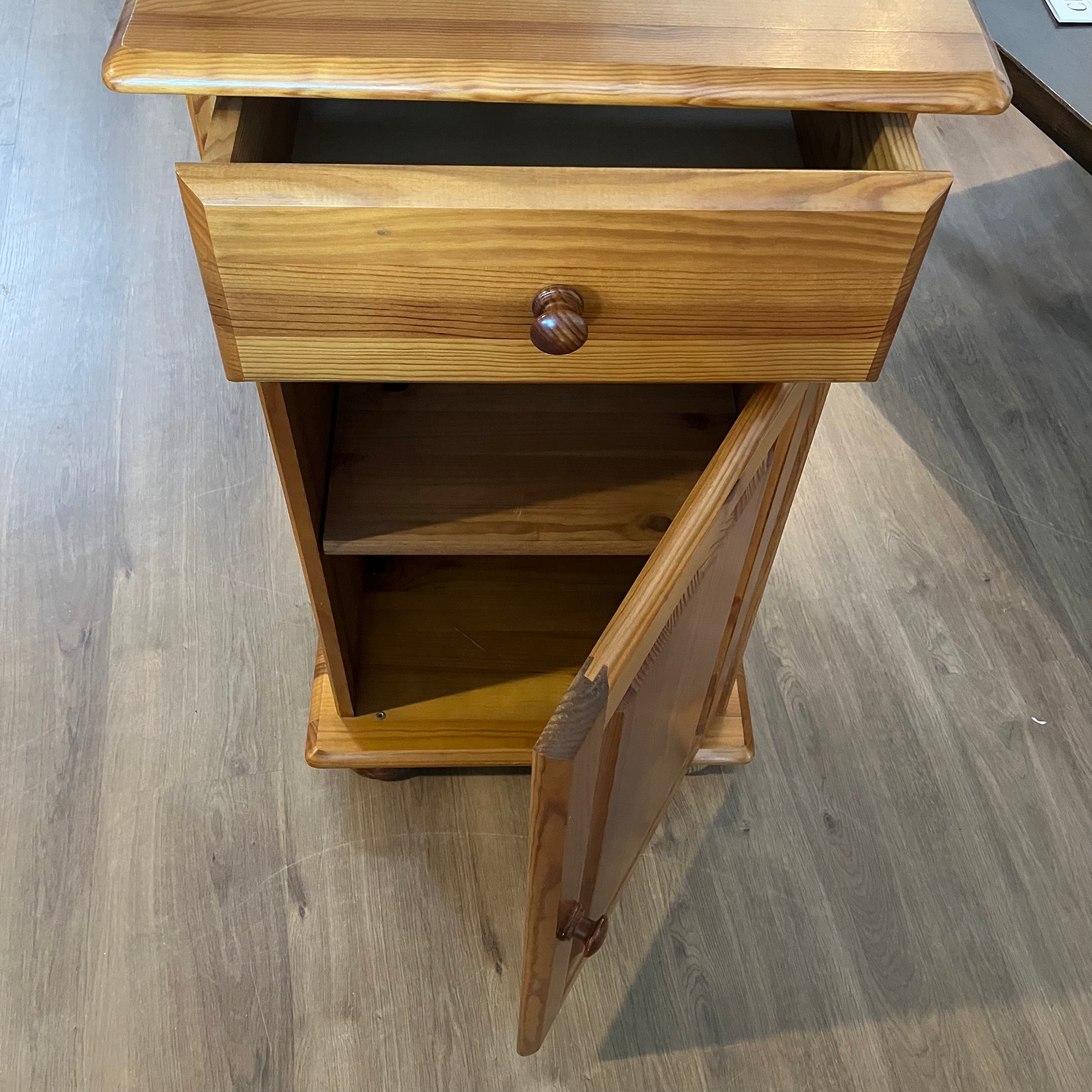 Um armário compacto de madeira maciça com um acabamento natural aconchegante, com uma gaveta e um armário para uma arrumação prática. Uma peça versátil, ideal para corredores, quartos ou salas de estar.