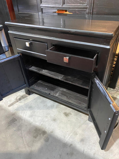 Um pequeno armário laqueado preto com um armário e duas gavetas no estilo oriental simples. Os cabos de aço escovado acrescentam um contraste moderno e marcante à madeira escura.