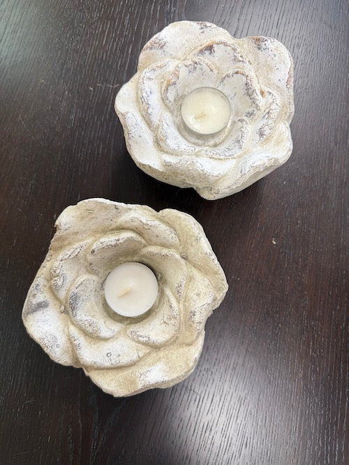 Um par de porta-candeeiros em cerâmica em forma de T, com aspeto e toque de pedra. São mais bonitos ao perto, mas as fotos não lhe fazem justiça.