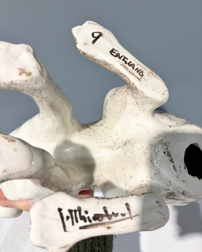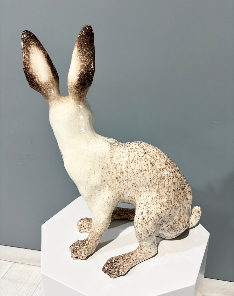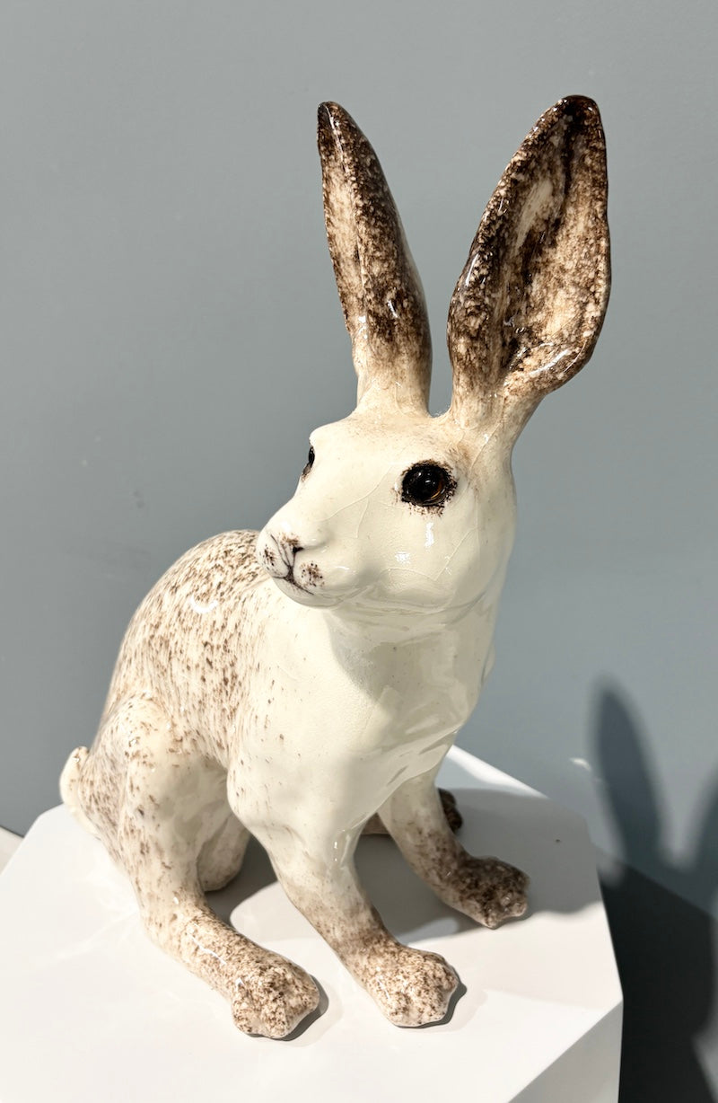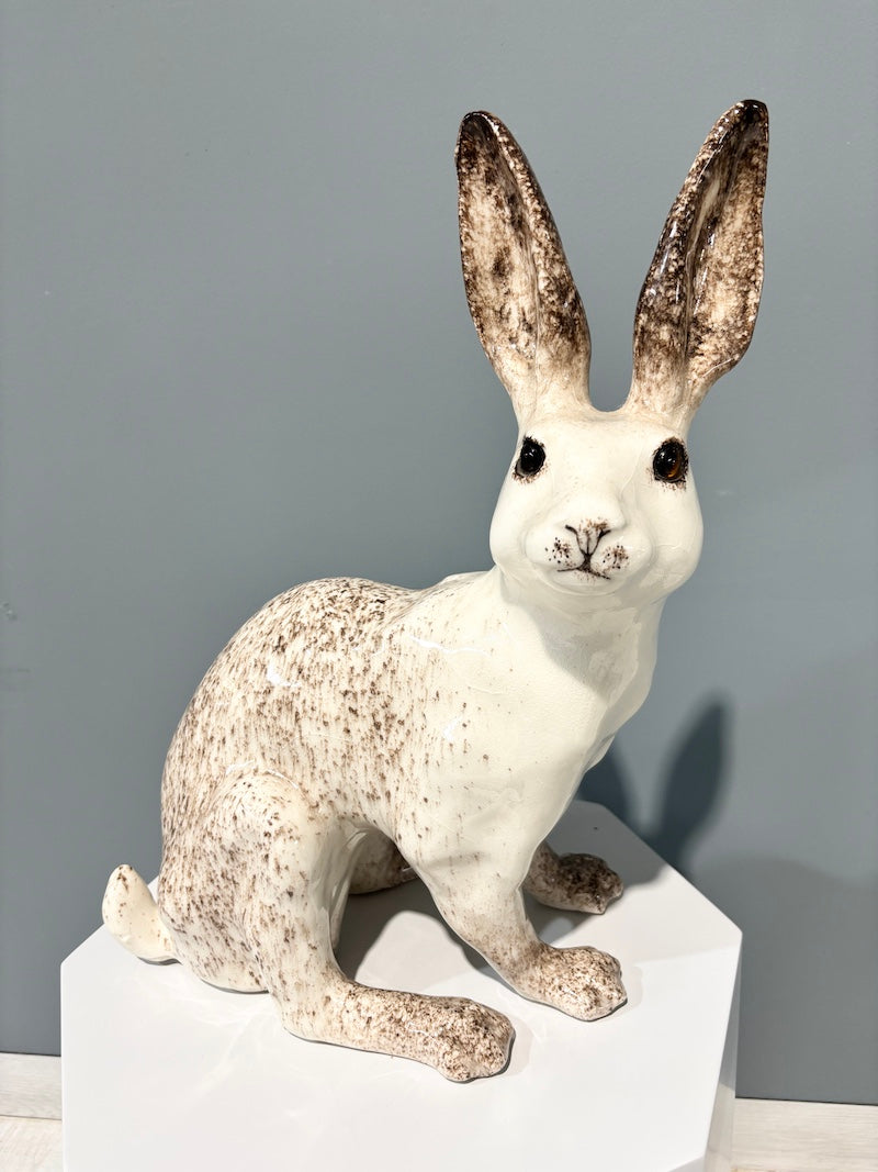 Este é um ornamento de cerâmica artesanal altamente colecionável, feito por Jenny Winstanley em Norfolk. Esta lebre é branca com as costas e as patas salpicadas de castanho e tem olhos de vidro. Está assinado na base e tem o tamanho 9. Um bonito ornamento que ficaria lindo exposto na sua prateleira ou como um ótimo complemento para a sua coleção.