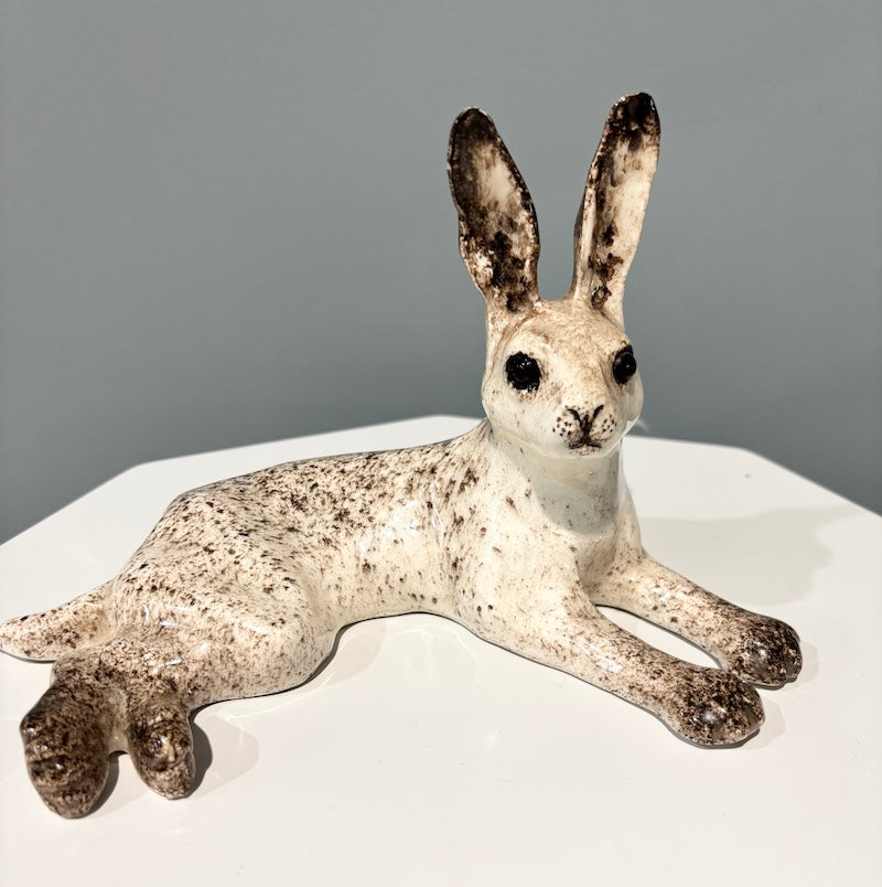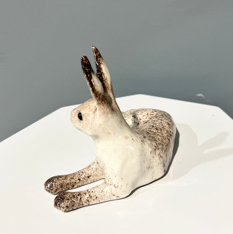 Este é um ornamento de cerâmica artesanal altamente colecionável, feito por Jenny Winstanley em Norfolk. Esta lebre é branca com as costas e as patas salpicadas de castanho e tem olhos de vidro. Está assinada na base e tem o tamanho 3. Um belo ornamento que ficaria lindo exposto na sua prateleira ou como um ótimo complemento para a sua coleção.