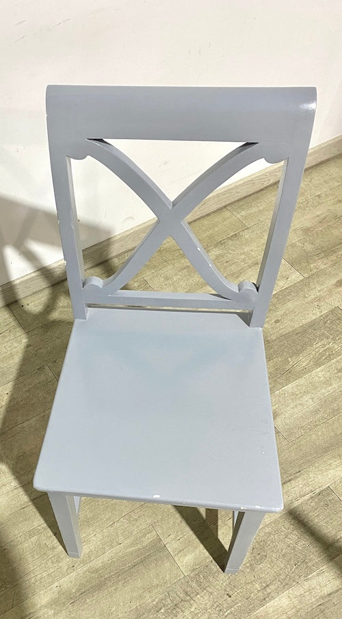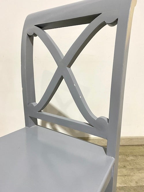 Uma cadeira simples de madeira maciça pintada de cinza brilhante.