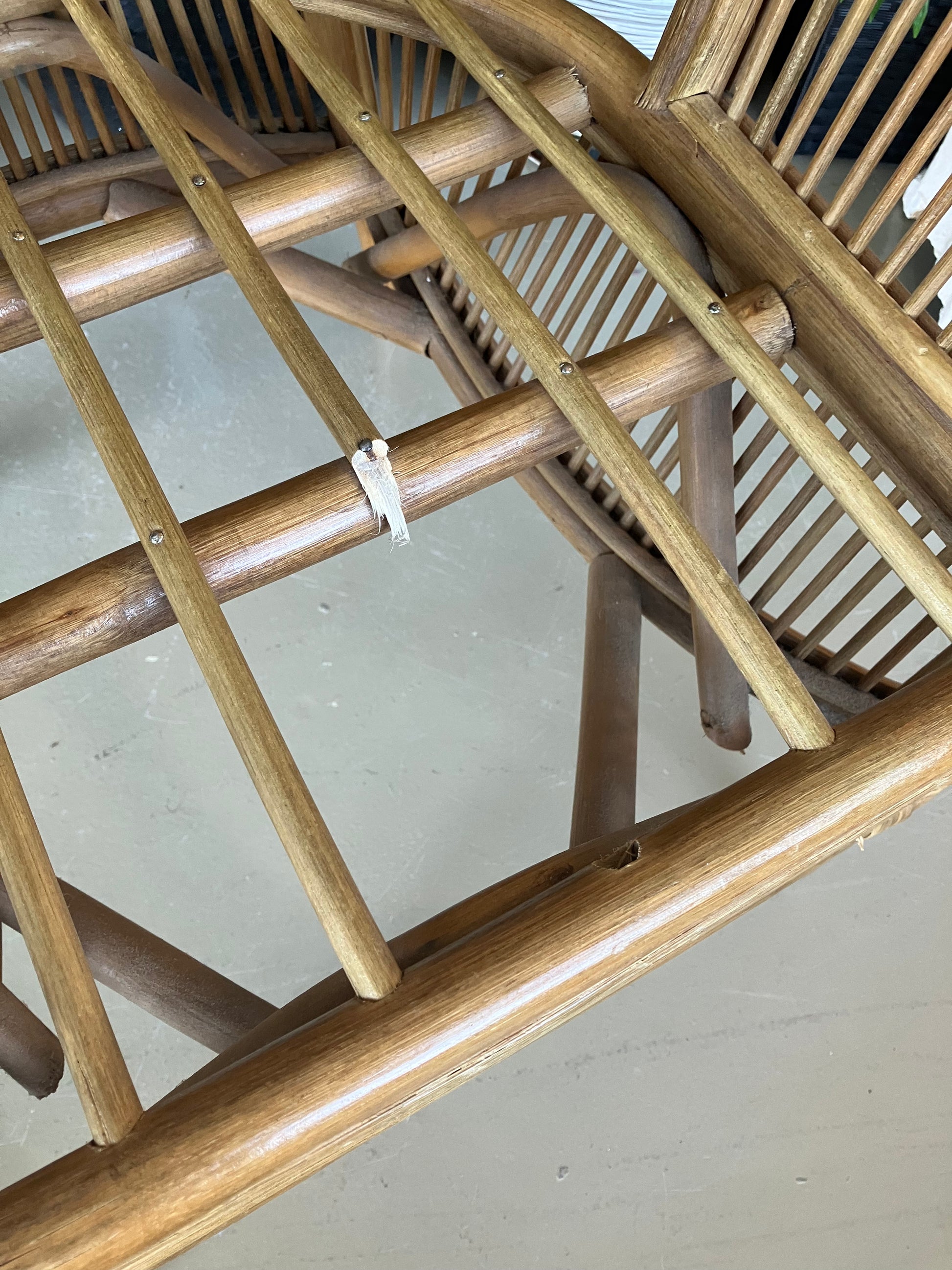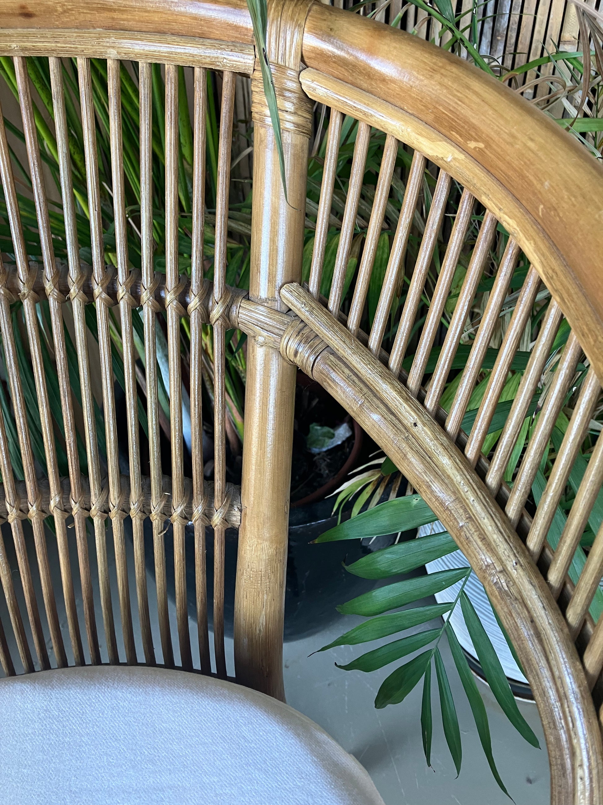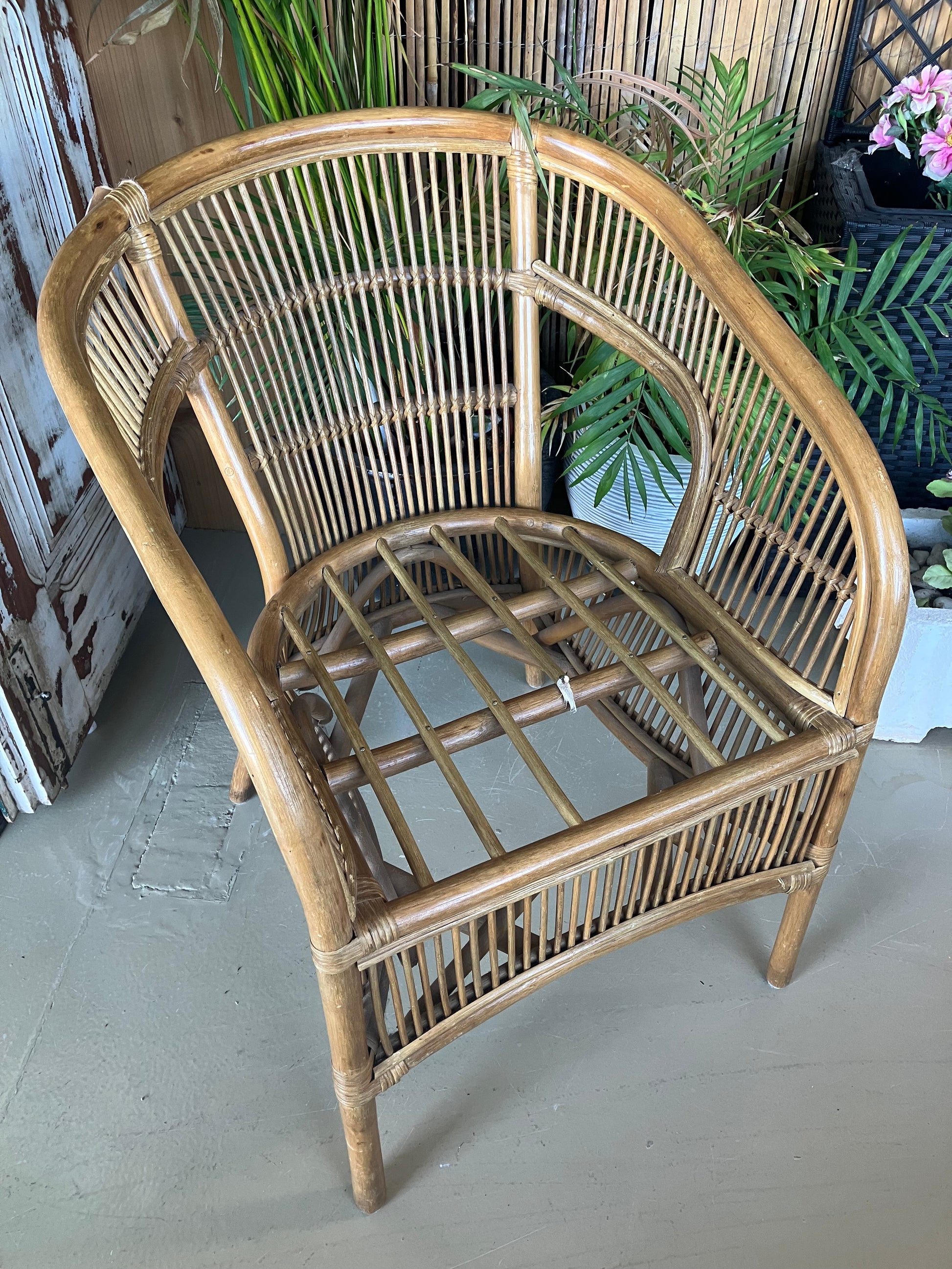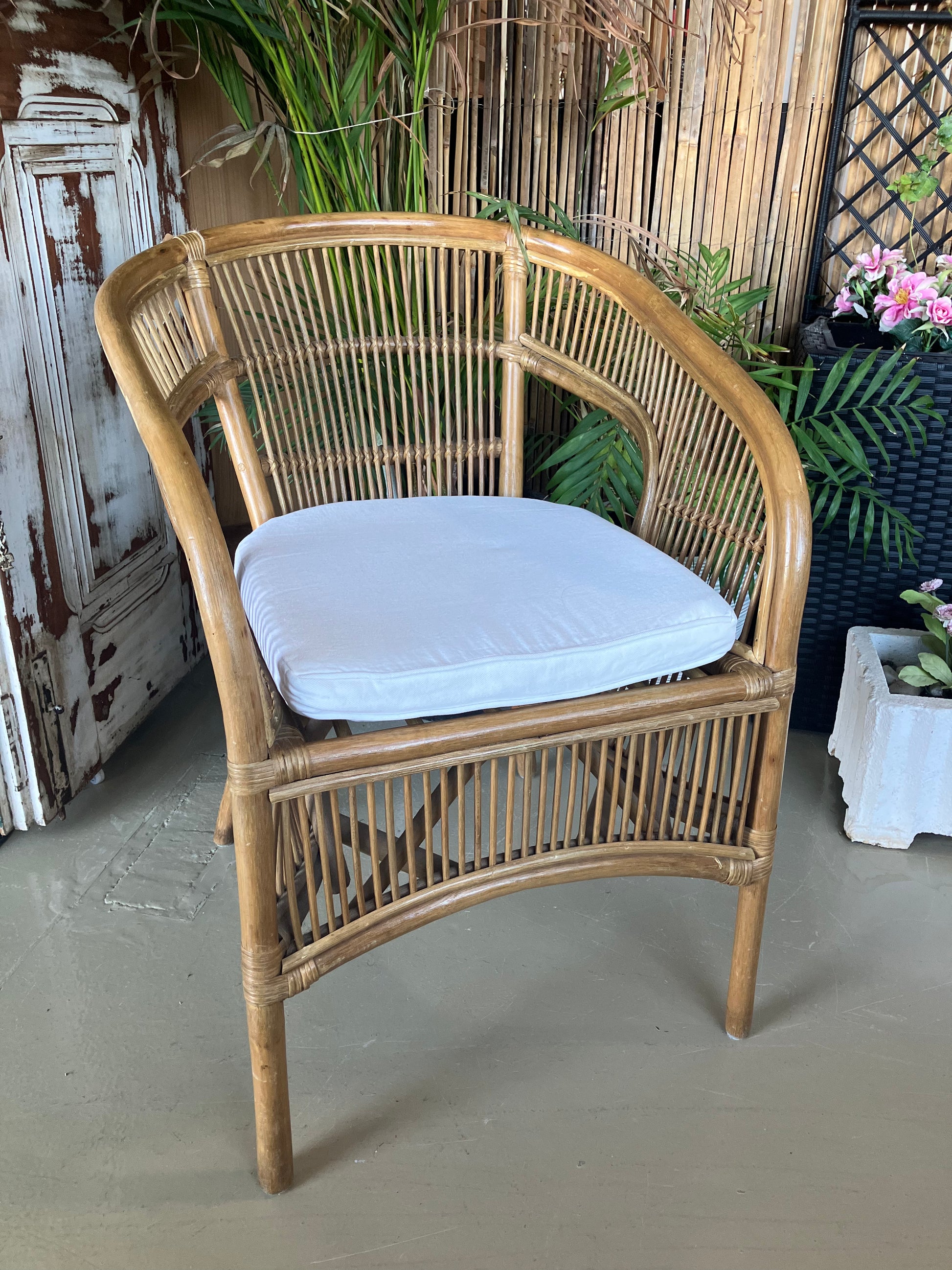 Uma cadeira de bambu natural com um toque fresco e arejado, com uma almofada branca macia para maior conforto. Uma peça encantadora que combina o charme descontraído e costeiro com um estilo intemporal.
