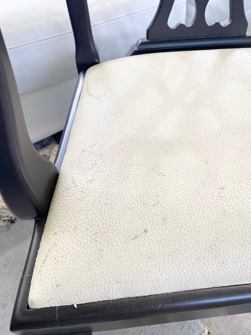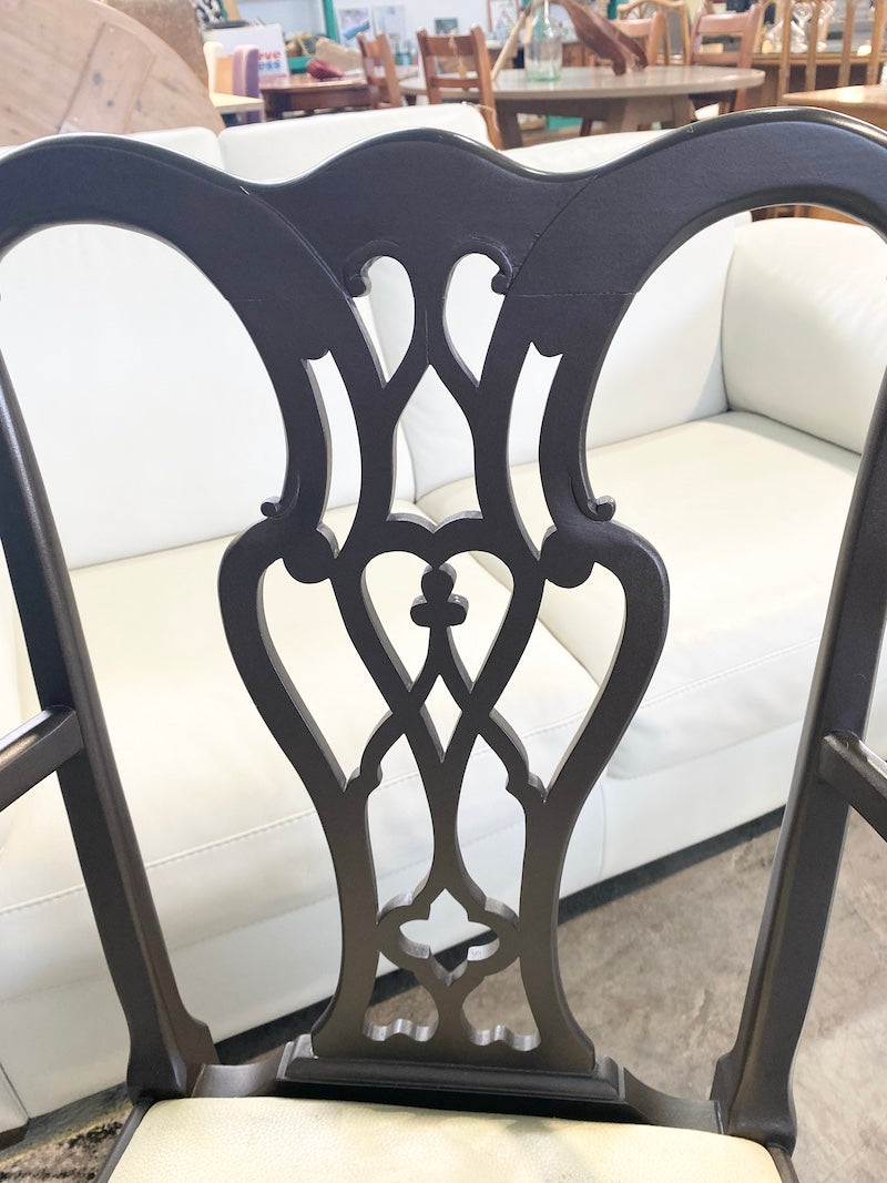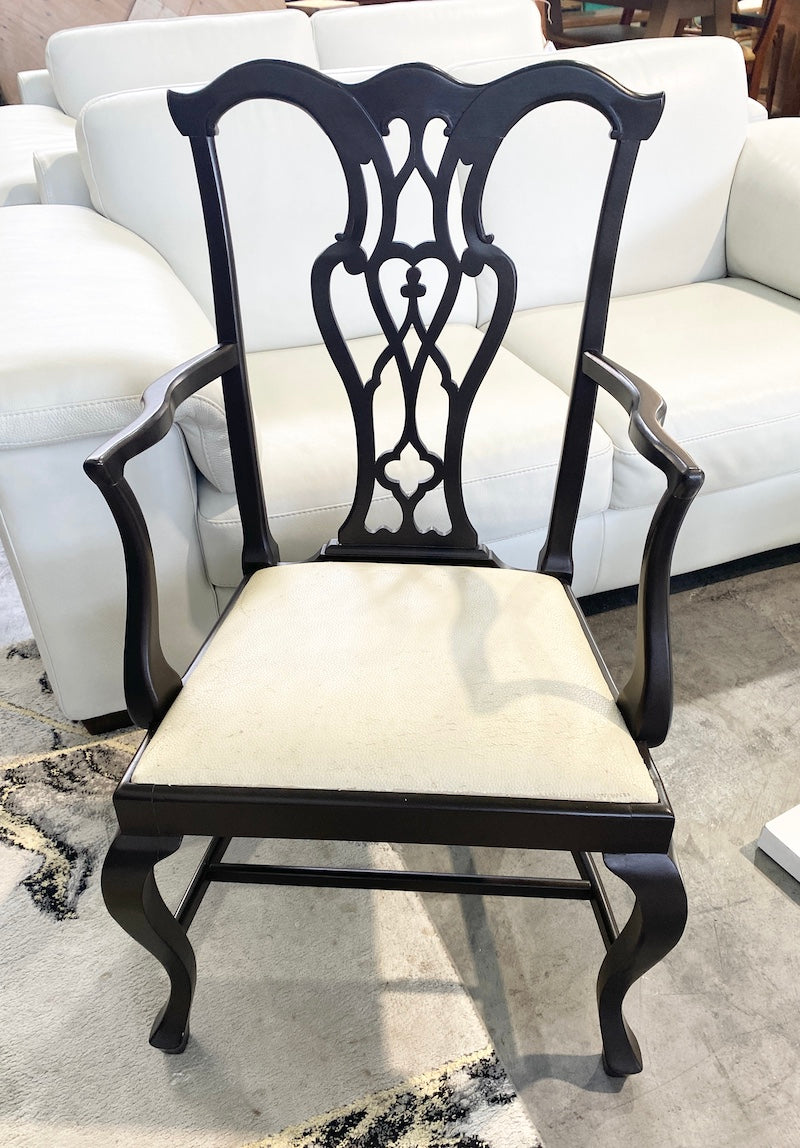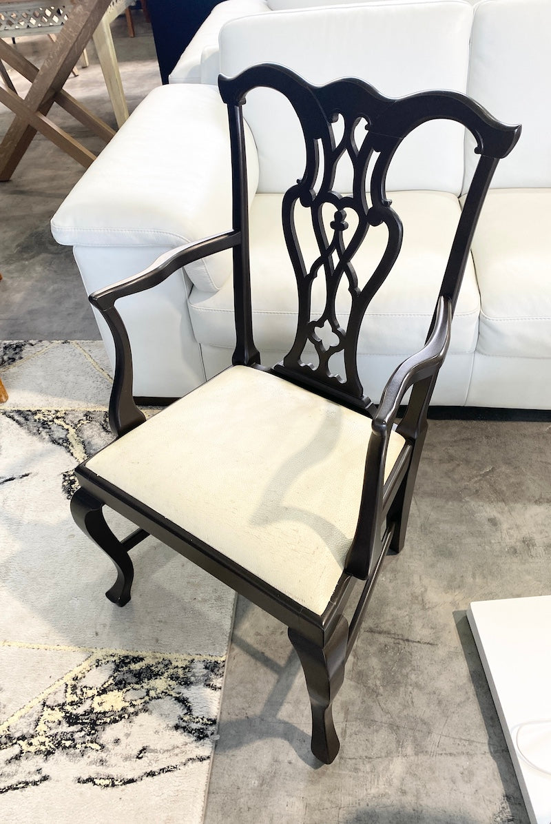Esta cadeira preta feita à medida apresenta um encosto com um padrão graciosamente curvo, pernas elegantemente arqueadas e um assento estofado aconchegante em cor creme para o seu conforto.