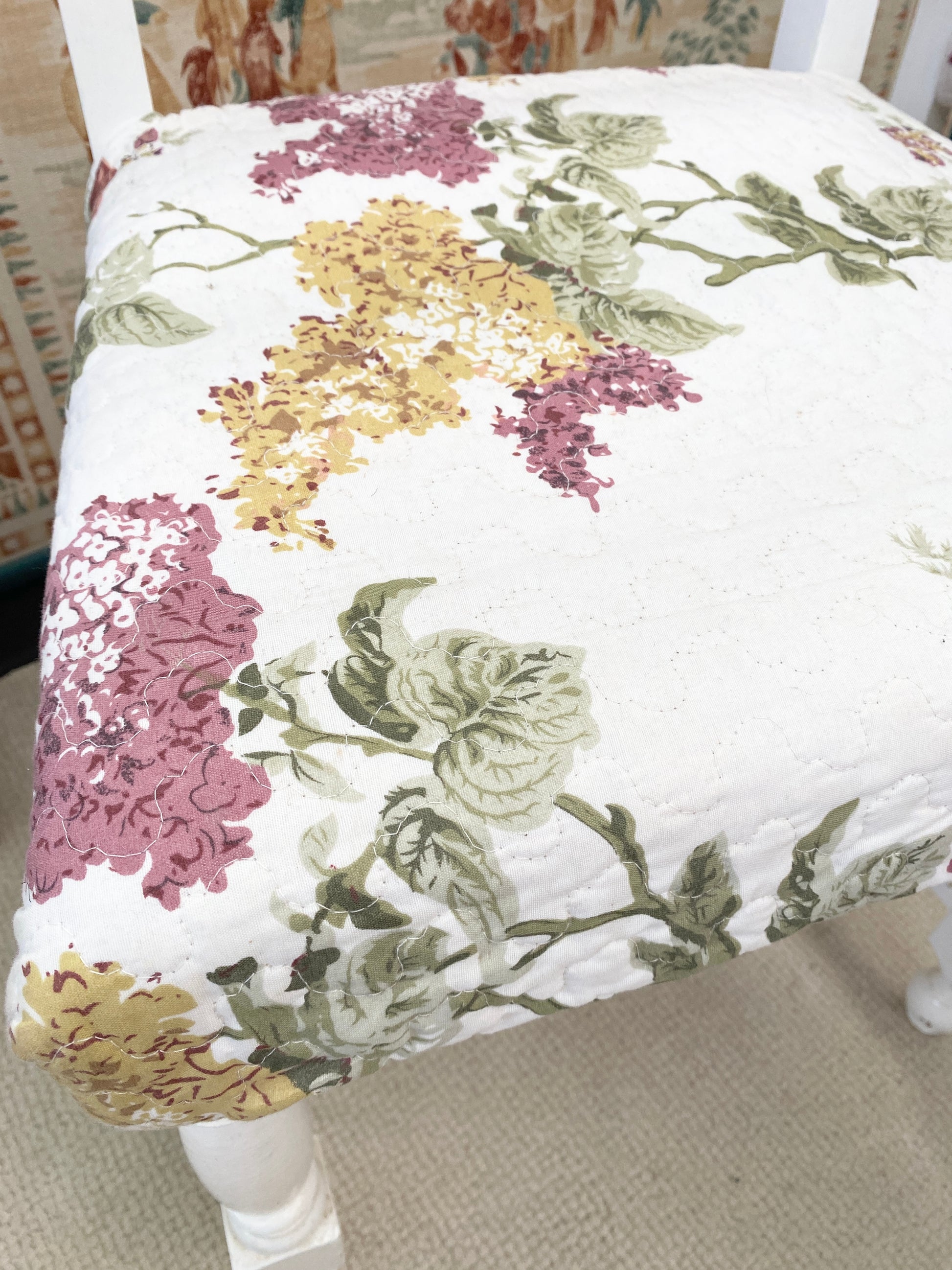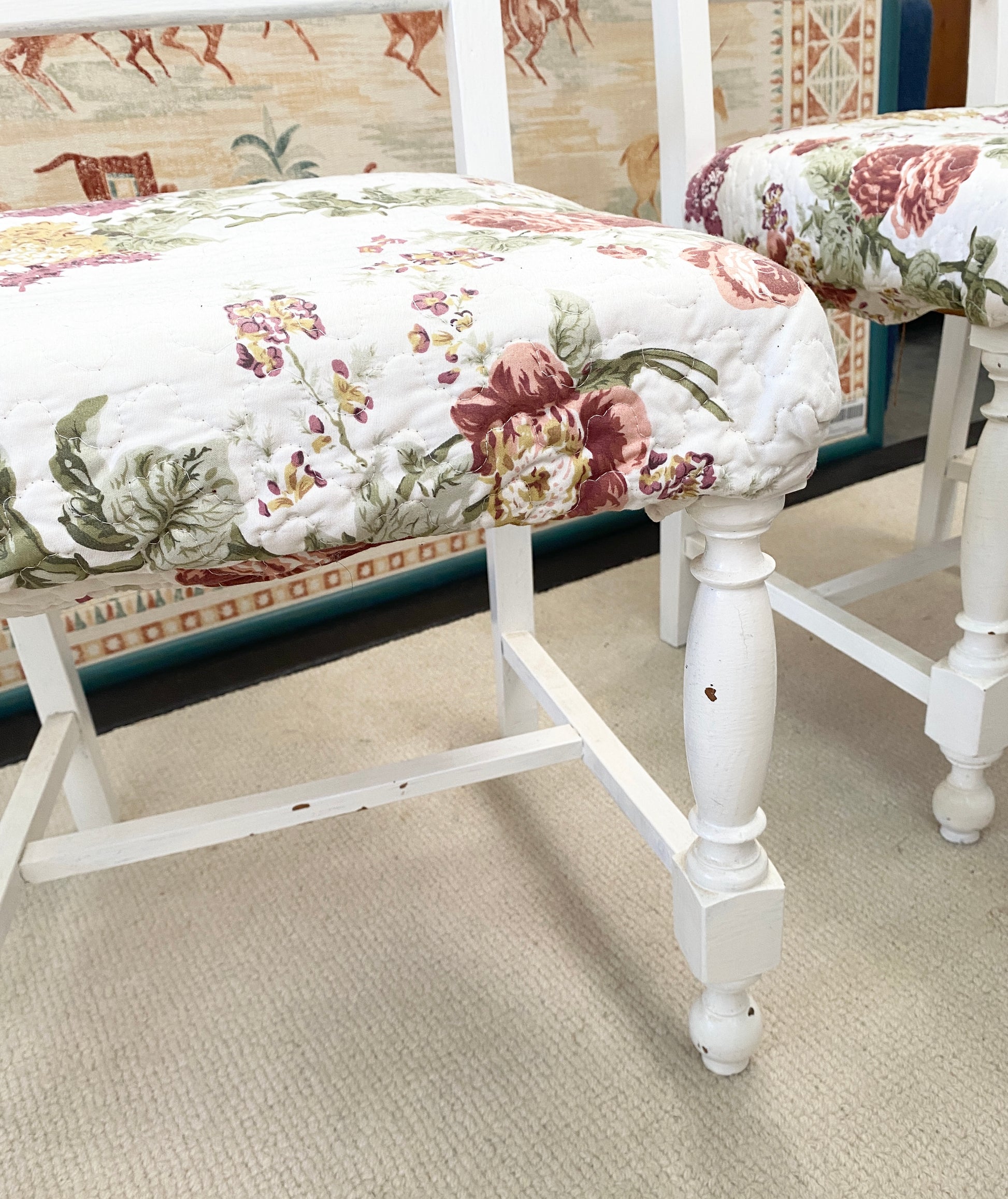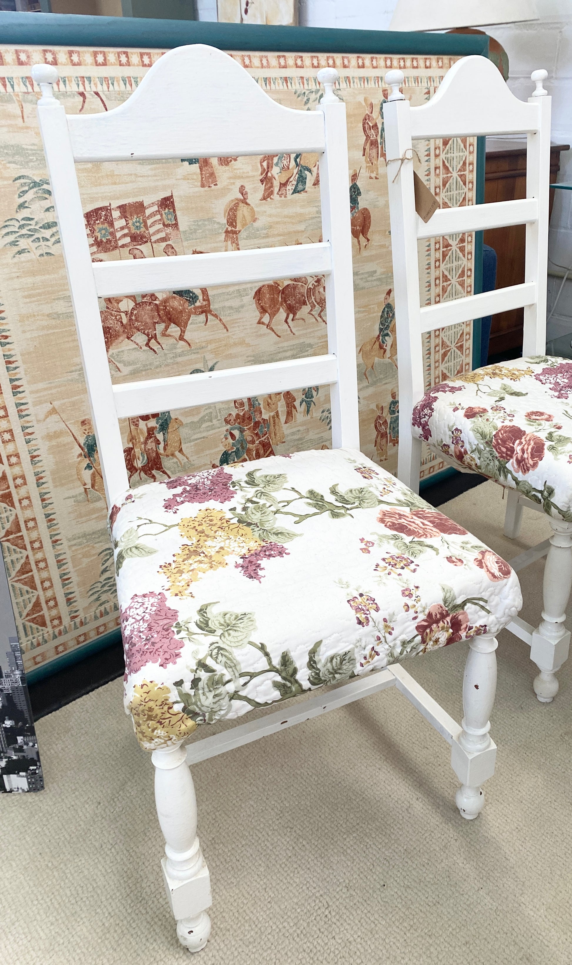 Cadeiras encantadoras em estilo vintage com assentos estofados com estampados florais e estrutura clássica branca. Perfeitas como cadeiras de jantar ou de destaque, com um aspeto moderno e inspirado no estilo campestre.