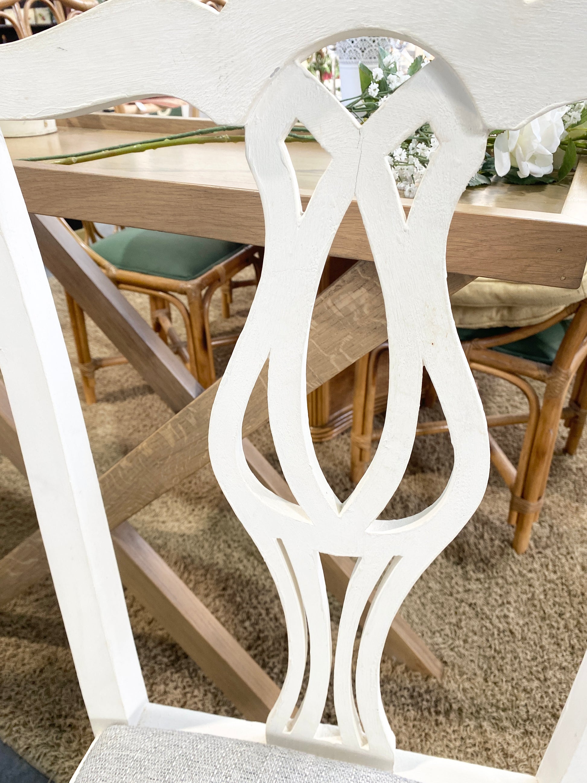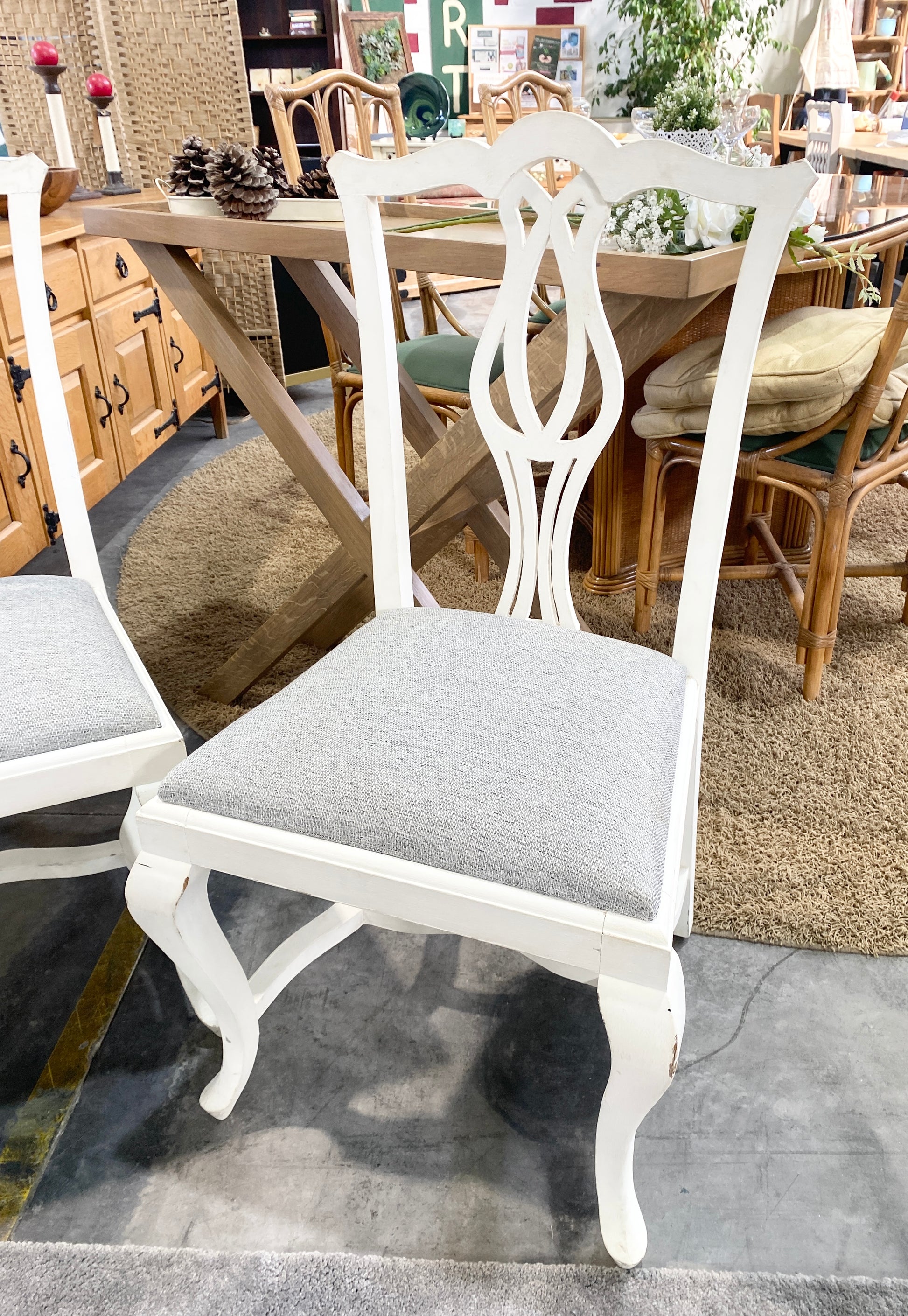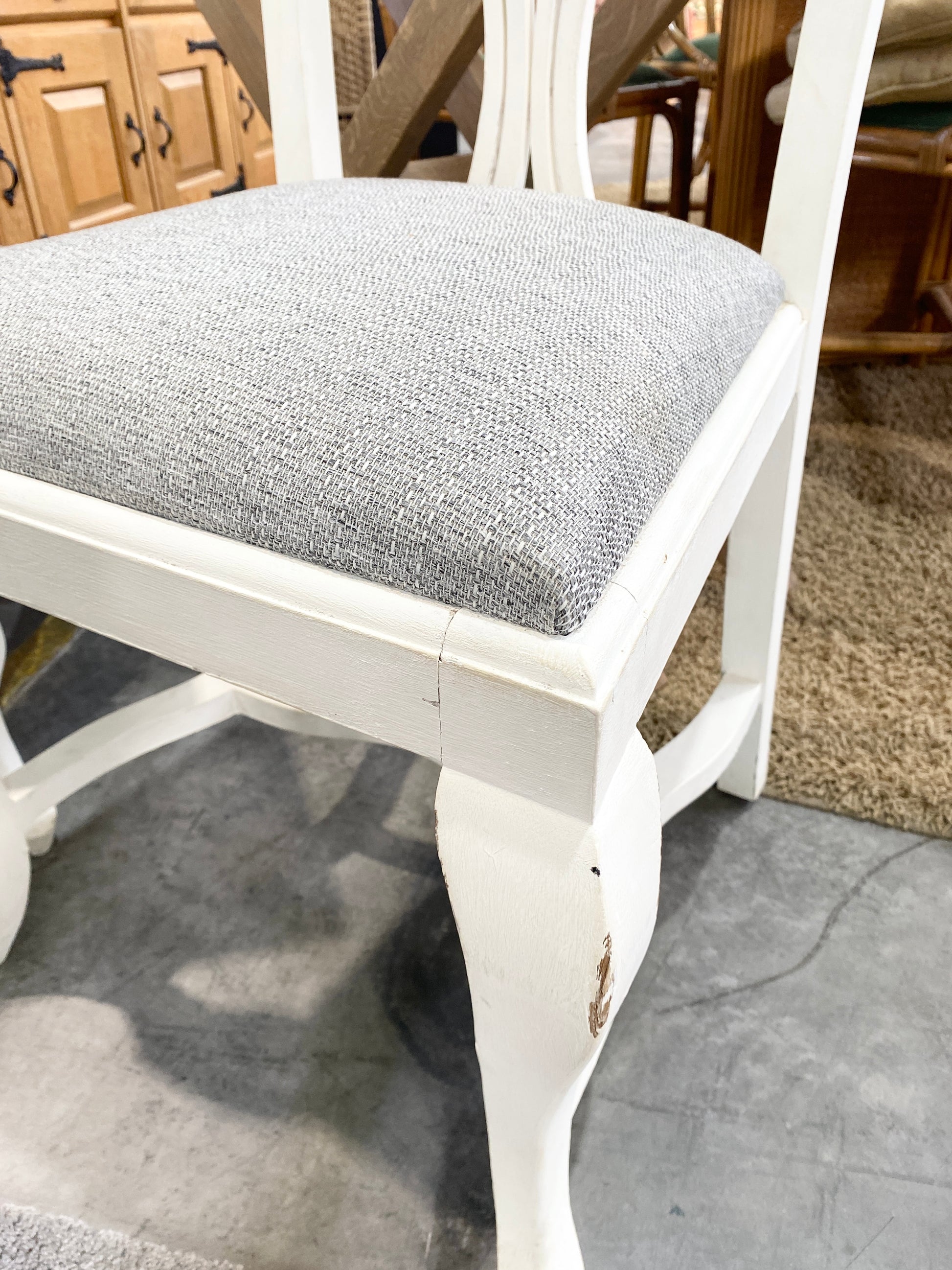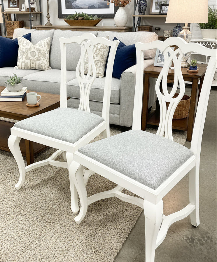 Uma charmosa cadeira de madeira branca com um confortável assento cinzento e um bonito encosto esculpido. Temos duas disponíveis.