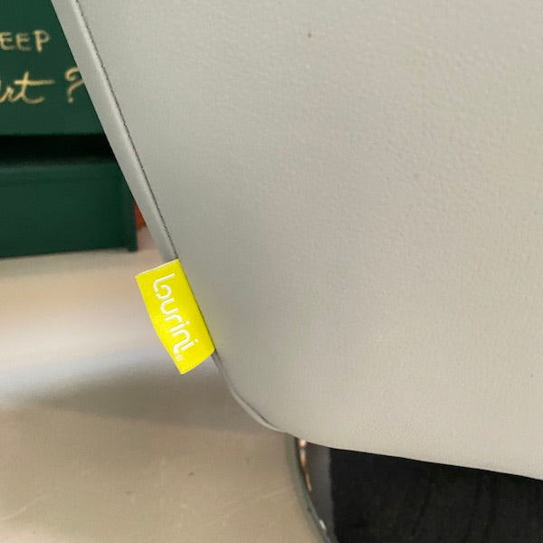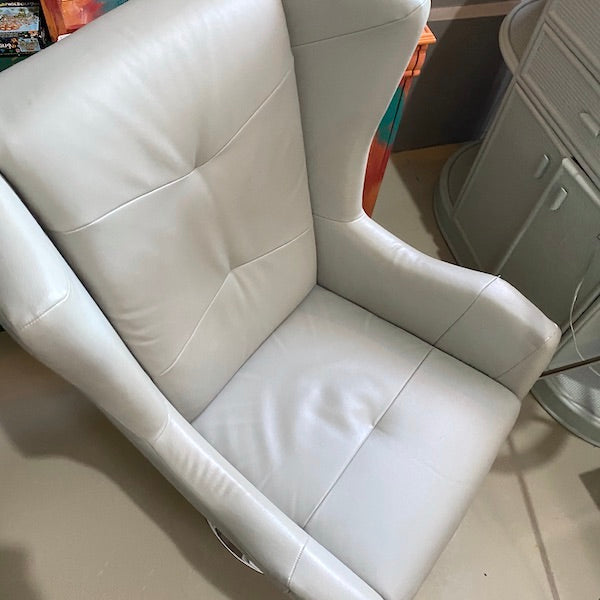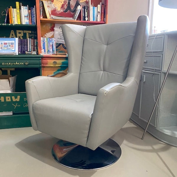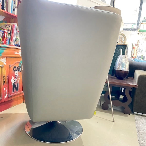Esta poltrona giratória contemporânea destaca-se com o seu encosto alto, laterais acolchoadas e braços acolchoados. Estofada em pele sintética cinzenta elegante e sobre uma base cromada polida, é perfeita para um canto de leitura, escritório ou sala de estar.