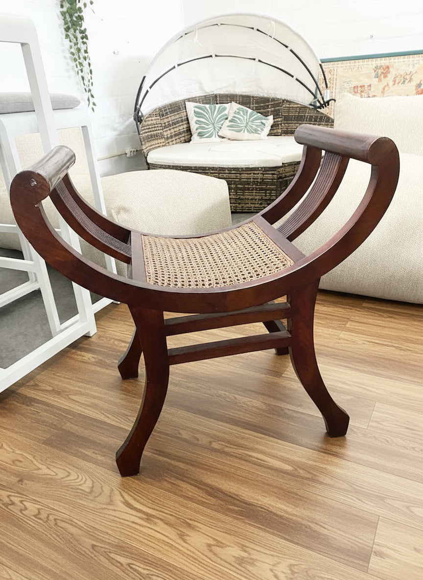 Conheça o seu novo lugar favorito para se sentar! Esta encantadora cadeira combina uma estrutura robusta de madeira escura com um assento de palhinha lindamente entrançado — a combinação perfeita entre estilo clássico e conforto aconchegante.