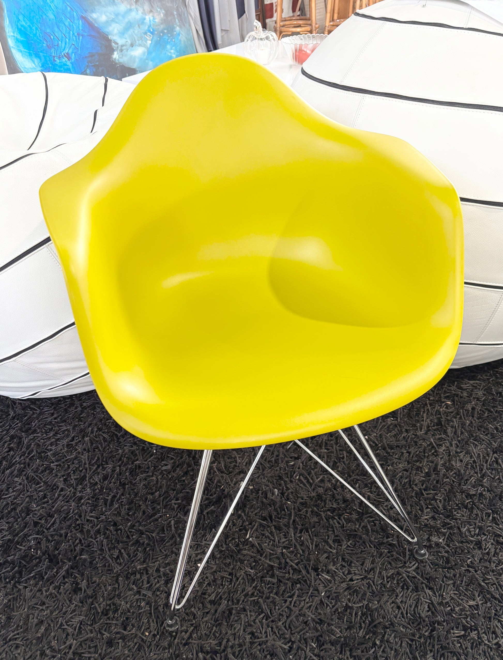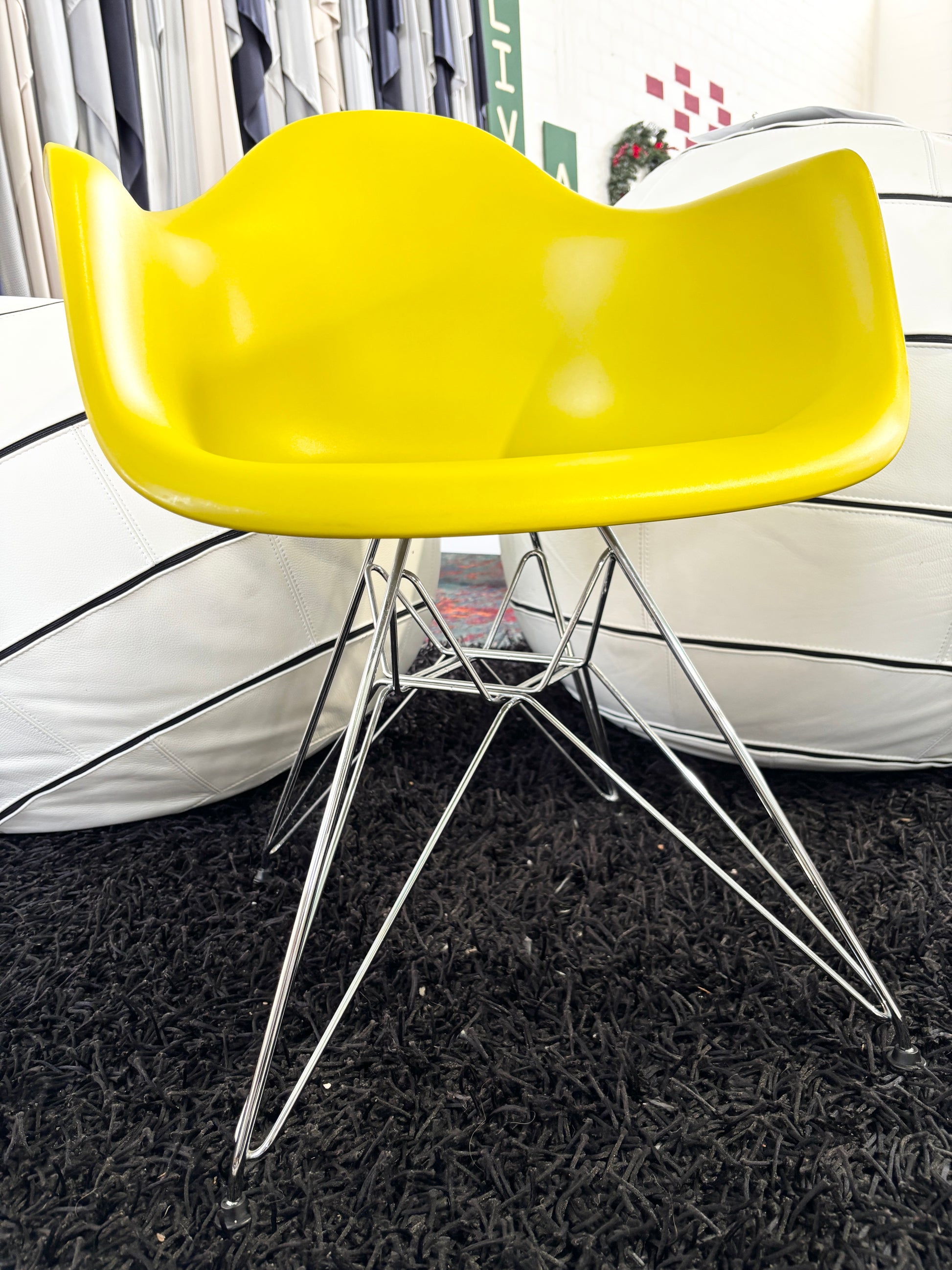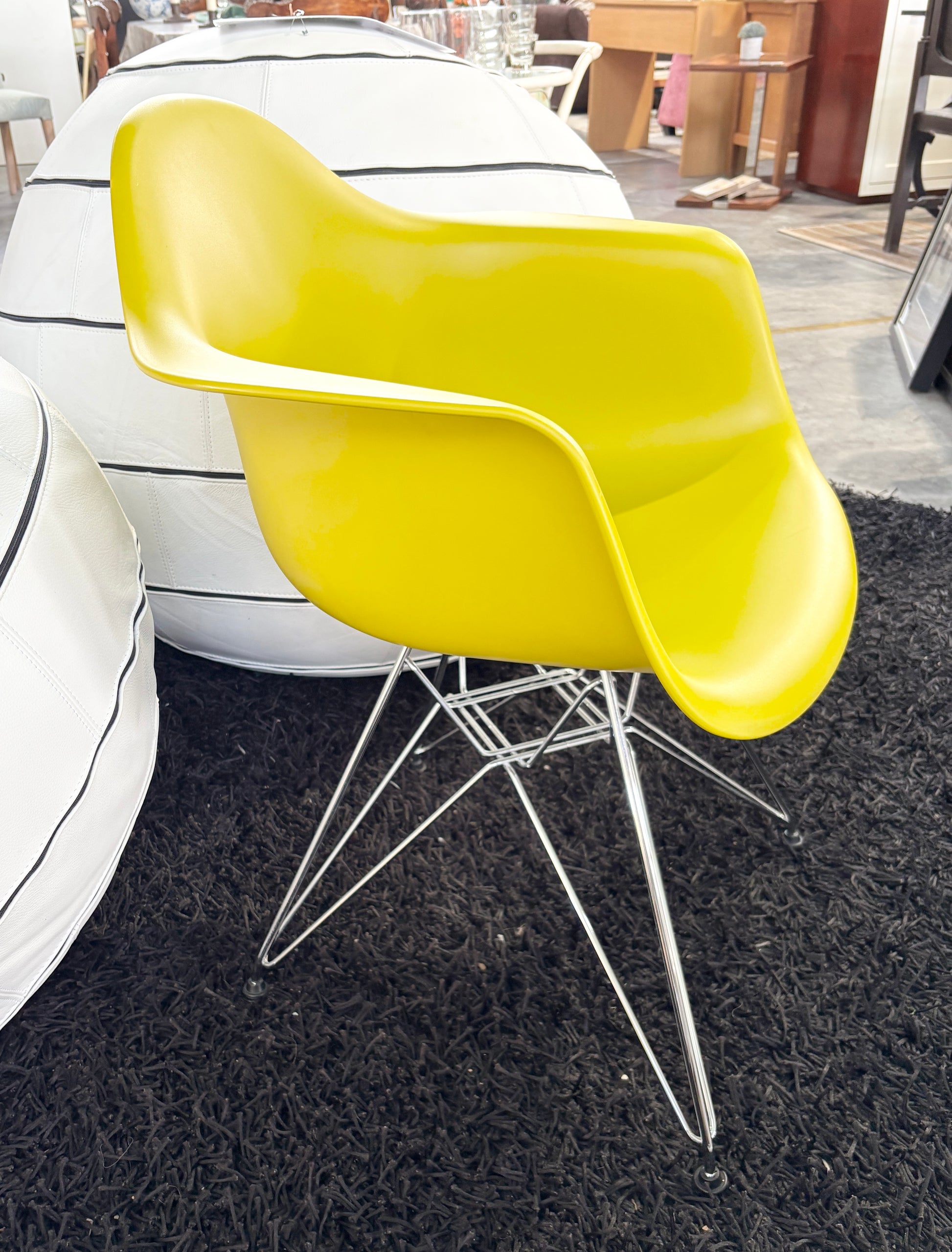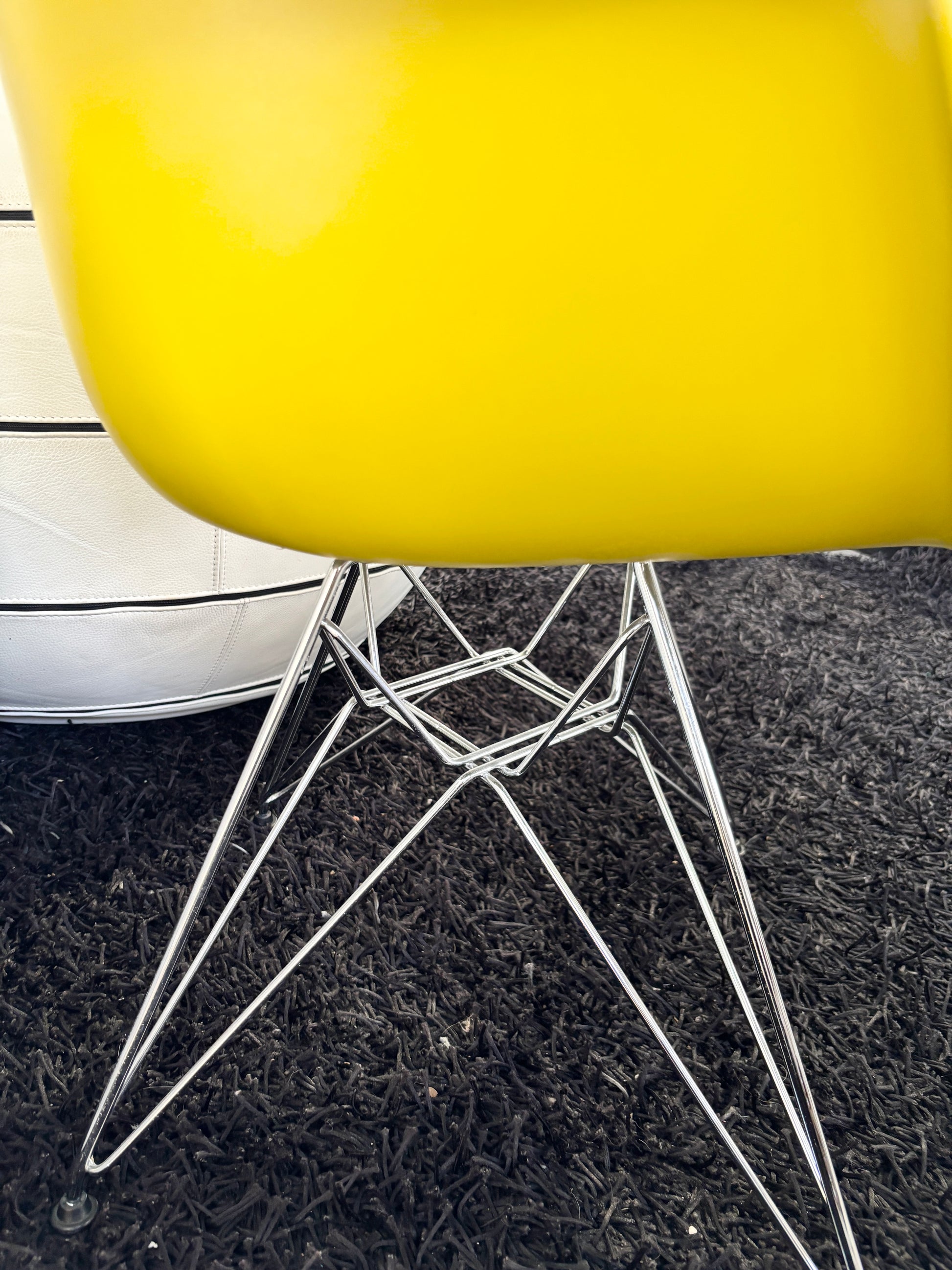 Esta é uma poltrona de plástico estilo Eames da Vitra, com uma base cromada em forma de "Torre Eiffel" e um assento em plástico amarelo.
