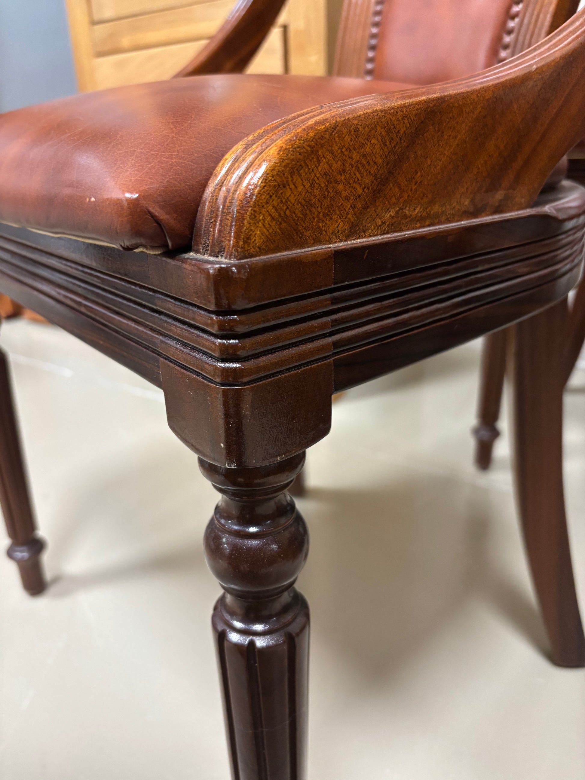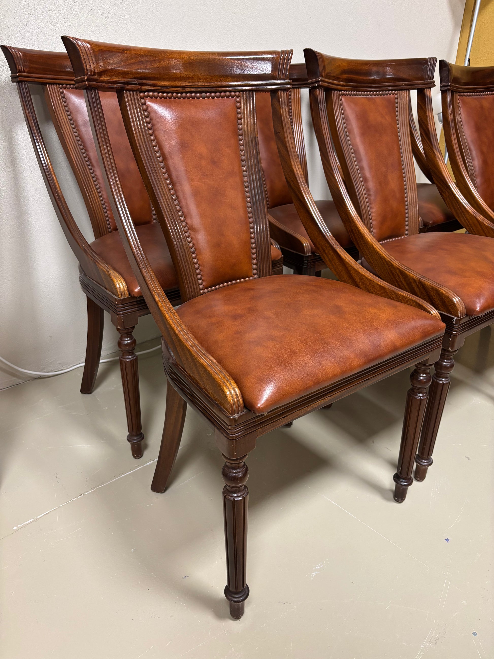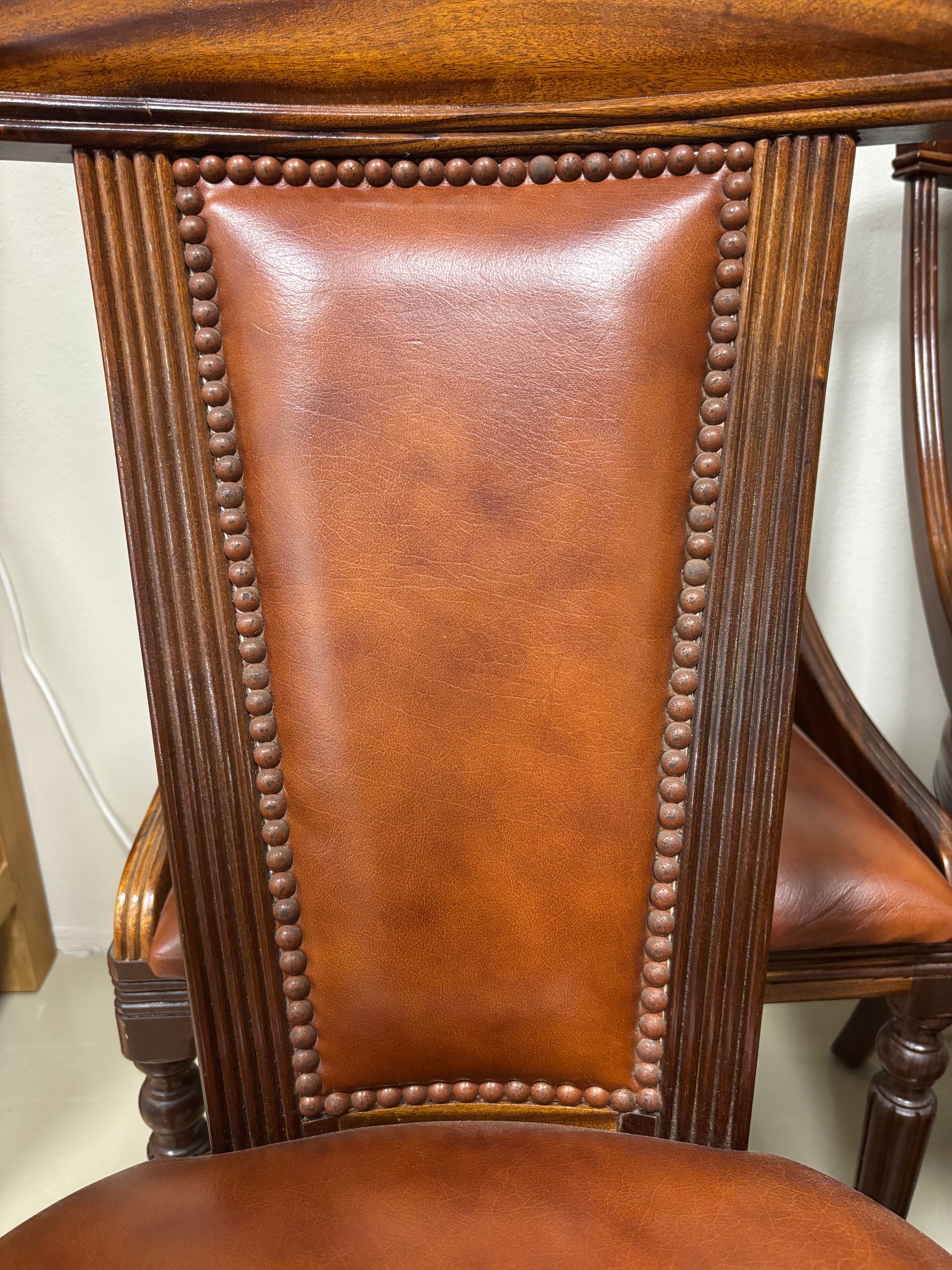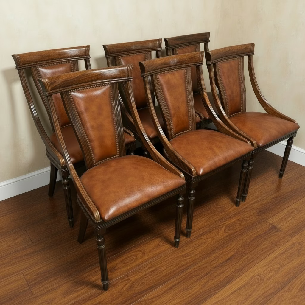 Conjunto de seis cadeiras de jantar clássicas em madeira com assentos acolchoados em pele, oferecendo um Uma melhoria grandiosa e confortável para qualquer sala de jantar.