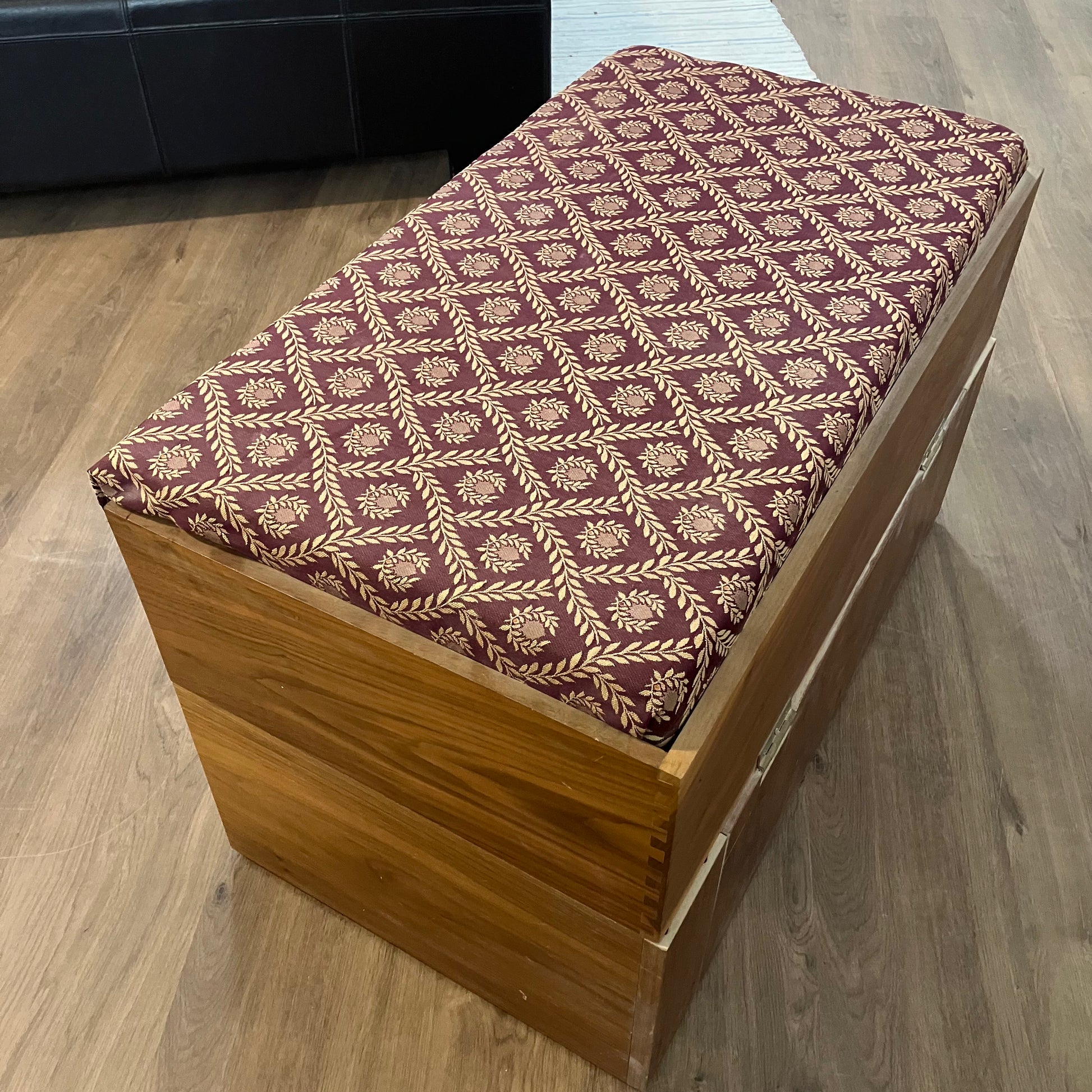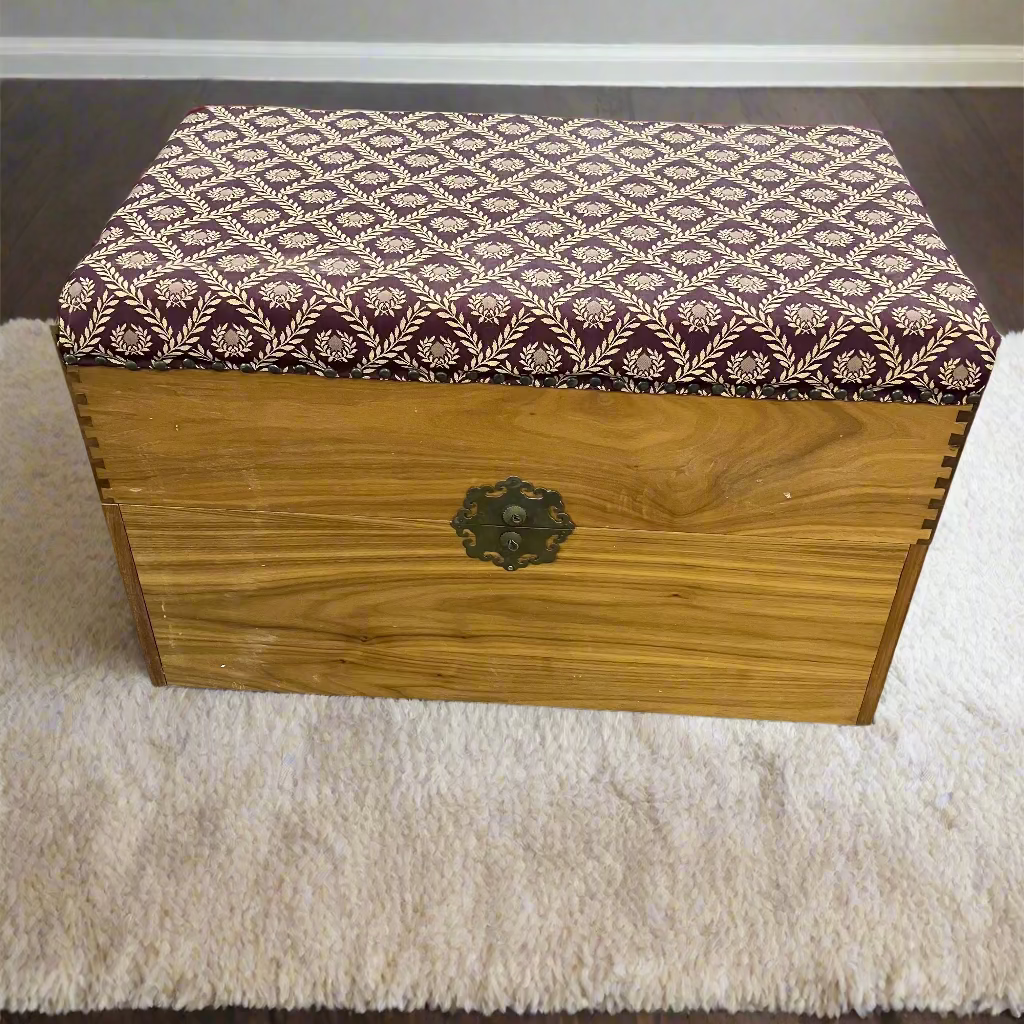 A versatile wooden storage chest featuring a patterned upholstered lid that doubles as a comfortable seat or bench. Perfect for use at the end of a bed, in an entryway, or as a blanket box in the living room. Its sturdy build and charming design provide both function and style.