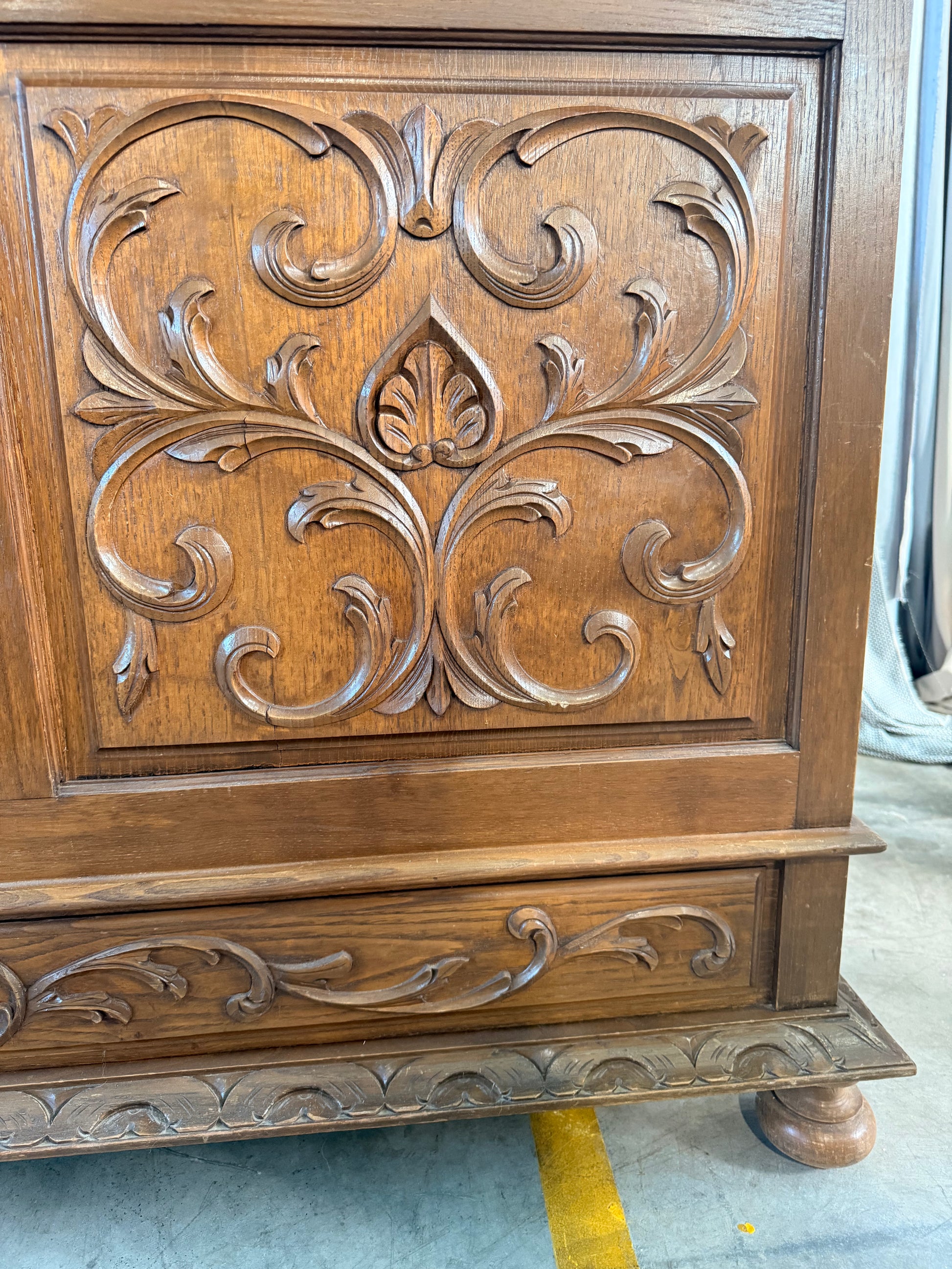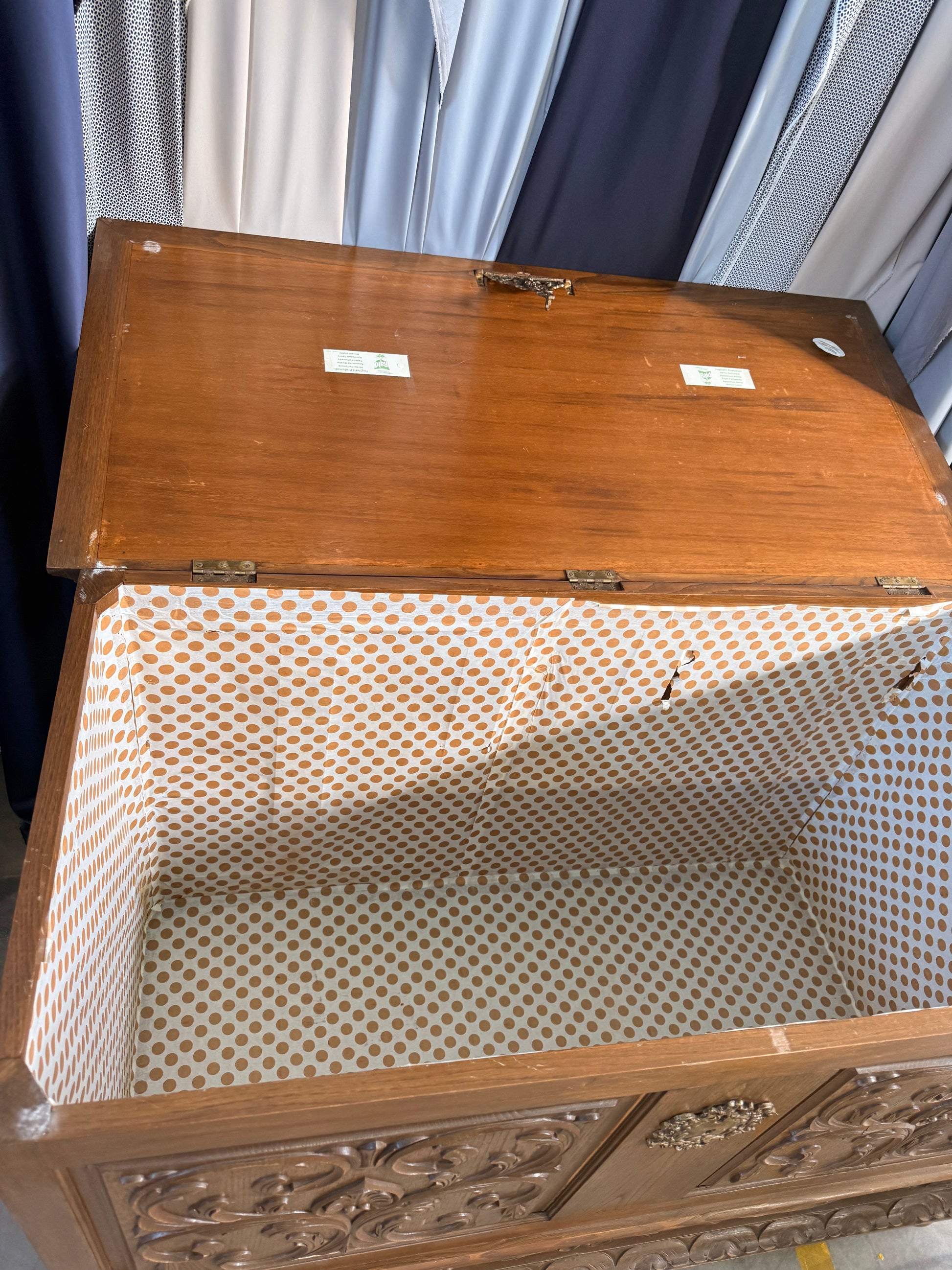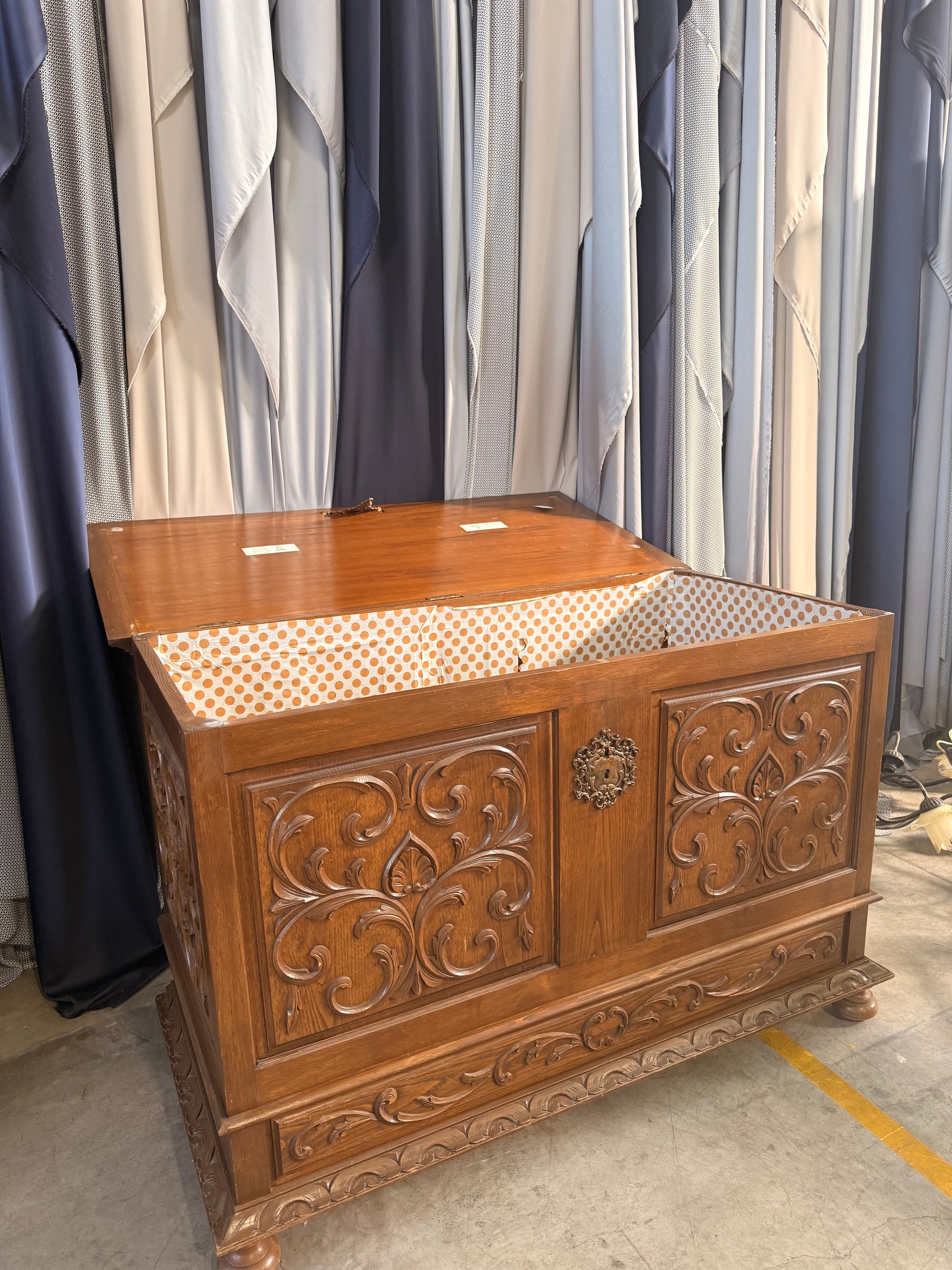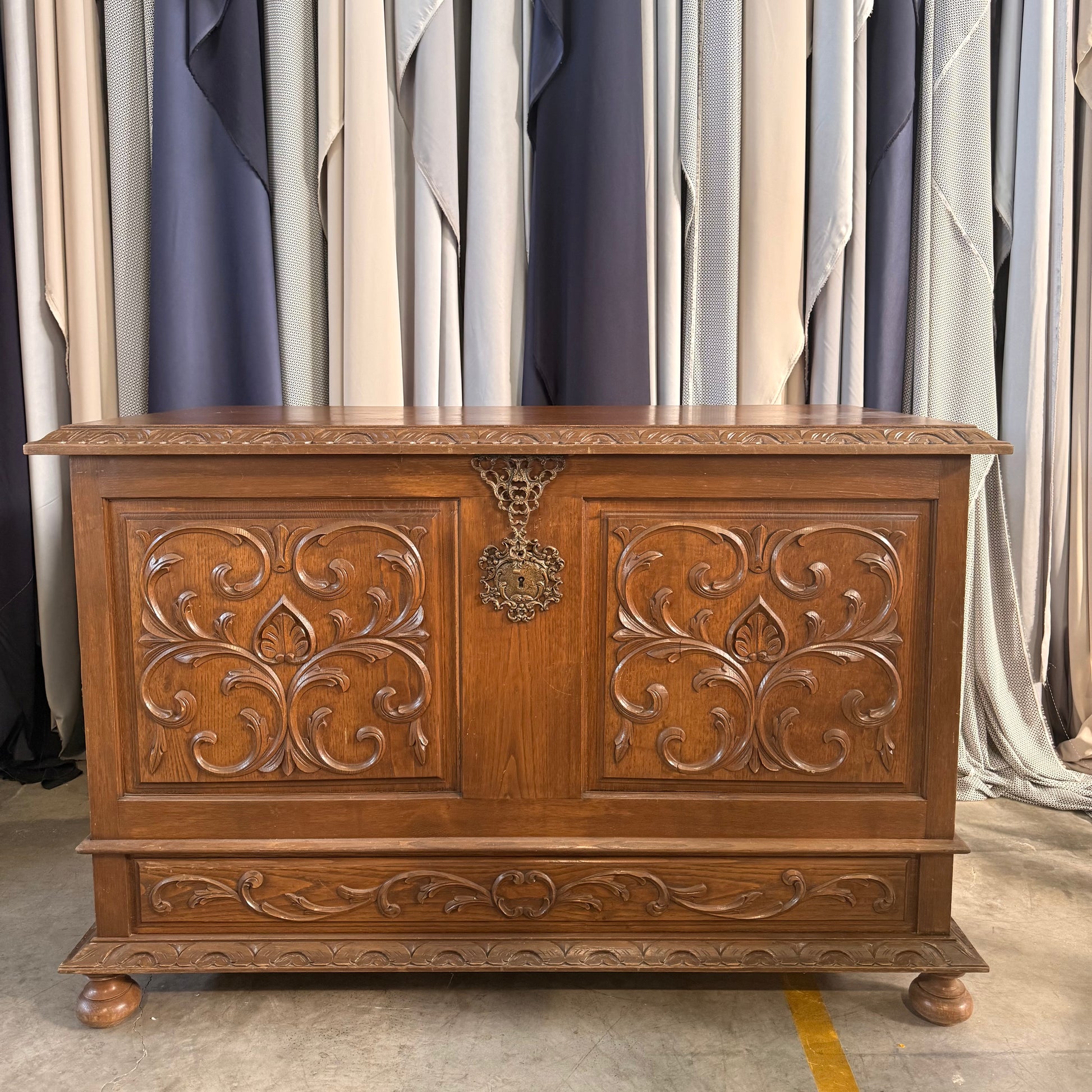 Baú de madeira lindamente esculpido à mão com intrincados arabescos e ferragens em estilo antigo. Perfeito para guardar roupa de cama ou como peça de destaque em qualquer ambiente tradicional ou com inspiração vintage.