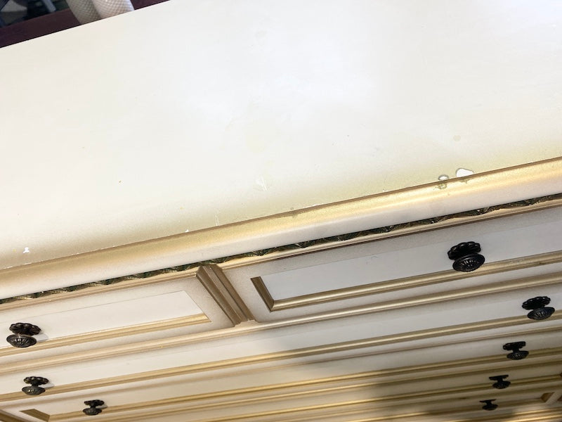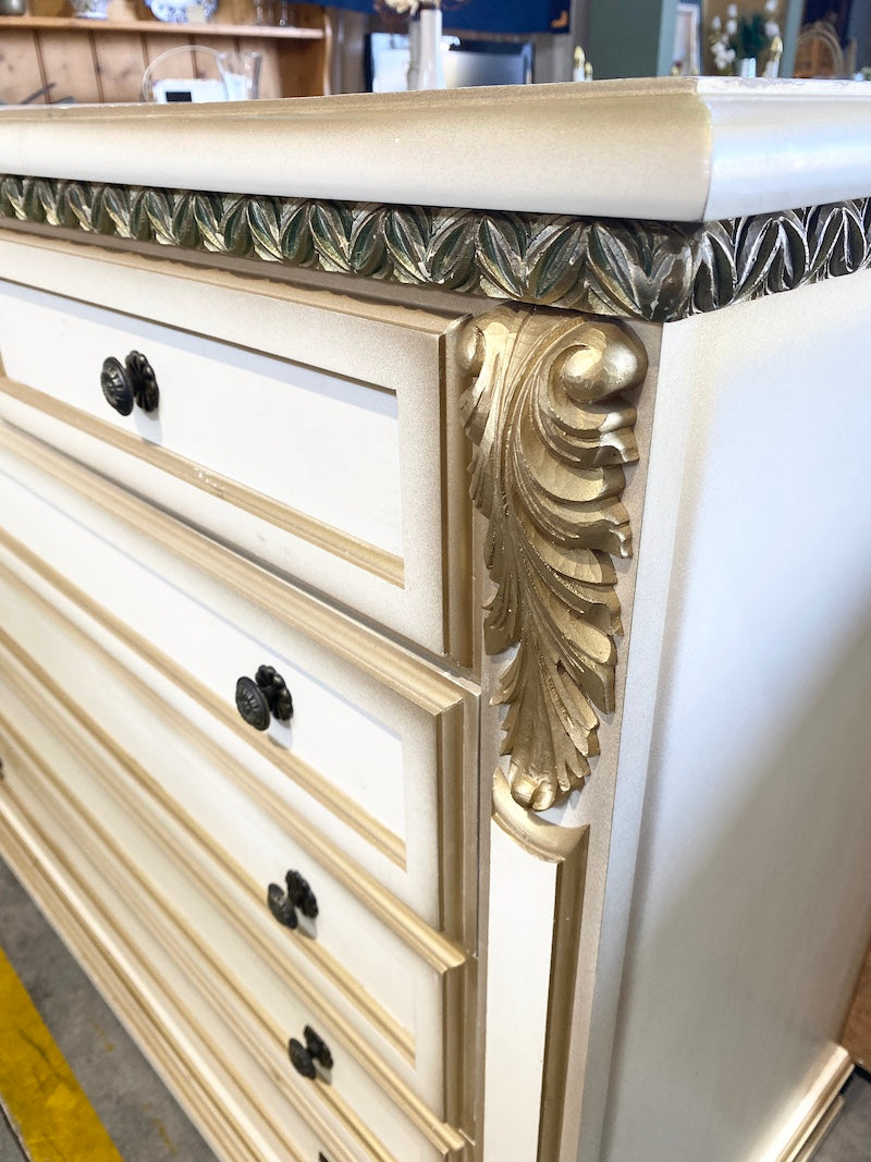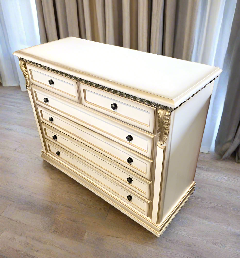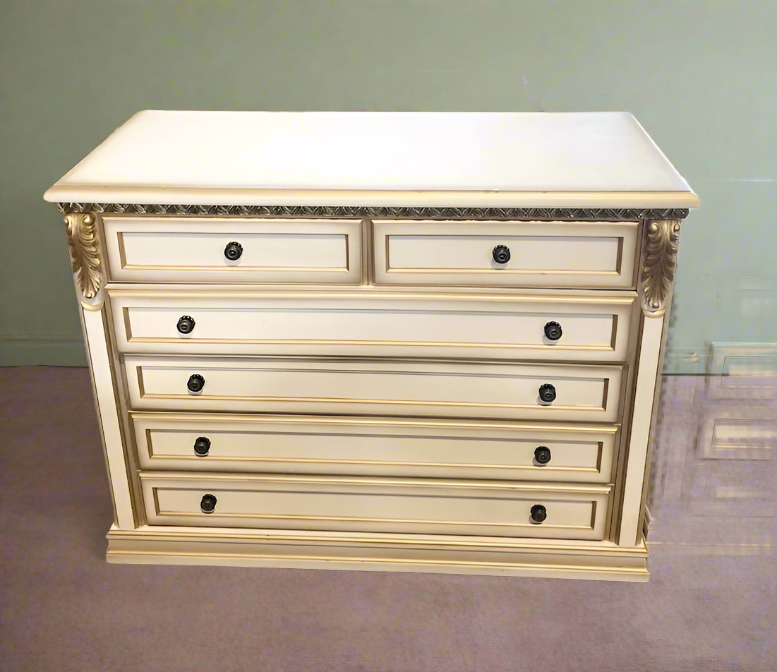 Eleve o seu ambiente com esta elegante cómoda na cor creme. Com seis gavetas, esta peça é subtilmente adornada com detalhes clássicos esculpidos, pintados em tons de dourado e verde, que acrescentam profundidade e personalidade. Existem alguns ligeiros sinais de desgaste; veja as fotos.
