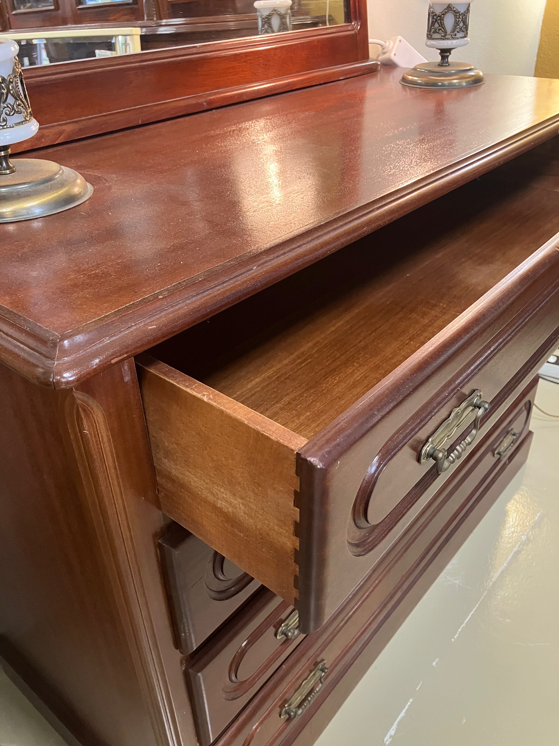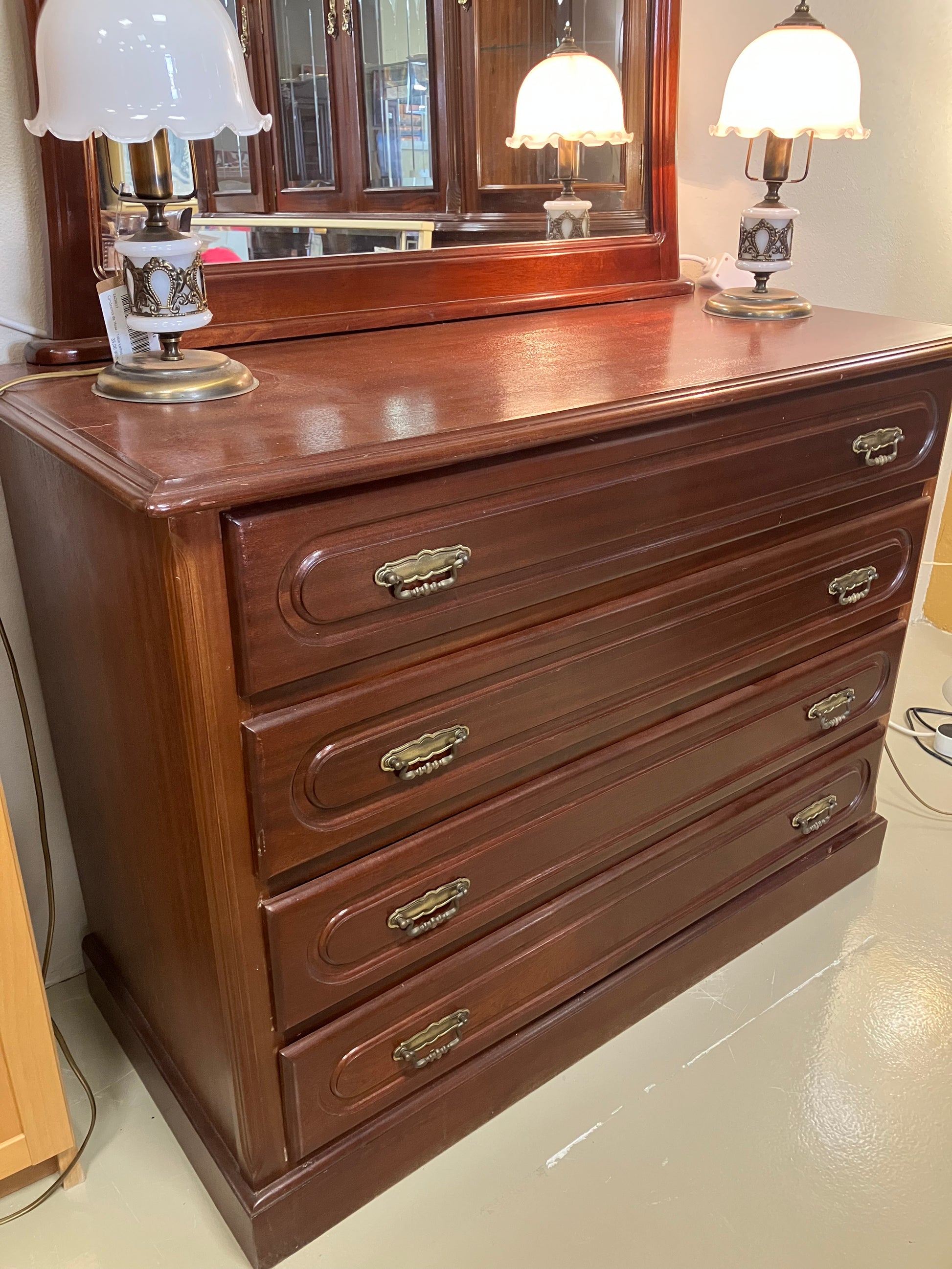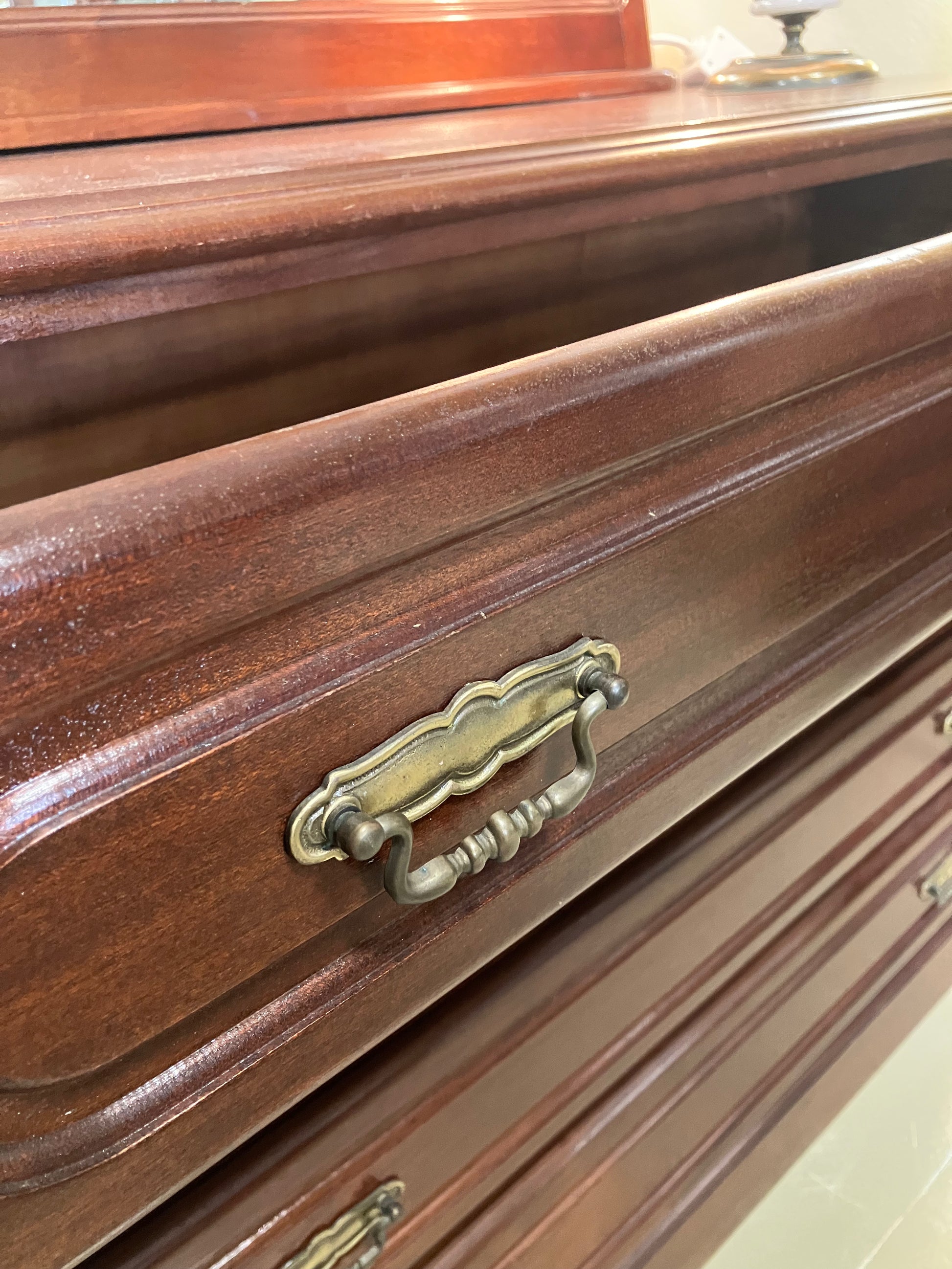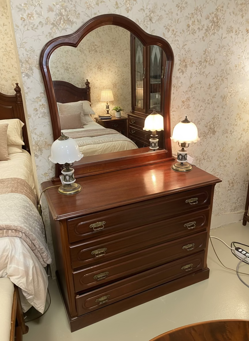 Cómoda clássica em madeira com quatro gavetas e espelho embutido com bordas curvas suaves. Ideal para quarto ou closet.
